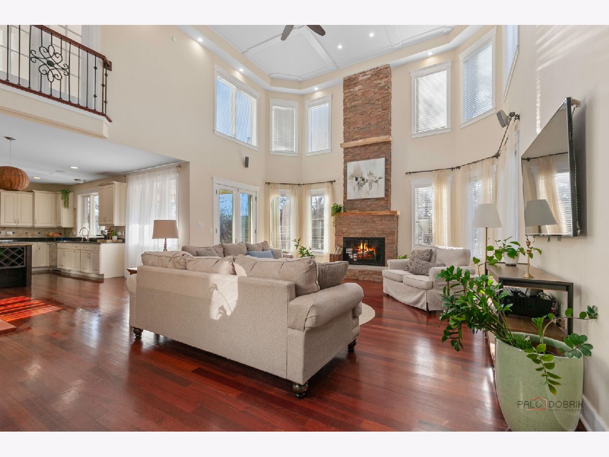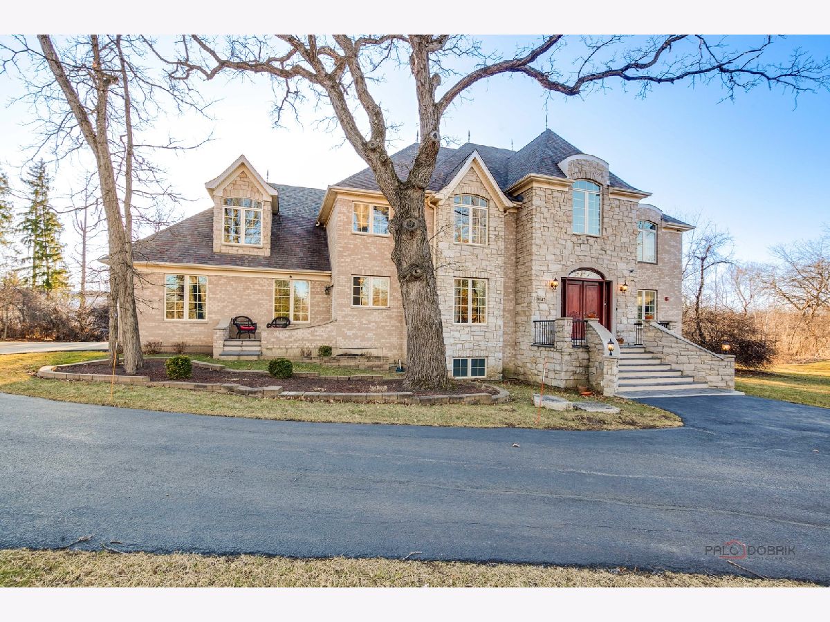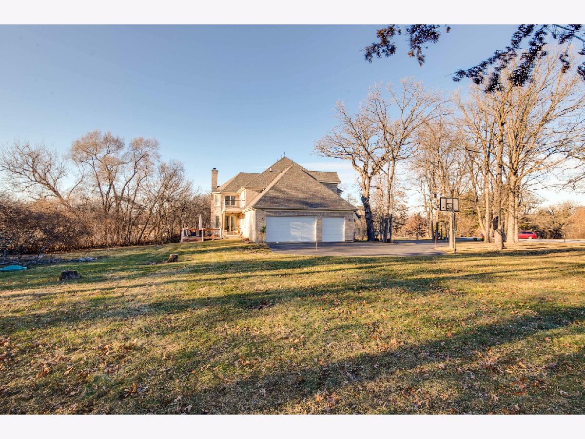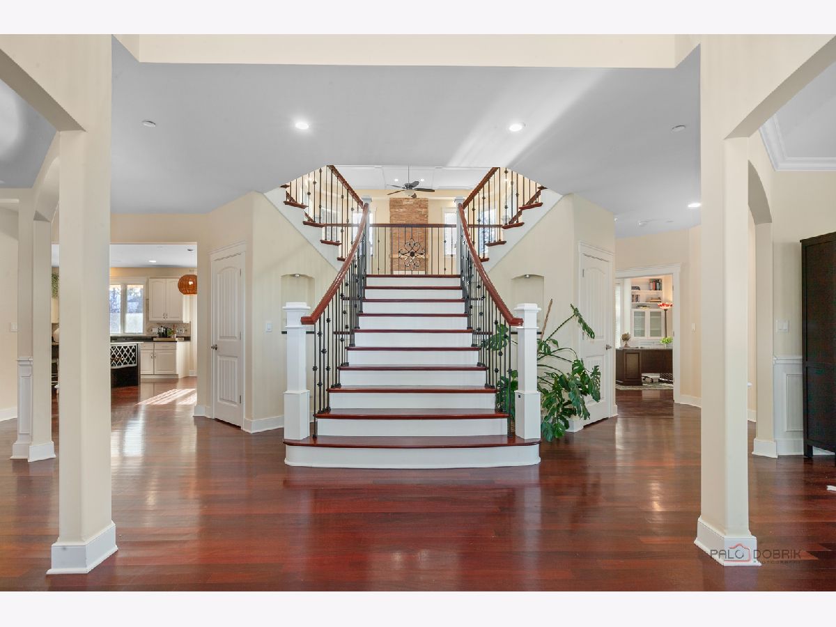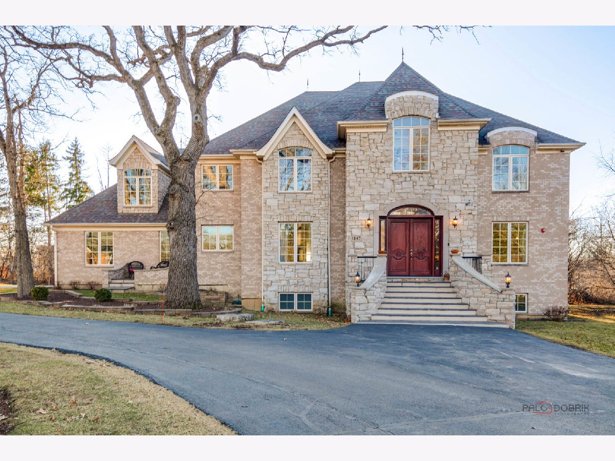 Nestled within the prestigious Grove Country Club community and just minutes from charming downtown Long Grove, this 5400+sqft stunning four-bedroom, four-bath home offers luxury, space, and architectural grandeur throughout. This exquisite 2015-built home is set on a private 1.2-acre lot enjoying picturesque golf course views along the 10th hole at Grove Country Club. Located in highly acclaimed District 96 and Stevenson High School District 125, this home combines elegance with top-tier education. A grand entrance welcomes you with a breathtaking butterfly staircase in the foyer, setting the tone for the elegance that unfolds inside. Rich Brazilian cherry hardwood flooring throughout the main level immediately sets a tone of refined luxury. The sunlit living and dining rooms are beautifully illuminated by the morning light, creating a warm and inviting start to the day. By evening, they transform into an ideal setting for entertaining, complete with easy access to a well-appointed wet bar. At the heart of the home, the dramatic two-story family room showcases a floor-to-ceiling stone fireplace and exterior access, creating an impressive and inviting gathering space. The chef's kitchen is designed to impress, featuring high-end stainless-steel appliances, a large paneled refrigerator, a massive island with breakfast bar seating, granite countertops, and a walk-in pantry. A main-level study with custom shelving and a full bath is ideal for office/guests. The large laundry/mud room offers exterior access to the east-facing side patio, where you will find yourselves enjoying a morning coffee or a yoga session. Upstairs, the luxurious primary suite includes a Juliet balcony overlooking the family room, a private outdoor balcony, and a bonus room ideal for an office, exercise space, or theater. The spa-inspired ensuite bath features a full-body spray, steam shower, dual vanities, soaking tub, and heated floors. The second bedroom offers a private ensuite bath and a walk-in closet, complemented by a charming loft-ideal for a cozy reading nook or creative retreat. Two additional bedrooms have their own walk-in closets, with one featuring its own fun loft space, perfect for kids or a personalized hideaway. A full unfinished basement provides endless possibilities for future expansion. Wood framing, insulation, and electrical work are already completed in the basement with rough-in plumbing for a bathroom. Outside, enjoy a large backyard with a spacious deck, ideal for entertaining or relaxing in a serene setting. This exceptional home offers refined living in one of the area's most sought-after communities.