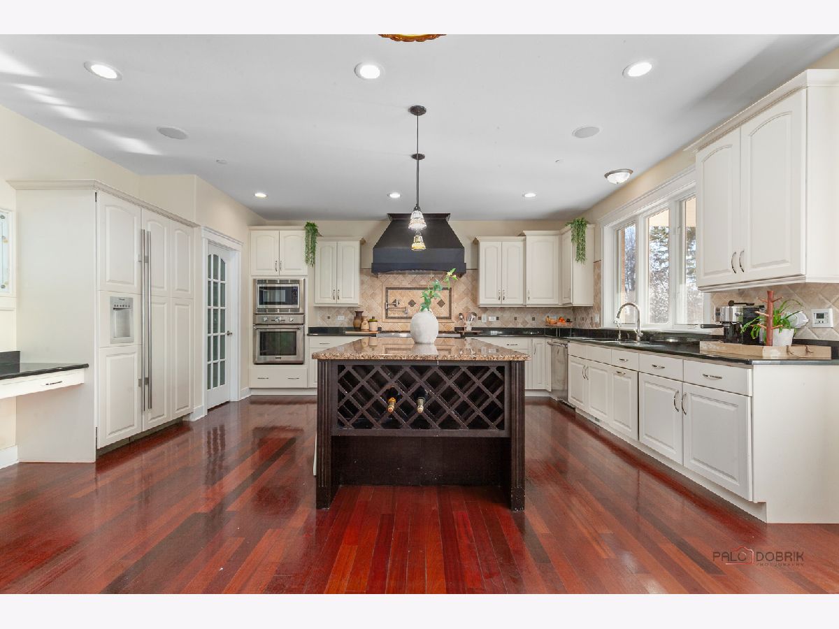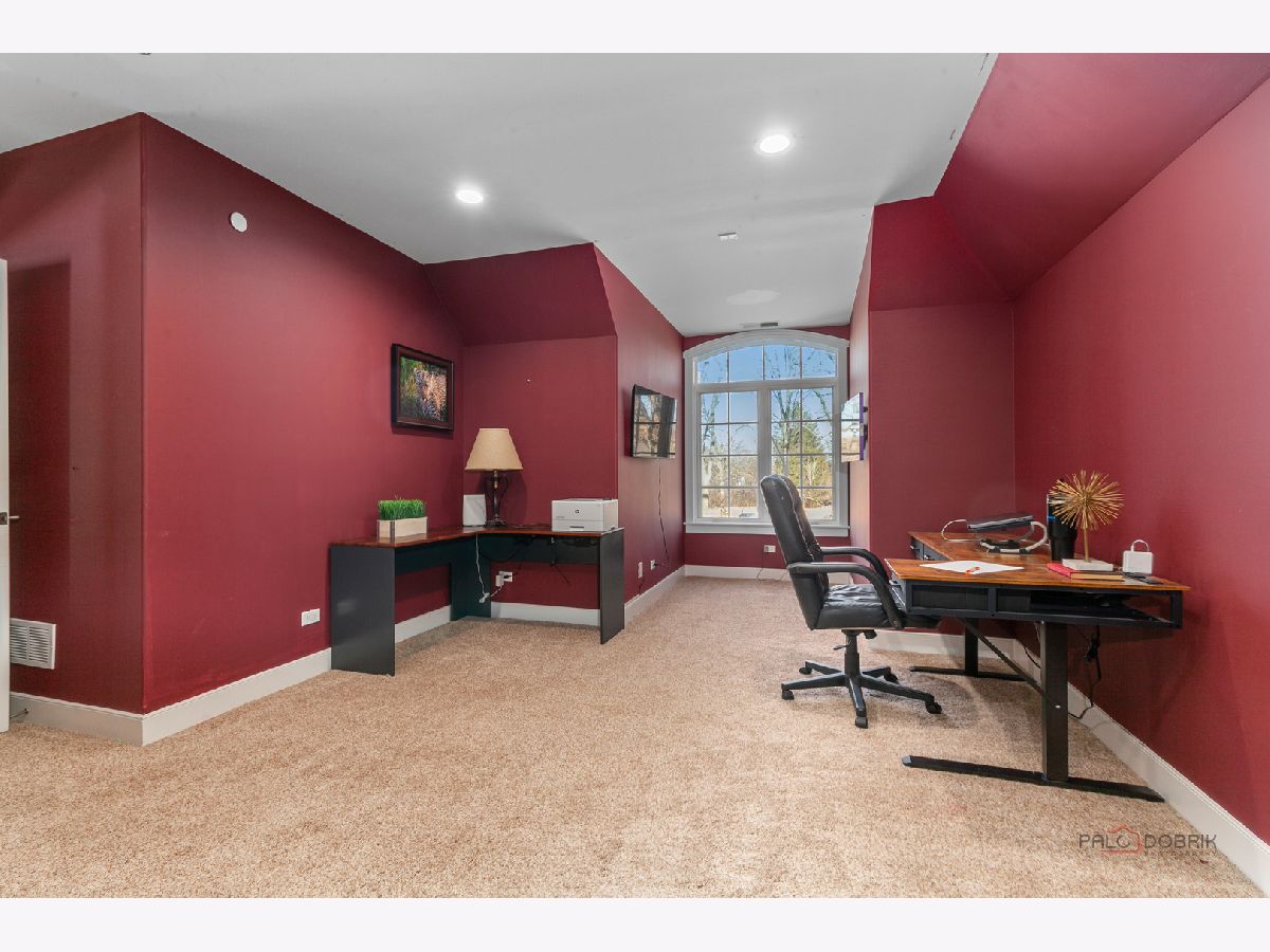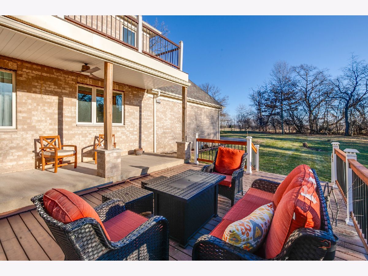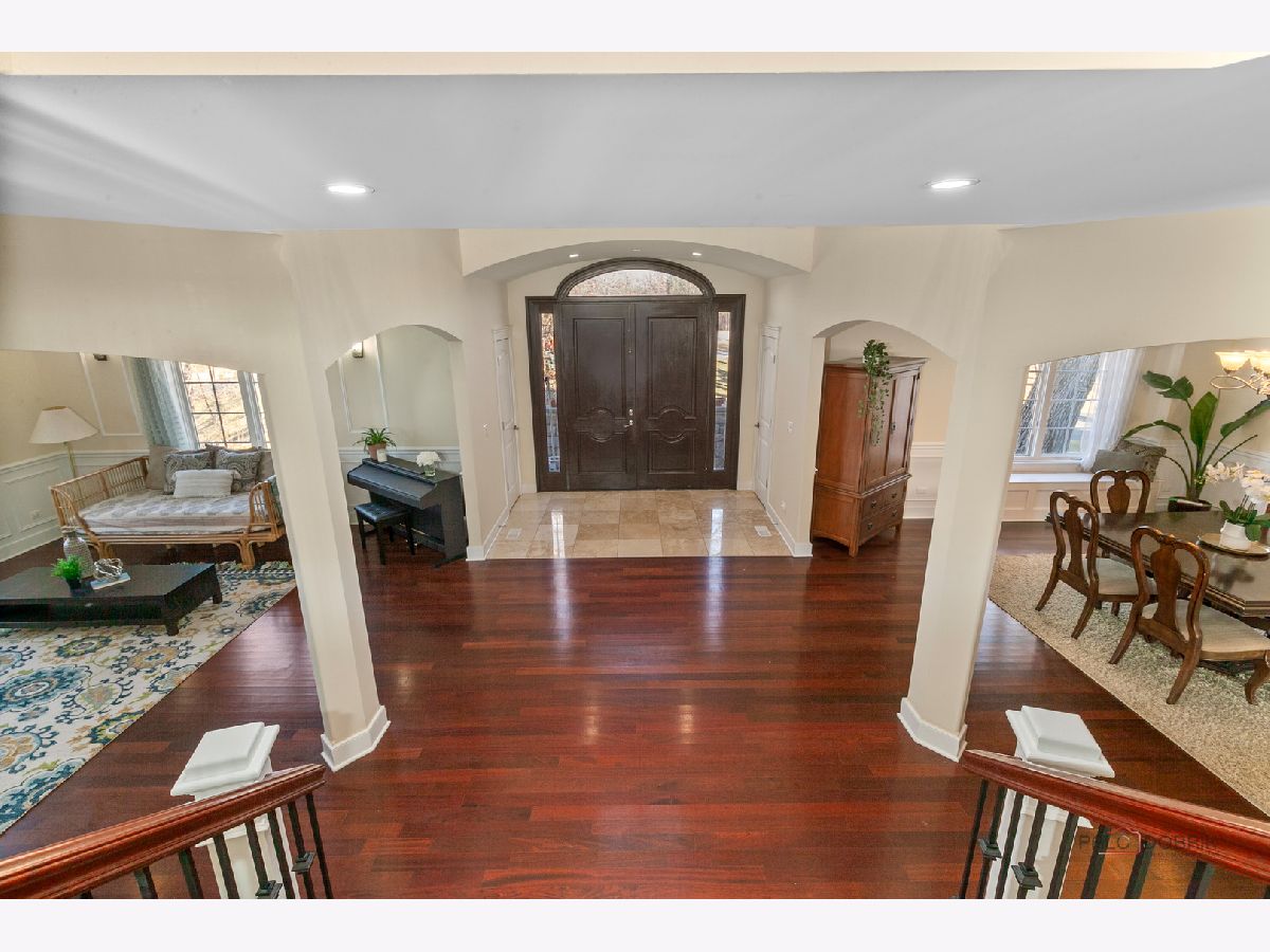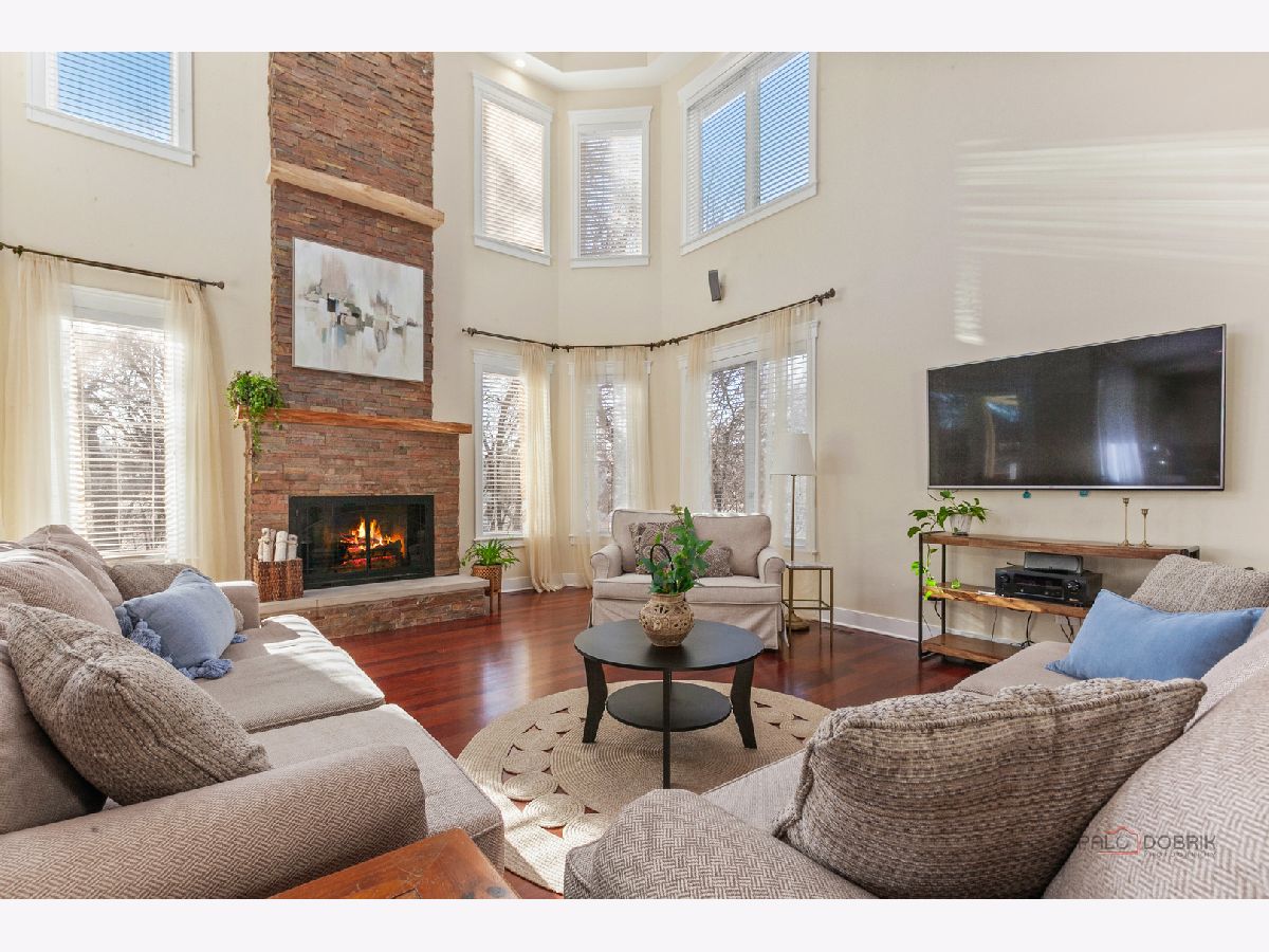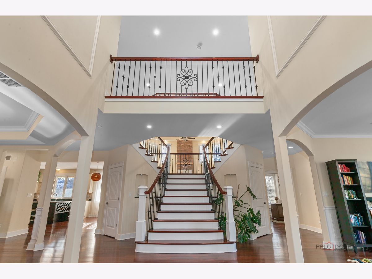 Nestled within the prestigious Grove Country Club community and just minutes from charming downtown Long Grove, this 5400+sqft stunning four-bedroom, four-bath home offers luxury, space, and architectural grandeur throughout. This exquisite 2015-built home is set on a private 1.2-acre lot enjoying picturesque golf course views along the 10th hole at Grove Country Club. Located in highly acclaimed District 96 and Stevenson High School District 125, this home combines elegance with top-tier education. A grand entrance welcomes you with a breathtaking butterfly staircase in the foyer, setting the tone for the elegance that unfolds inside. Rich Brazilian cherry hardwood flooring throughout the main level immediately sets a tone of refined luxury. The sunlit living and dining rooms are beautifully illuminated by the morning light, creating a warm and inviting start to the day. By evening, they transform into an ideal setting for entertaining, complete with easy access to a well-appointed wet bar. At the heart of the home, the dramatic two-story family room showcases a floor-to-ceiling stone fireplace and exterior access, creating an impressive and inviting gathering space. The chef's kitchen is designed to impress, featuring high-end stainless-steel appliances, a large paneled refrigerator, a massive island with breakfast bar seating, granite countertops, and a walk-in pantry. A main-level study with custom shelving and a full bath is ideal for office/guests. The large laundry/mud room offers exterior access to the east-facing side patio, where you will find yourselves enjoying a morning coffee or a yoga session. Upstairs, the luxurious primary suite includes a Juliet balcony overlooking the family room, a private outdoor balcony, and a bonus room ideal for an office, exercise space, or theater. The spa-inspired ensuite bath features a full-body spray, steam shower, dual vanities, soaking tub, and heated floors. The second bedroom offers a private ensuite bath and a walk-in closet, complemented by a charming loft-ideal for a cozy reading nook or creative retreat. Two additional bedrooms have their own walk-in closets, with one featuring its own fun loft space, perfect for kids or a personalized hideaway. A full unfinished basement provides endless possibilities for future expansion. Wood framing, insulation, and electrical work are already completed in the basement with rough-in plumbing for a bathroom. Outside, enjoy a large backyard with a spacious deck, ideal for entertaining or relaxing in a serene setting. This exceptional home offers refined living in one of the area's most sought-after communities.