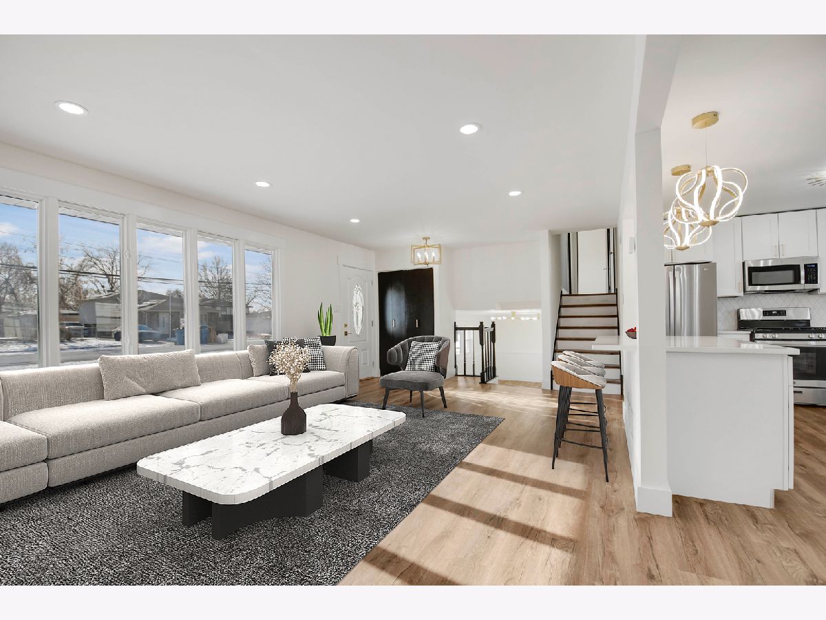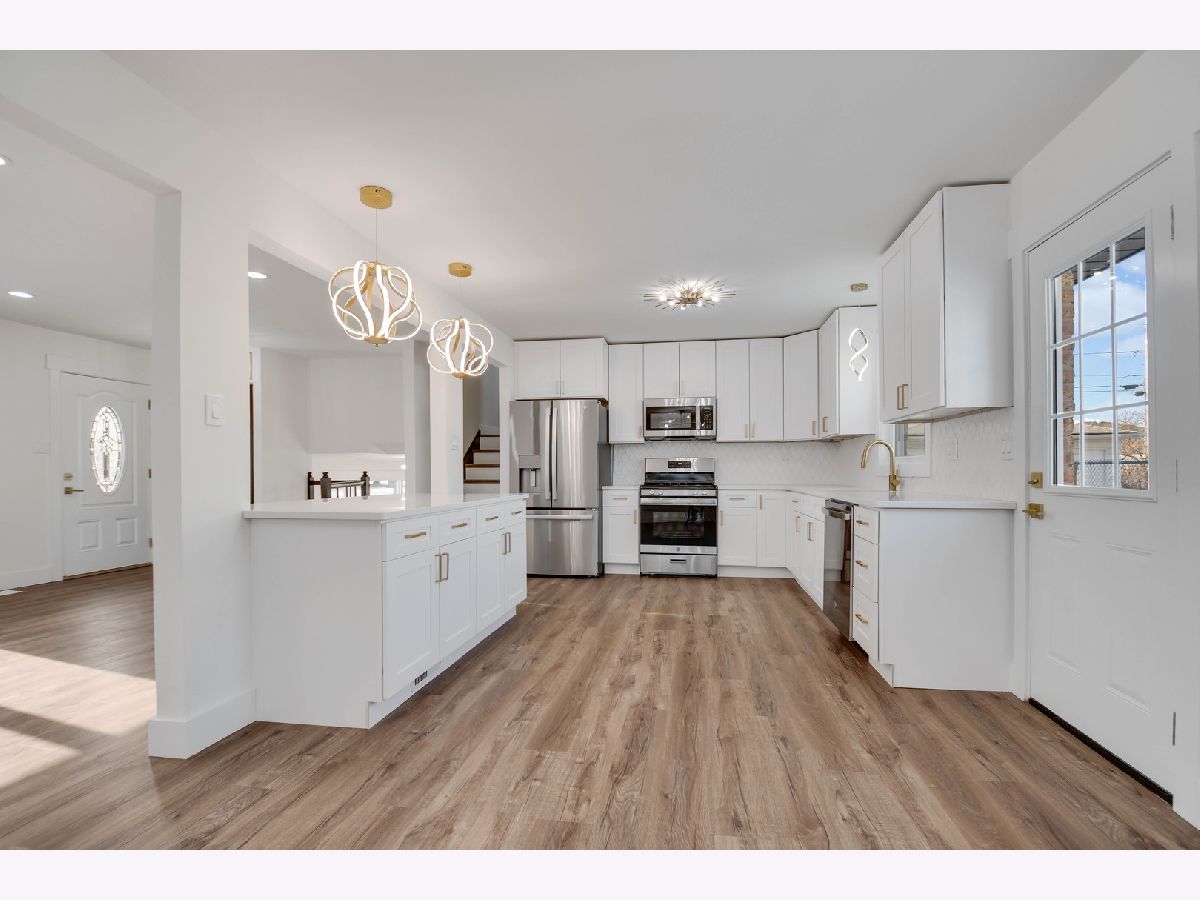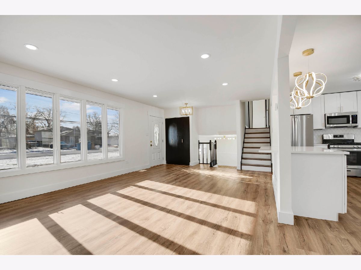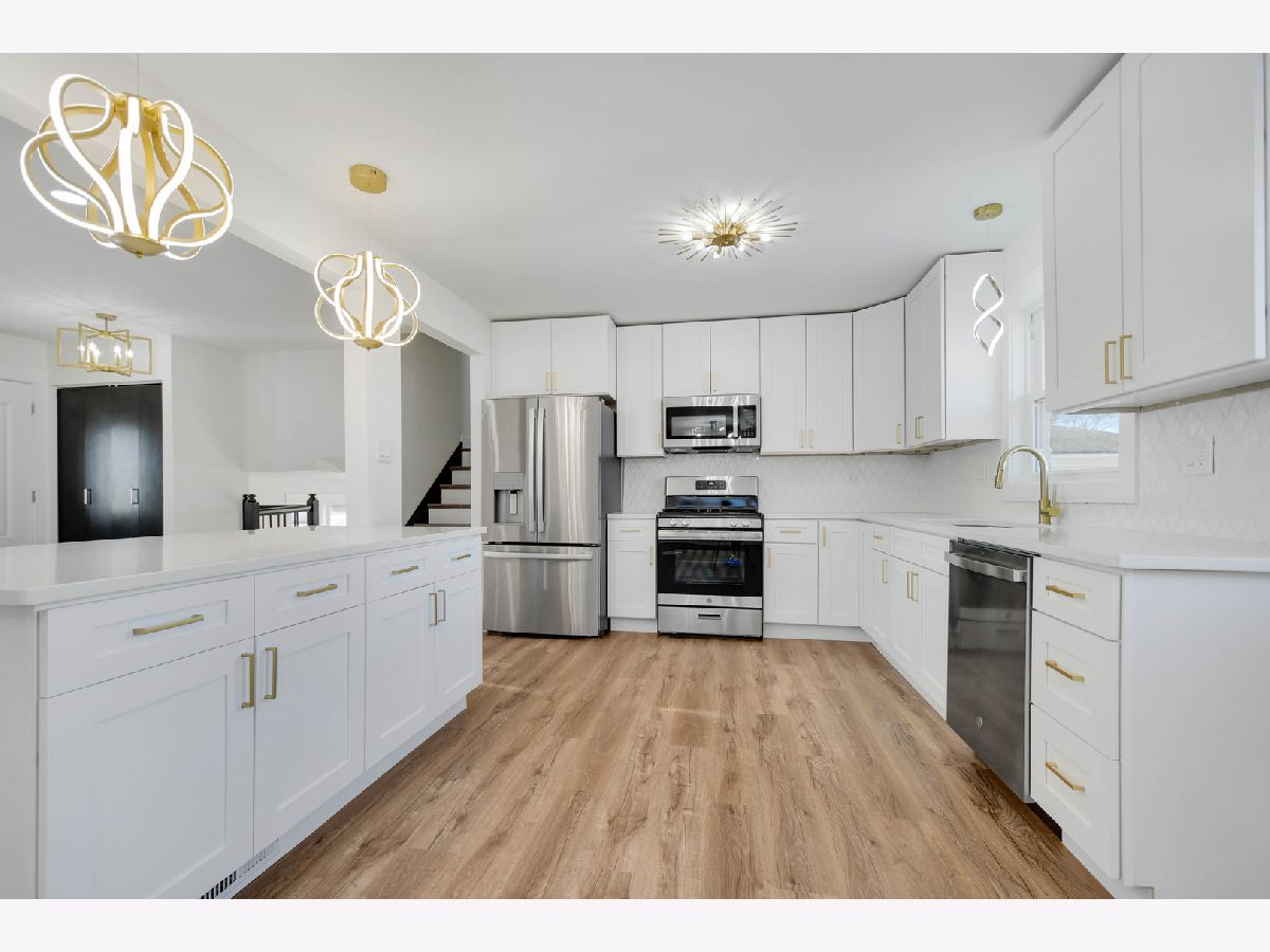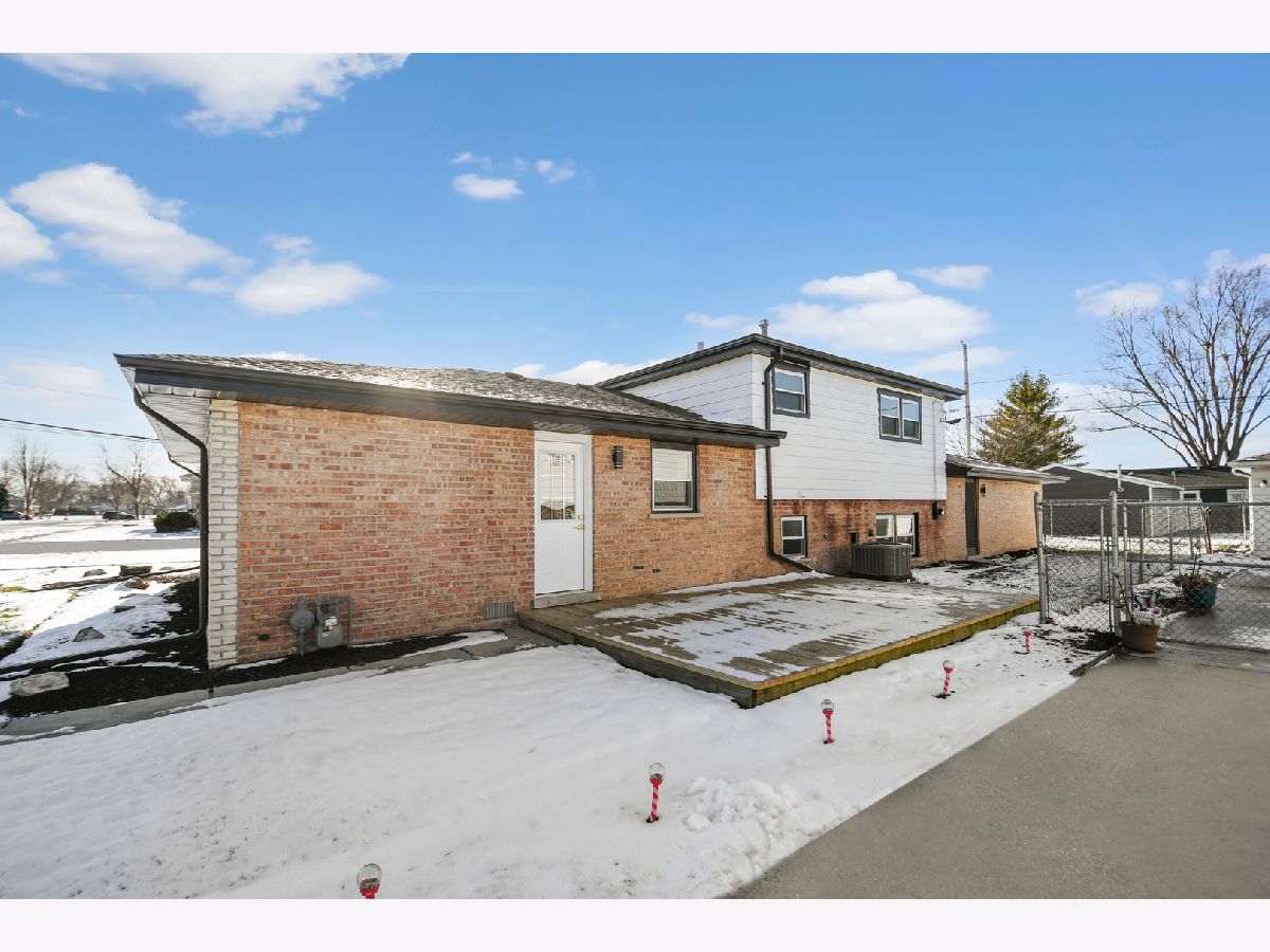The developer's modern vision is evident in every inch of this beautifully remodeled split-level home with an attached garage, set on a desirable corner lot in a sought-after northwest Alsip location. Impressive curb appeal welcomes you as you step inside to a bright and open main-level floor plan featuring a spacious living room with a large picture window and luxury vinyl plank flooring that continues seamlessly throughout all three levels. The bright, efficiently designed kitchen offers a generous dining area, chic white cabinetry, trendy quartz countertops, stainless steel appliances, and stylish brushed gold hardware and fixtures. A sliding door from the kitchen leads to a brand-new rear deck, perfect for outdoor enjoyment. The upper level features three comfortable bedrooms and a completely updated bathroom highlighted by a double-sink warm wood-grain vanity with a sleek white countertop, elegant gold-tone hardware, a wide mirror, modern vanity lighting, and a tub/shower combination wrapped in marble-inspired tile. The lower level provides a large, inviting family room, a nicely finished laundry and utility area, and a second convenient bathroom showcasing eye-catching blue-gray stone-effect tile, a floating vanity with integrated sink, contemporary gold-tone hardware, a matching gold-trimmed mirror, and coordinating light fixture. Completing the home is a two-car garage with epoxy-finished flooring and a side yard behind the garage that offers additional space for gardening, entertaining, or relaxing outdoors. This turnkey home checks every box so schedule your showing before someone else does.