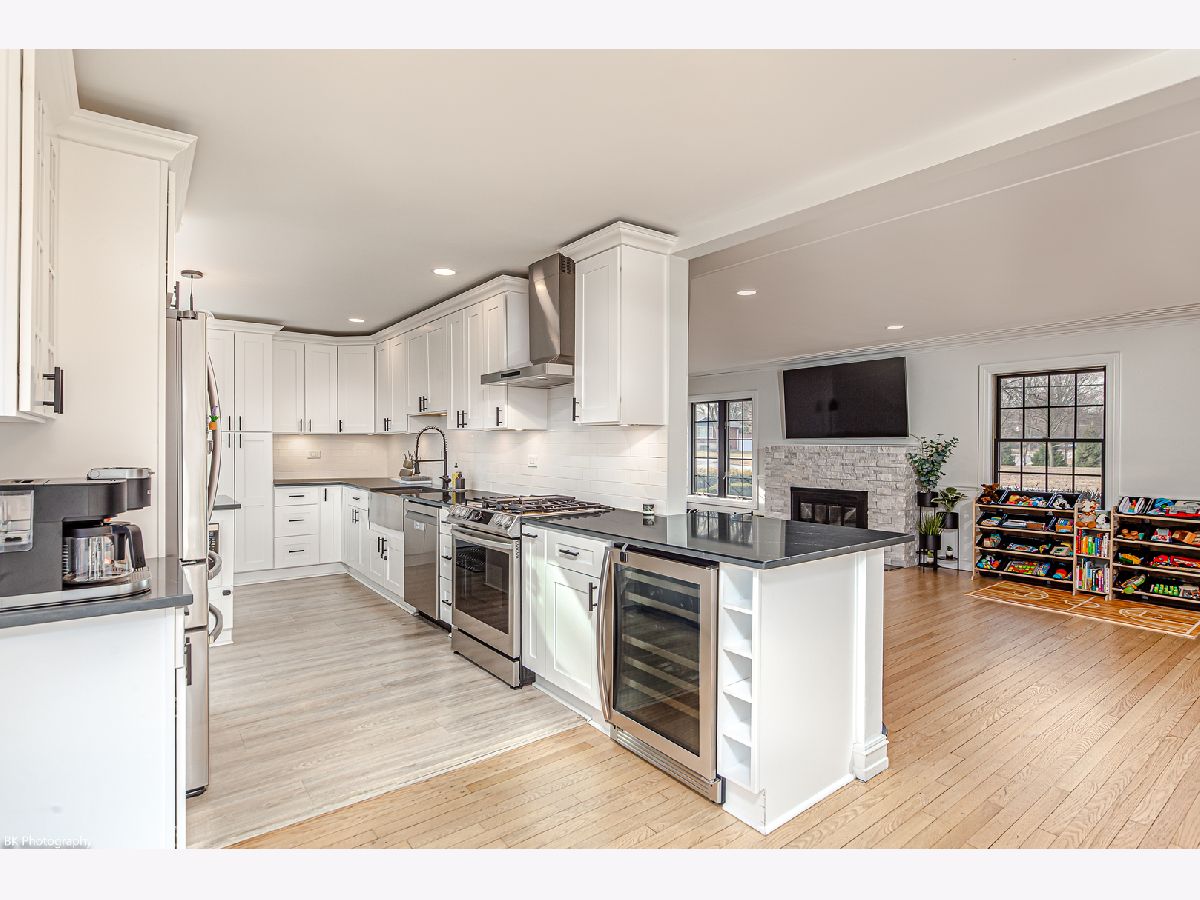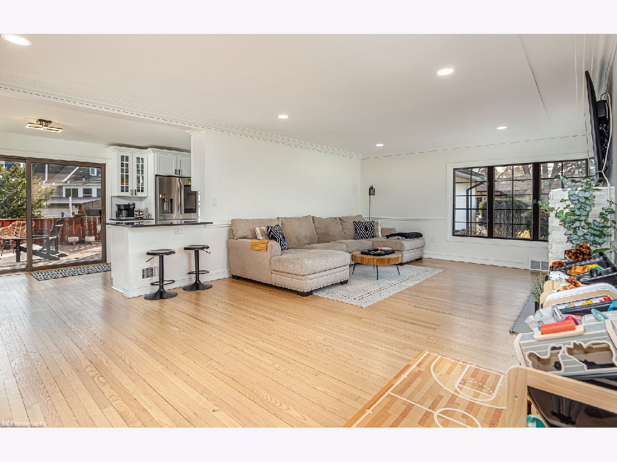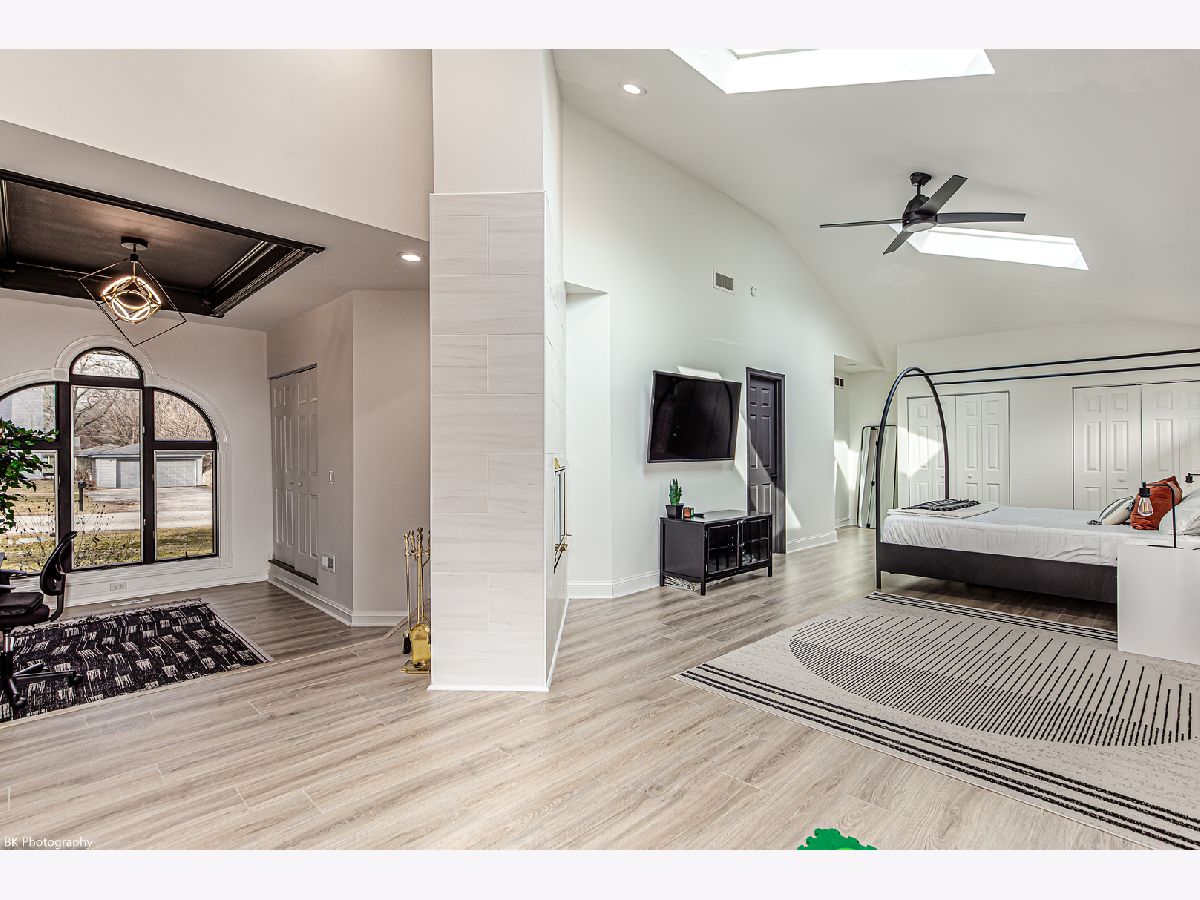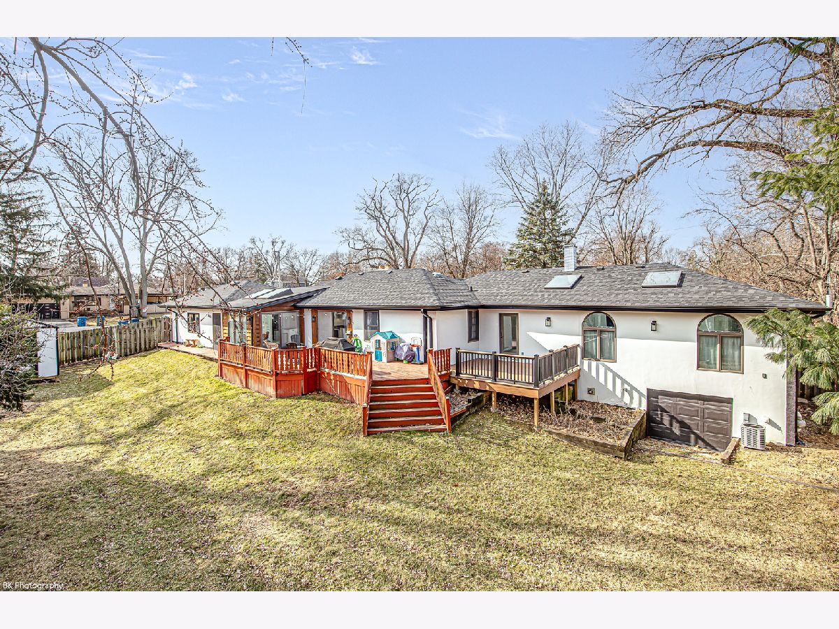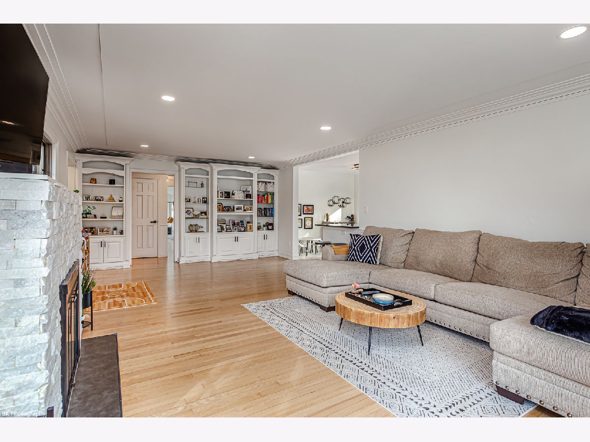 Stunning 3 bedroom, 3 bath Palos Heights sprawling ranch home has been renovated throughout and is on a 119 X 150 lot! This meticulous home features gleaming hardwood floors, updated fixtures, solid 6 panel wood doors, an inviting living room with crown molding, wood burning ledger-stone fireplace and custom built-in bookshelves. The modern eat-in kitchen has been renovated with white shaker cabinets, quartz countertops, subway-tile backsplash, pantry, stainless steel Samsung smart appliances, island, peninsula, two skylights, wine fridge and a sun-filled dinette that overlooks the serene yard! Formal dining area with patio door to the deck. You will love the 24x32 master suite with vaulted ceilings, two skylights, two-sided fireplace, sitting room/den, a large closet with new washer/dryer, two additional closets and huge walk-in closet. Luxurious master bath with comfort height dual sink vanity, electronic blinds, custom tiled, seated walk-in shower with dual heads and a water closet! Two additional good sized bedrooms and ultra-modern fully remodeled bath. This home has two basements, one with rec room, full bathroom, storage space and laundry hook up (potential for related living). The additional basement is exterior access only and is located under the master bedroom addition - currently being used as a gym! This home's exterior has been custom painted with a new tear off roof and landscaping! The wooded, fenced yard has a beautiful wrap-around deck, tons of green space, mature trees and a new custom built shed! The extra wide driveway leads to the attached two car garage. Seller offering buyer a $5,000 buyer allowance / credit. Recent upgrades since 2022 include: fully renovated kitchen and main level baths, tear-off roof, refinished hardwood floors, kitchen appliances, washer, dryer, custom shed, landscaping, modern paint and radon mitigation system (2024). The home has Andersen Windows. Fantastic location near shopping, restaurants, parks, schools, Palos Community Hospital and quick access to I-294! Fireplaces and deck are as-is.