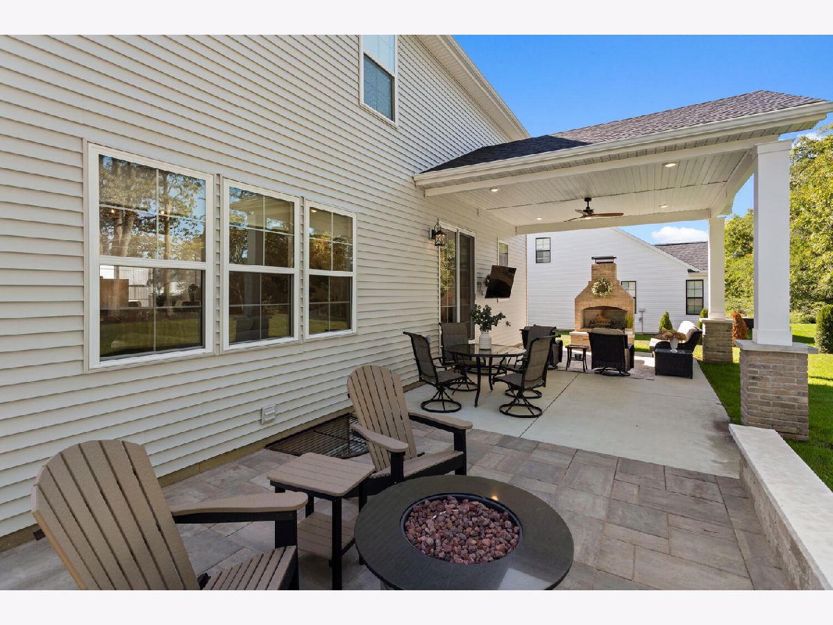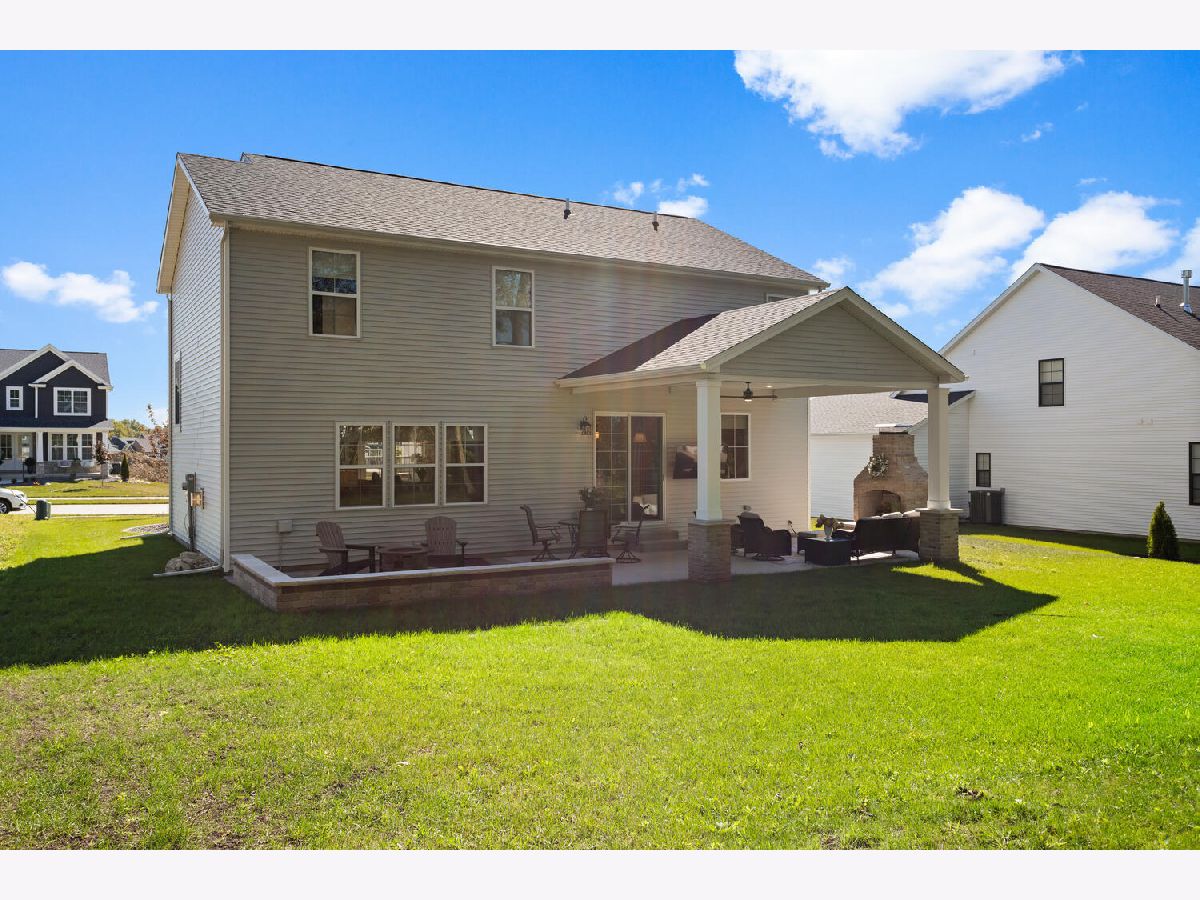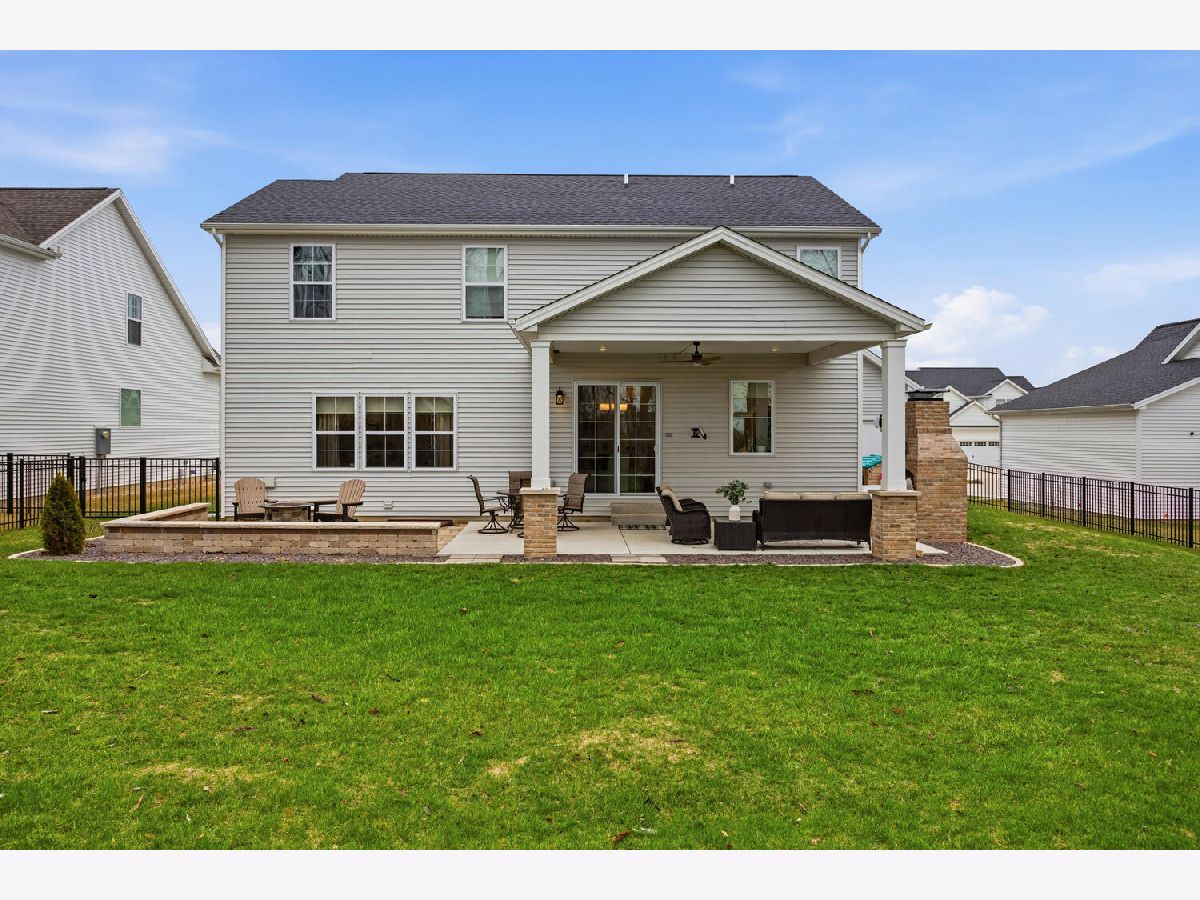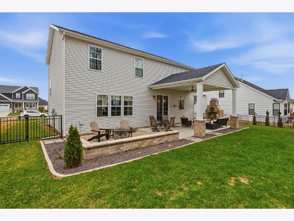 Welcome to this stunning, like-new home built by Stevens Homes in the desirable Thornewood subdivision in Mahomet. From the moment you arrive, the beautiful landscaping, strong curb appeal, and double front doors set the tone for what's inside. Step into a soaring foyer that opens to a formal dining room featuring a dropped tray ceiling, creating an elegant first impression. The main level offers an inviting open concept layout where the great room flows seamlessly into the breakfast area and kitchen. The great room is a showpiece with a beautiful gas fireplace and custom built-in cabinetry with shelving, creating both a warm focal point and functional storage. The kitchen is equally impressive with gorgeous quartz countertops with matching backsplash, a striking hood flanked by wall sconces, and beautiful hardwood floors that run throughout the main living space. It's a layout that works beautifully for both everyday living and entertaining. Outdoor living is just as impressive with a covered patio featuring a stunning stone fireplace, along with an additional fire pit area that creates the perfect setting for relaxing evenings or gathering with friends and family. Upstairs you'll find the spacious primary suite along with three additional bedrooms. The primary retreat offers a spa-like bath and two generous walk-in closets. The finished basement adds even more living space with a large family/recreation room, a fifth bedroom, and another full bathroom. The backyard is beautifully designed and incredibly private, backing up to mature trees for a peaceful setting you'll enjoy year-round.