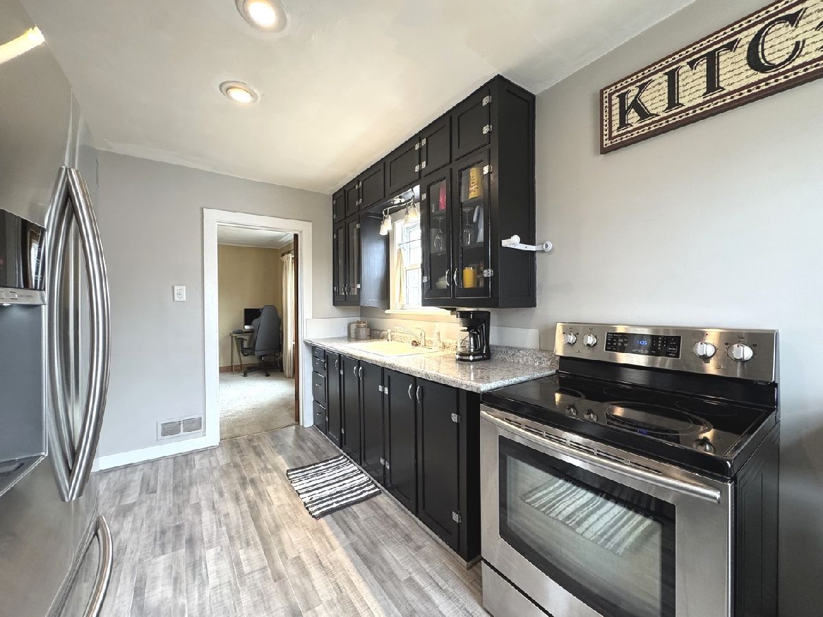 Charm and character abound in this Brick Cape Cod! Neat & clean with 3 Bedrooms and 1.5 Baths. The Living Room features an electric Fireplace with accent wall, and offers some built in shelving. The Formal Dining room is perfect for your family gatherings and cozy dinners. Beautiful hardwood floors in Bedrooms and brand-new Kitchen flooring. The full bath is nicely updated with tiled shower and glass block window w/vent. Full partially finished basement offers the perfect space for children, or for entertaining your friends and family and includes newer basement windows. New windows 2022, Roof 2012, Furnace & Central air approx. 2010, water heater 2022. 1 car detached garage, privacy fenced back yard and deck. Convenient location close to grocery, restaurants, hospitals, banks and much more. Please allow 24-hour notice to show.