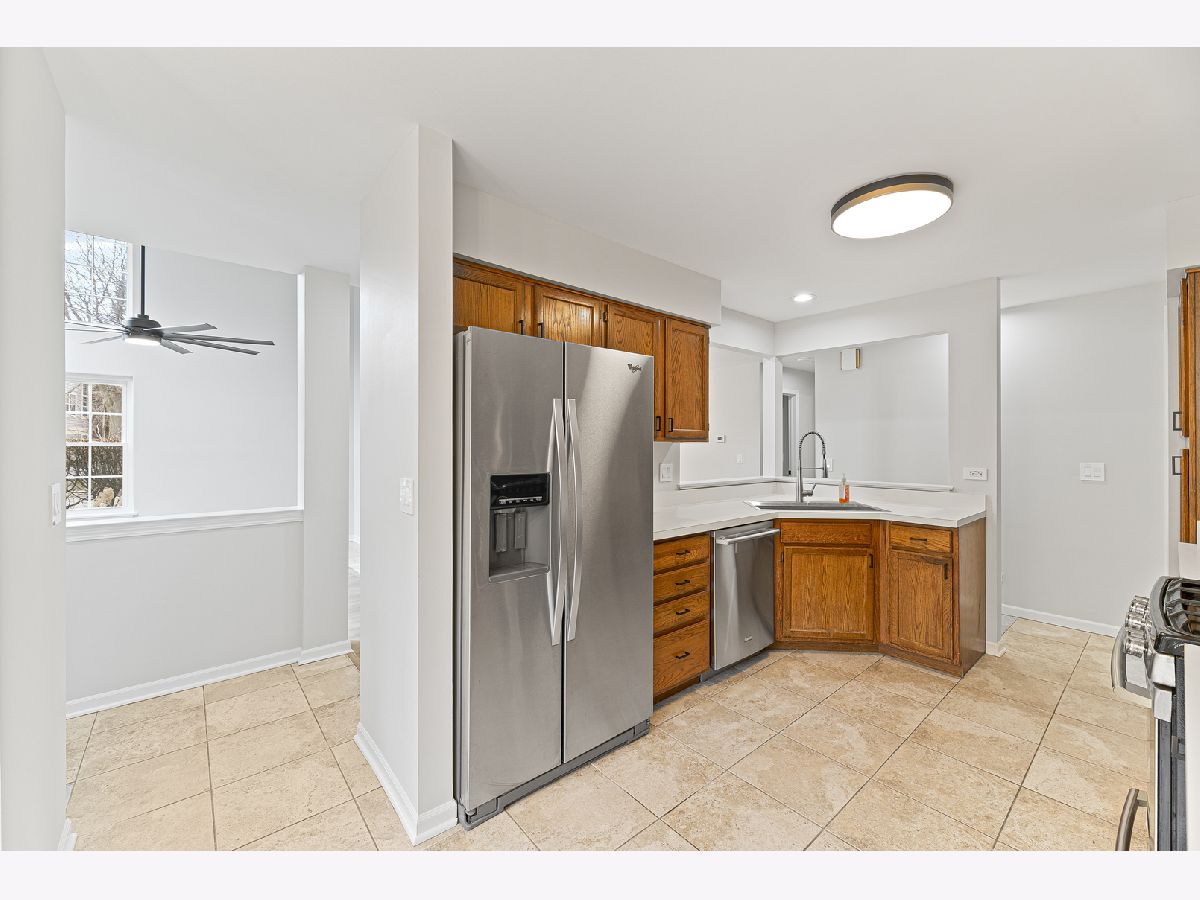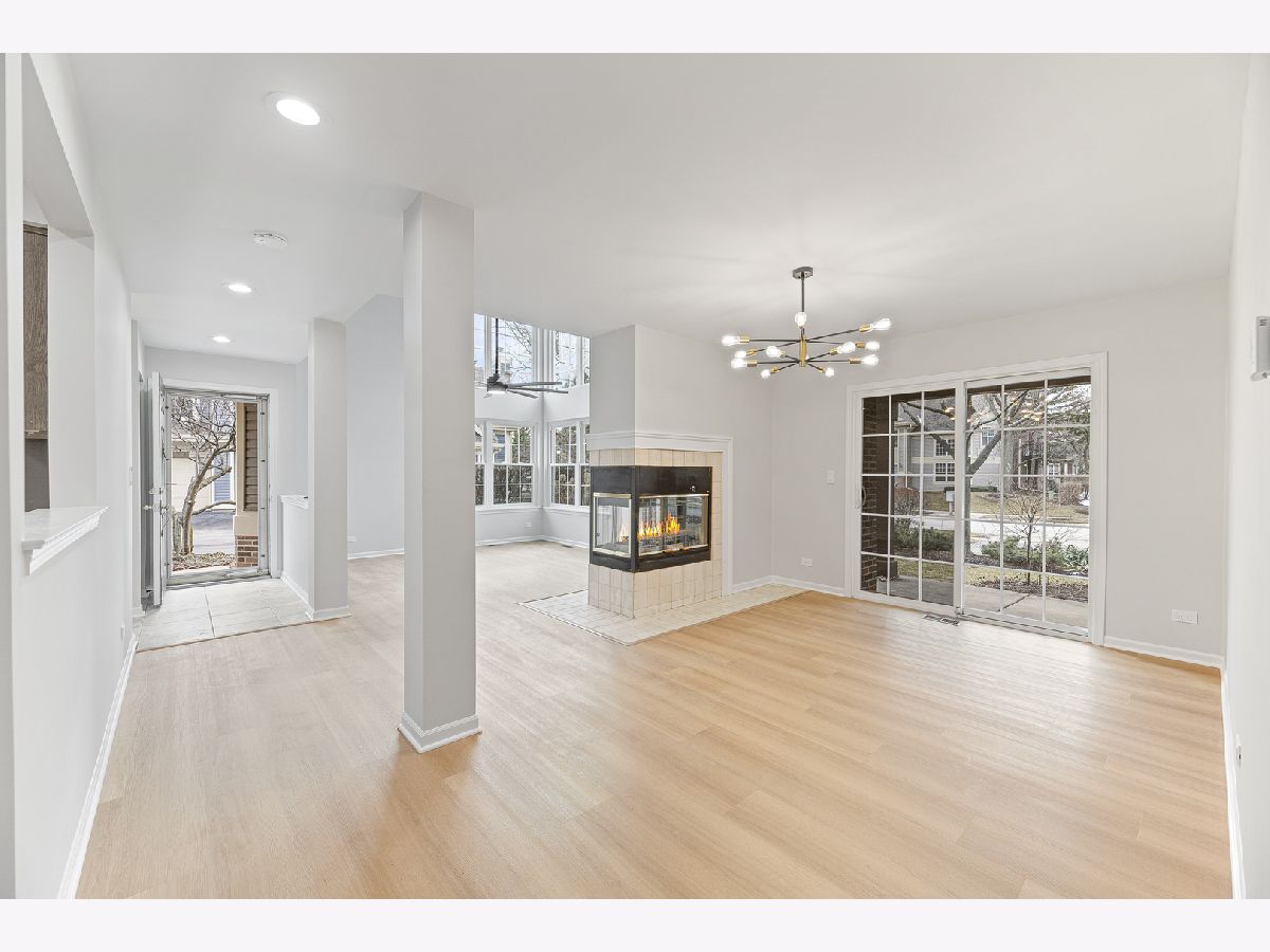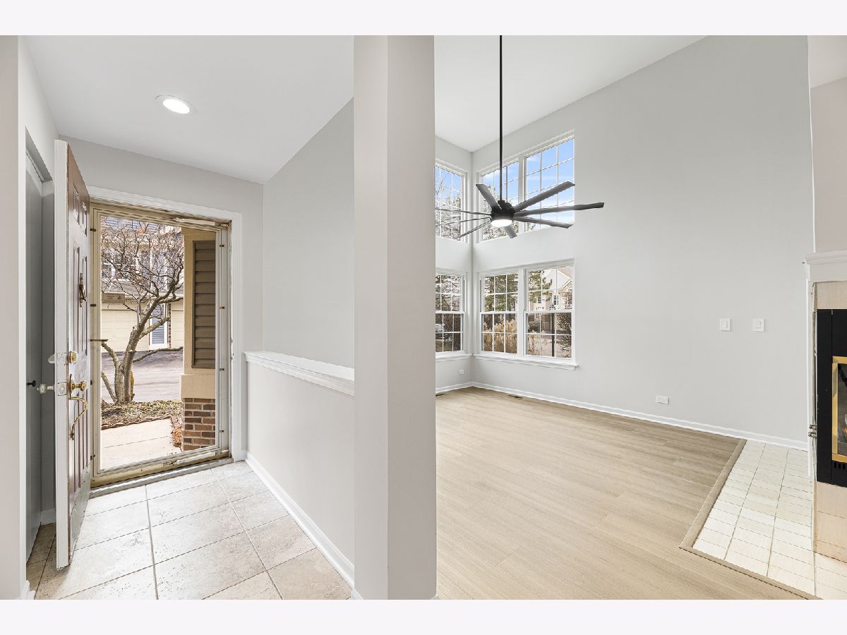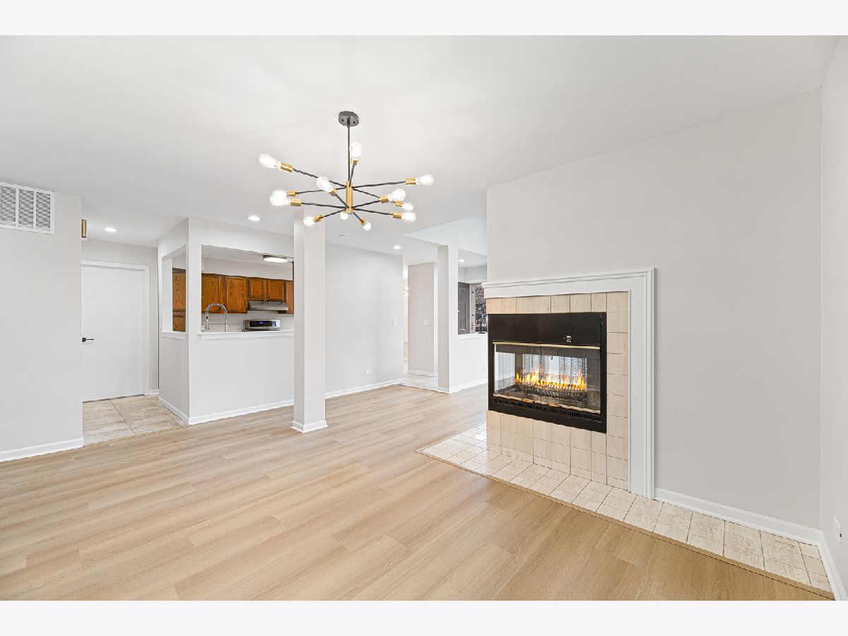 Beautifully updated 2 bedroom, 2 bathroom ranch-style townhome located in the desirable Talbots Mill subdivision offering true single-level living with a 1 car attached garage. Freshly painted throughout with brand new vinyl flooring, baseboards, and modern light fixtures, this home features a bright and open layout with vaulted ceilings, abundant natural light, and a spacious living and dining area centered around a stunning double-sided fireplace. The kitchen offers ample cabinet space, stainless steel appliances, and a functional layout ideal for everyday living and entertaining. The spacious primary suite includes a private full bathroom and generous closet space, while the second bedroom and additional full bathroom provide flexibility for guests or home office use. Additional updates include Furnace (2026), AC (2023), Washer/Dryer (2020), and Water Heater (2019). Ideally located near shopping, dining, expressways, Woodfield Mall, parks, and forest preserves, this move-in ready home offers comfort, convenience, and low-maintenance living in a prime Elk Grove Village location.