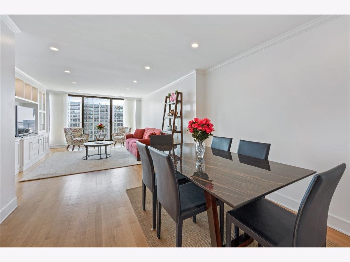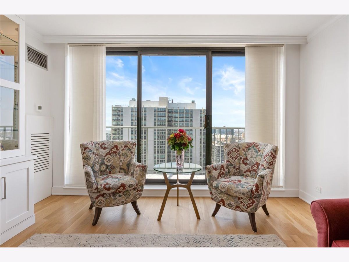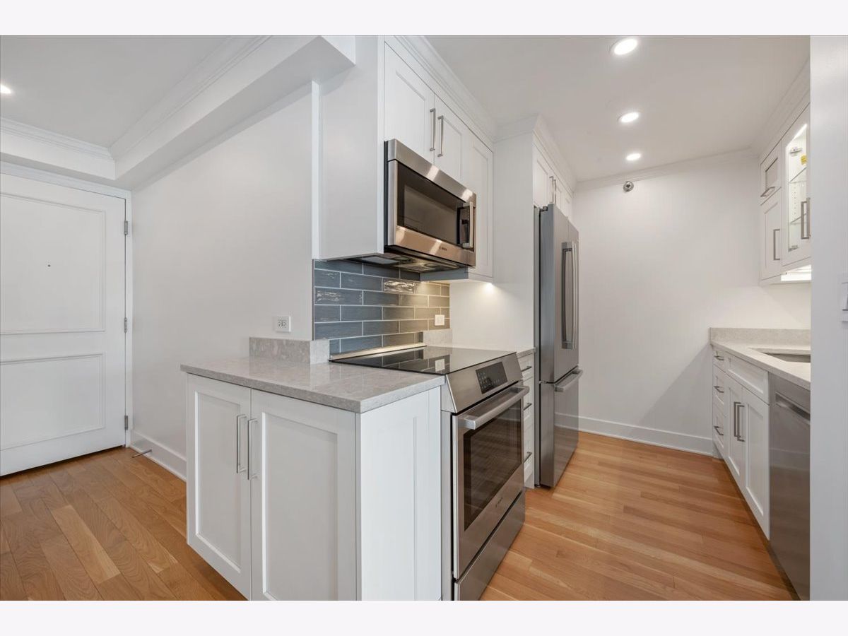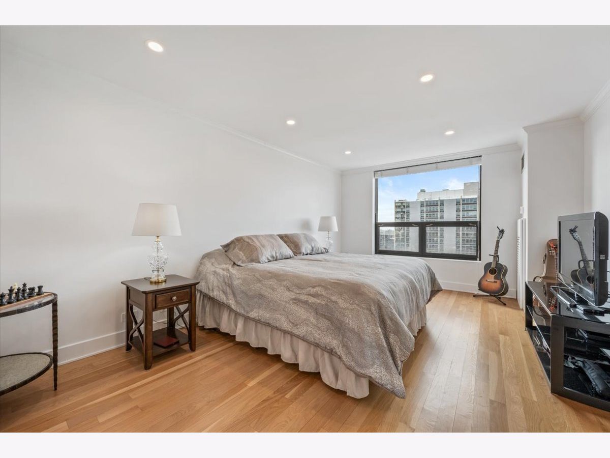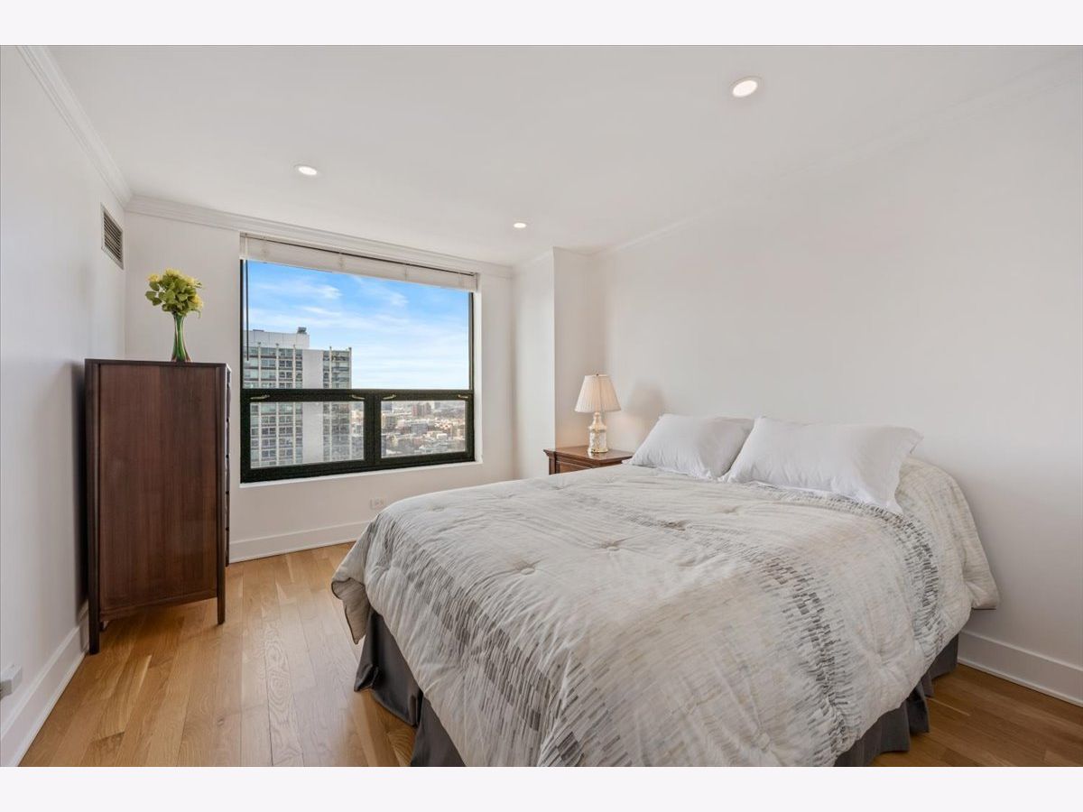 Residence 24E is a beautifully renovated home offering sophisticated finishes and sweeping sunset and skyline views. This move-in-ready residence features stunning hardwood floors throughout, complemented by all-new doors, trim, and a fresh look.The open-concept kitchen is designed for both everyday living and entertaining, with white cabinetry, quartz countertops, and stainless steel appliances seamlessly flowing into the dining space. Both bathrooms have been completely updated with timeless finishes, and the convenience of an in-unit washer and dryer adds to the home's functionality.Bedrooms offer great space and exceptional closet space. Take in the views and check the weather from your private balcony. The building offers an incredible rooftop deck showcasing panoramic views of Lake Michigan and the Chicago skyline, along with an exercise room and additional laundry facilities, plus a 24-hour door staff. Garage parking is available for rent within the building. Move into this turnkey home in a premier Gold Coast location close to public transportation, restaurants and shopping as well as the park and the beach. The riser project has been completed in this unit and the special paid off.