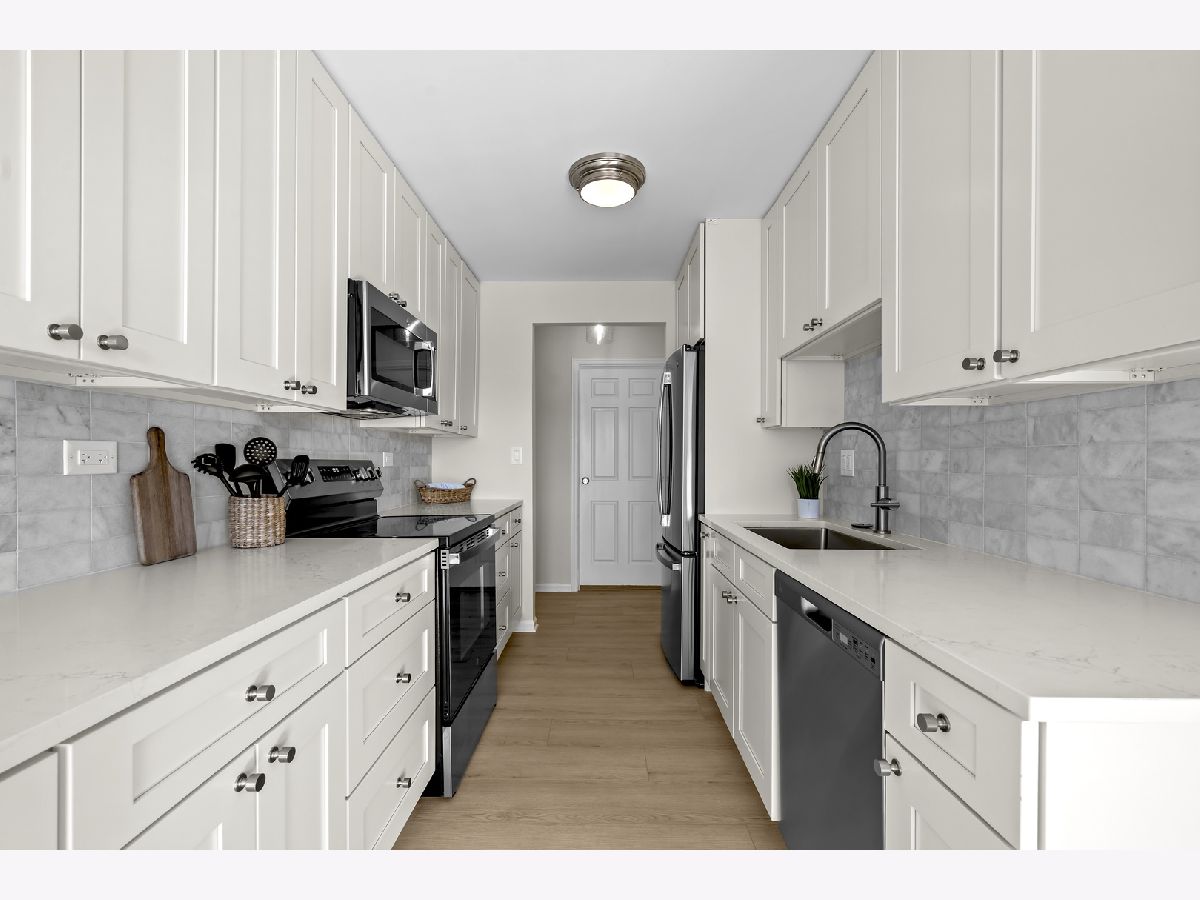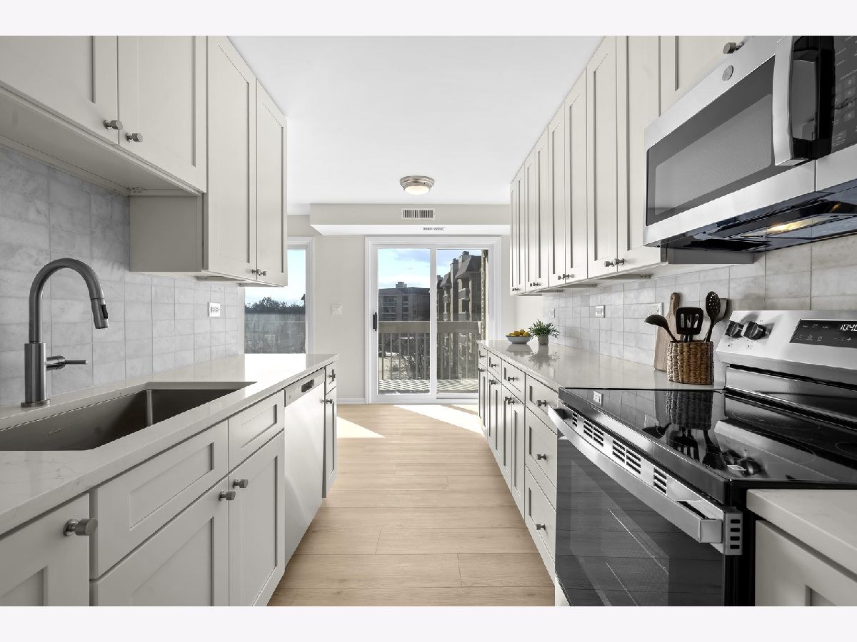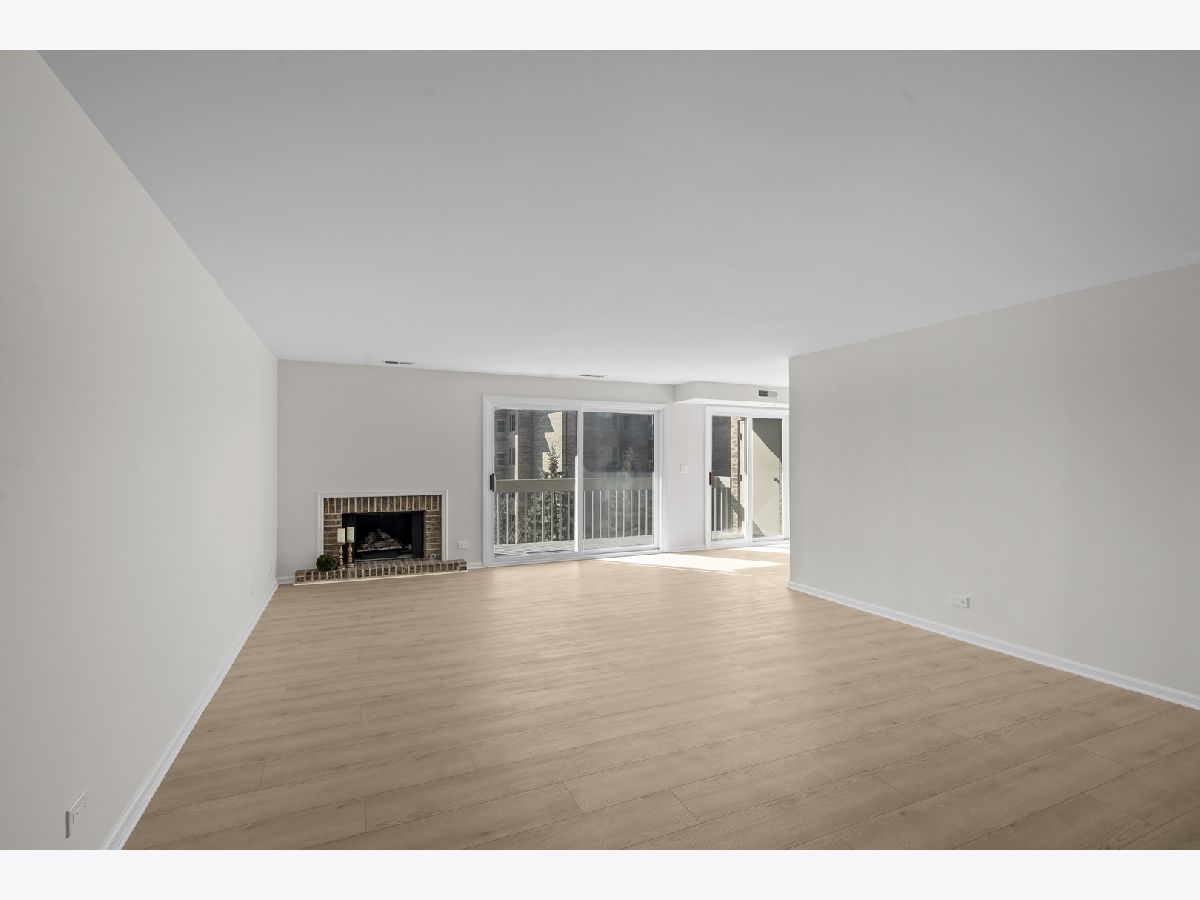 Highly desirable Condos of Northbrook. This bright and sunny fourth-floor three bedroom, three bath unit has been recently renovated with stunning designer finishes from top to bottom. Wide plank luxury vinyl flooring runs throughout the main living areas, hallway, and primary suite. The galley kitchen features white cabinetry, quartz countertops, new GE appliances, a custom backsplash, and a breakfast nook overlooking a private balcony with pool views. The spacious living room includes a gas fireplace, sliding doors accessing the large balcony, and the separate dining room is accented by a beautiful chandelier. The primary bedroom has been reconfigured into a private retreat with a spa-like bath that includes a double vanity, walk-in shower with glass doors and designer tile, a separate toilet area, and an additional storage closet. A large walk-in closet completes the suite. Two additional bedrooms feature new carpeting, abundant natural light, and generous closet space, each with access to a dedicated full bathroom conveniently located just across the hall. The unit also includes an in-unit laundry area with storage cabinets. Additional amenities include two tandem garage spaces (23-24), an outdoor pool, tennis courts, a party room, exercise room, sun deck, a large storage unit on the same floor, and secured gate entry. Ideally located minutes from restaurants, shopping, transportation, Downtown Northbrook, the Botanic Gardens, and Ravinia, this well-managed building offers a welcoming and friendly community. This is the one you have been waiting for!