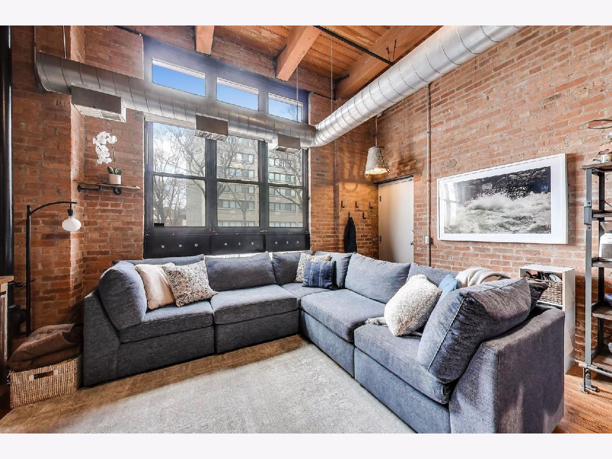 True 2-bedroom, 2-bath timber loft in Vanguard Lofts that lives like a townhome, featuring a rare private, gated second entrance with direct access to parking and the sidewalk-no elevator required which is dog-parent's or biker's dream! This corner end-unit offers exceptional privacy and natural light with North and West exposures, soaring ~14' ceilings, exposed brick, timber beams, and industrial ductwork throughout. The open-concept living space is anchored by a gas fireplace with floor-to-ceiling stone surround and custom built-ins, flowing seamlessly into an updated kitchen with quartz countertops, painted cabinetry, deep sink, and newer stainless steel appliances (2024-2025). The fully enclosed primary suite is a standout for loft living, offering true privacy along with a massive, fully built-out walk-in closet and en-suite bath. A well-proportioned second bedroom provides flexibility for guests, a home office, or both, complemented by a second full bath. Additional highlights include in-unit laundry (2025), updated mechanicals (furnace/AC 2022), refinished natural oak flooring, and excellent storage with a dedicated cage and bike room just steps from the unit. Deeded exterior parking space included. Pet-friendly building with strong community feel, guest parking, and unbeatable access to Skinner Park, Fulton Market, West Loop dining, Target, Mariano's, Whole Foods, and the Blue Line. Easy access to I-290 and I-90.