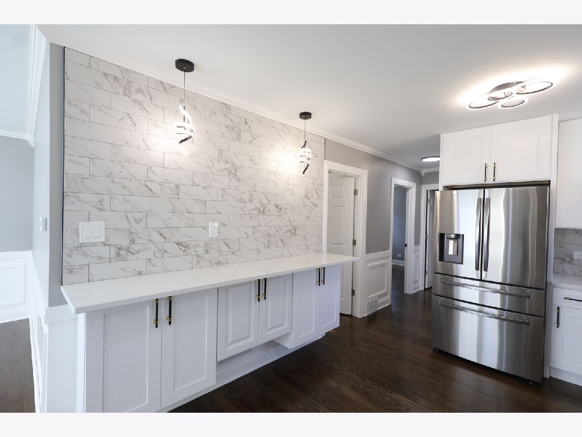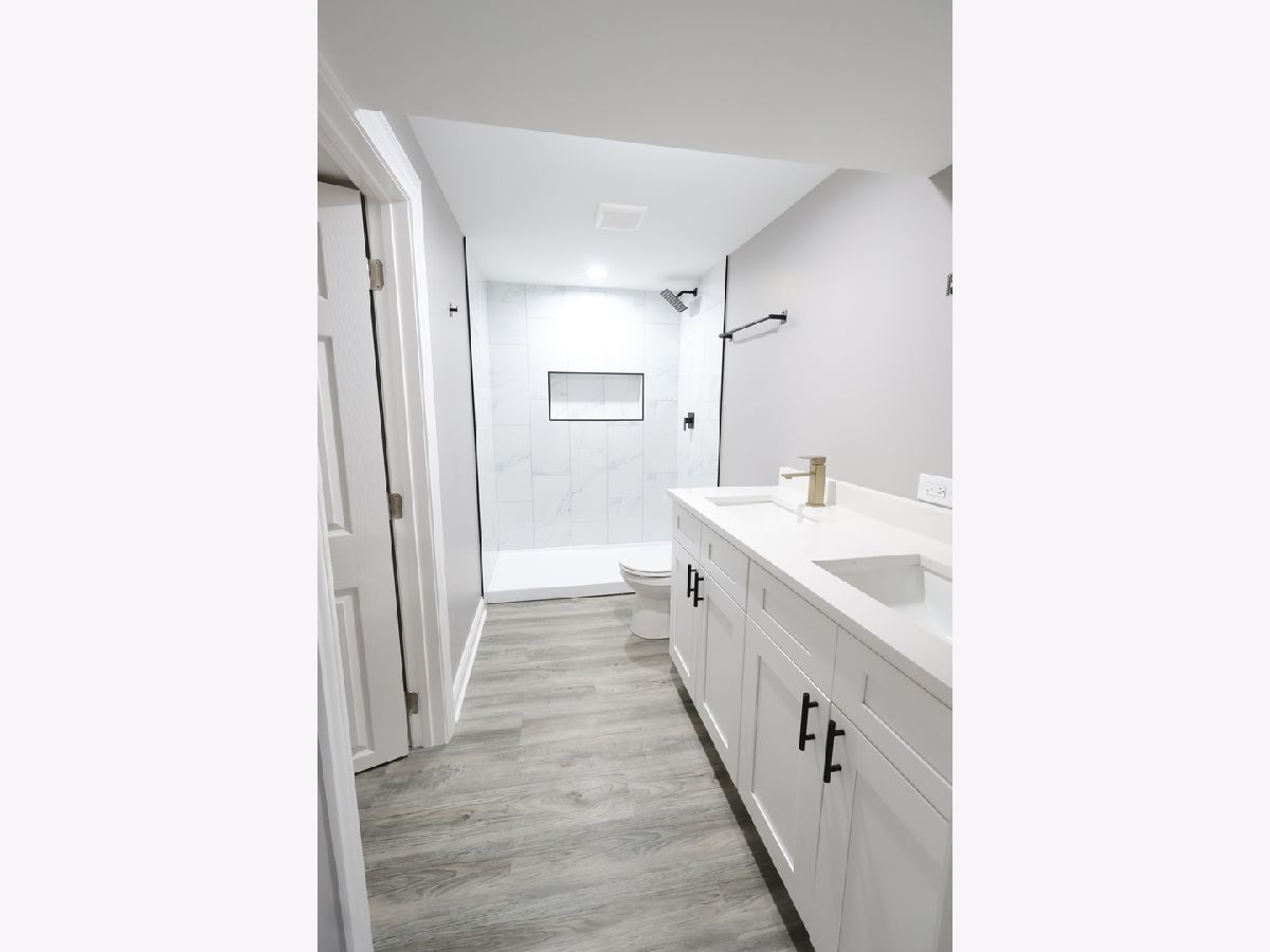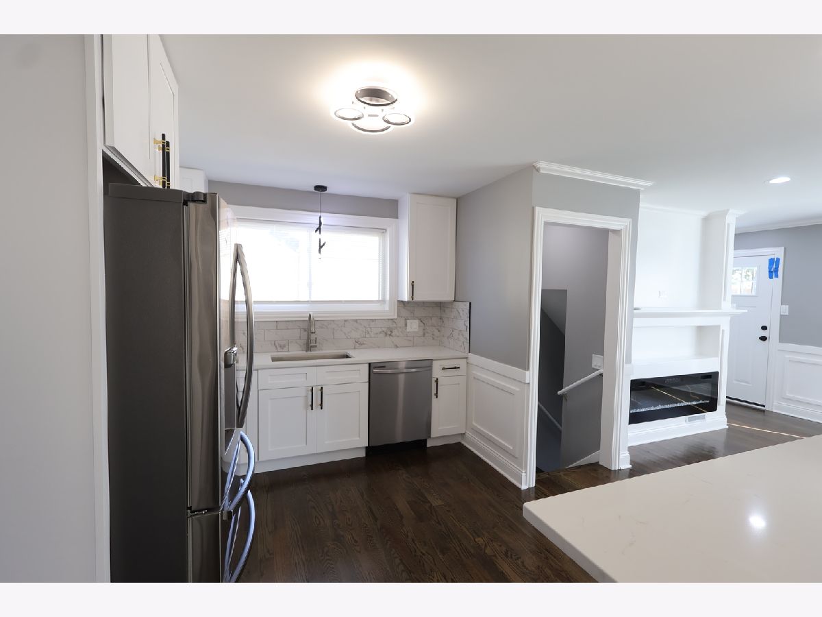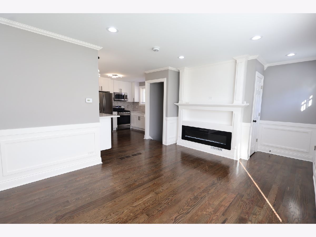 Impressive 4-bedroom, 2-bath ranch with a full finished basement. Completely renovated inside and out! Updates include new plumbing, electrical, drywall, insulation, roof, and a tall, brand-new 2.5-car garage with high ceilings. The seller also installed a full French drain tile system with sump and ejector pumps. Inside, you'll find hardwood floors throughout, recessed lighting, and a bright open layout anchored by a custom-built electric fireplace and media wall. The kitchen features ceiling-height cabinets, quartz countertops, stainless steel appliances, and a built-in breakfast bar for everyday dining. The lower level includes a spacious bedroom that can serve as a master suite, with private access to a modern bath featuring dual sinks and a walk-in shower, plus a large family room and laundry area. Exterior upgrades include new concrete sidewalks. Every detail reflects quality, comfort, and care. Move-in ready and beautifully finished!
