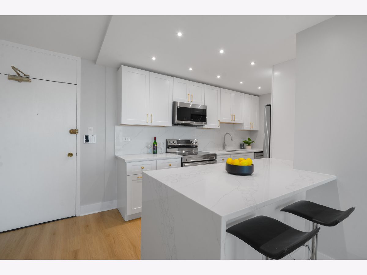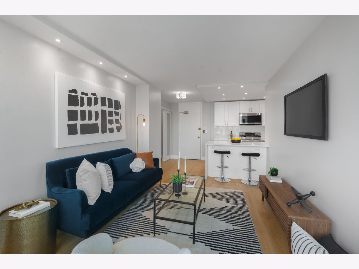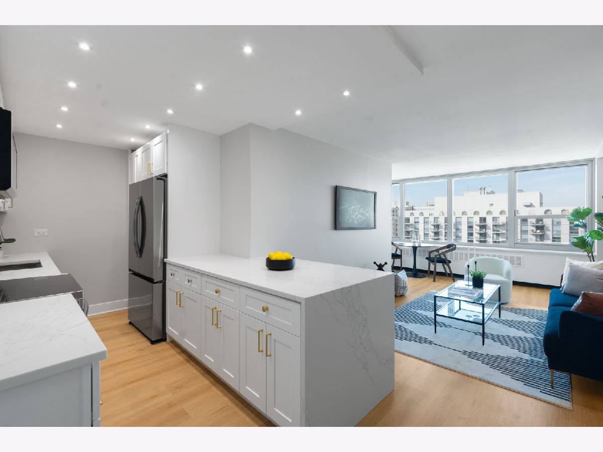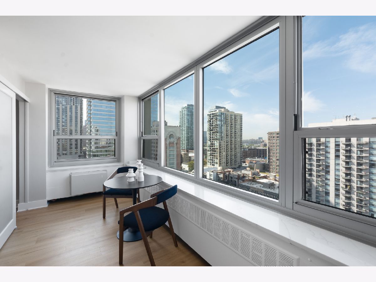 Presenting this rare new one bedroom plus Den home on a high floor (17th) with stunning views. It also has a separate dining/office space. The home has been gut rehabbed and meticulously renovated to the highest standards. Be the first to live in this redesigned floor plan for today's lifestyle and living. Top quality craftsmanship and finishes throughout. The home has all new windows. The kitchen has custom white gloss flat panel cabinets with black accent hardware, quartz counters & island with waterfall edge and breakfast bar with black/gold pendants. High-end stainless steel appliances including french door refrigerator, Kitchen opens to the living/dining room, which has new recessed lighting. The bathroom is fully rehabbed with new walk-in shower, vanity with quartz top, upscale commode & fixtures, mirrored medicine cabinet, contemporary tiles. The primary bedroom is generously sized allowing for a Den/home office,Throughout the unit there are wide plank light wood color floors. New plumbing, electrical, designer lighting and professionally organized closets throughout. Enjoy the spectacular unobstructed views from the 17th floor out over the city with amazing sunsets. Additional storage cage included in the building. Eliot House is a highly desired, well run building with low assessments & good reserves, many major updates completed including all new windows, elevators and renovated lobby. There's a newer rooftop sun deck with furniture and grill and also a ground floor patio BBQ area, renovated laundry room, 24 hour door staff, maintenance & management are onsite. Low monthly assessment includes heat, TV cable and high speed internet service (everything except electricity). Sandburg Village amenities include 2 outdoor pools & sundecks, tennis courts, hospitality rooms- (some additional fees) The landscaped courtyards, play lot, commercial facilities provide a welcoming community environment. Convenient for transportation - train/subway on same block, buses at door, access to Lake Shore Dr, bike path. Located in Gold Coast / Old Town, close to downtown, Lincoln Park. Enjoy all attractions of the neighborhood - restaurants, nightlife, shopping, new Jewel, Lakefront trail, beach, parks. Pool and FFC gym are next door. Pets allowed. Parking in building garage only $150 p/m there is a wait list.