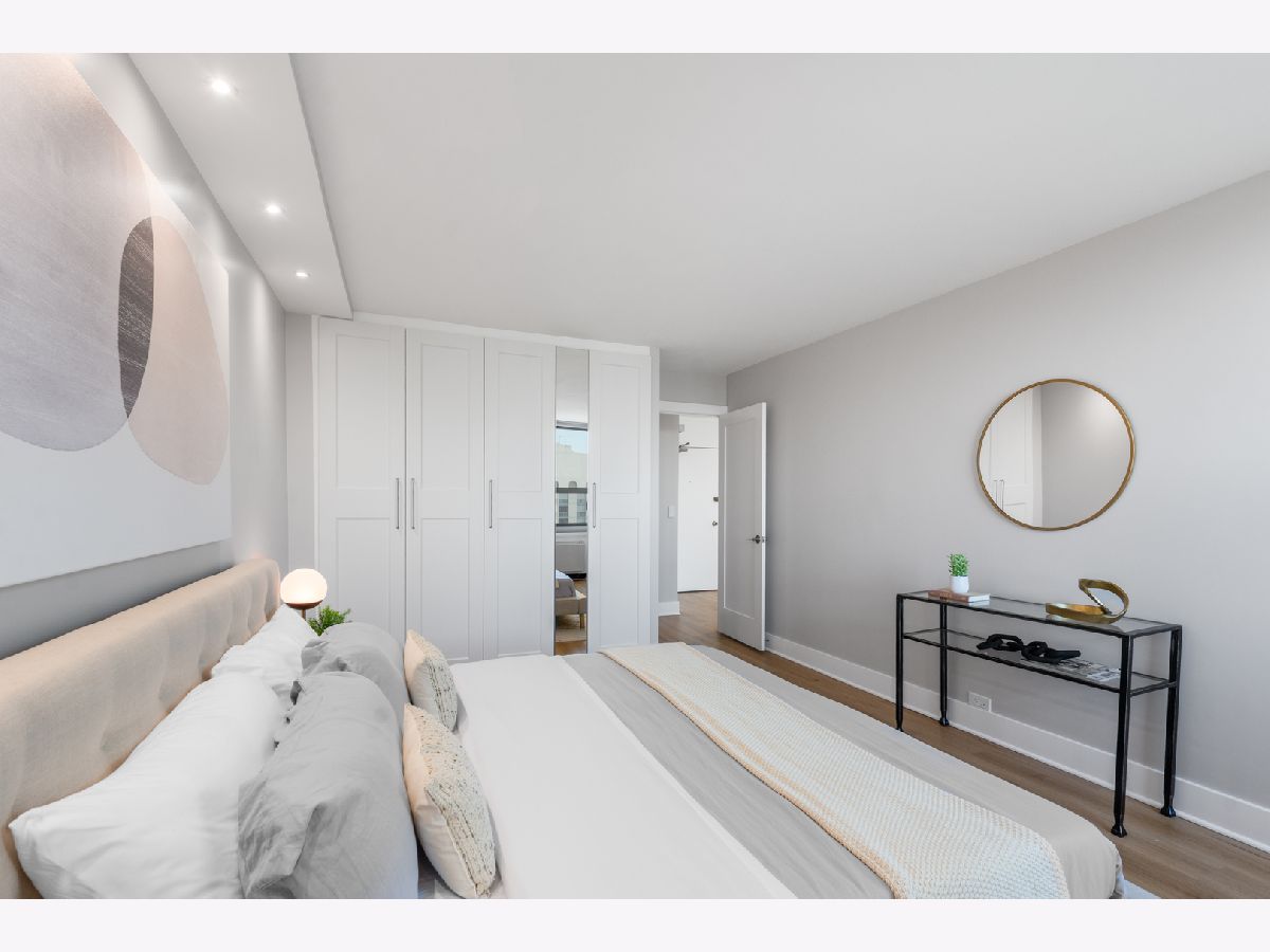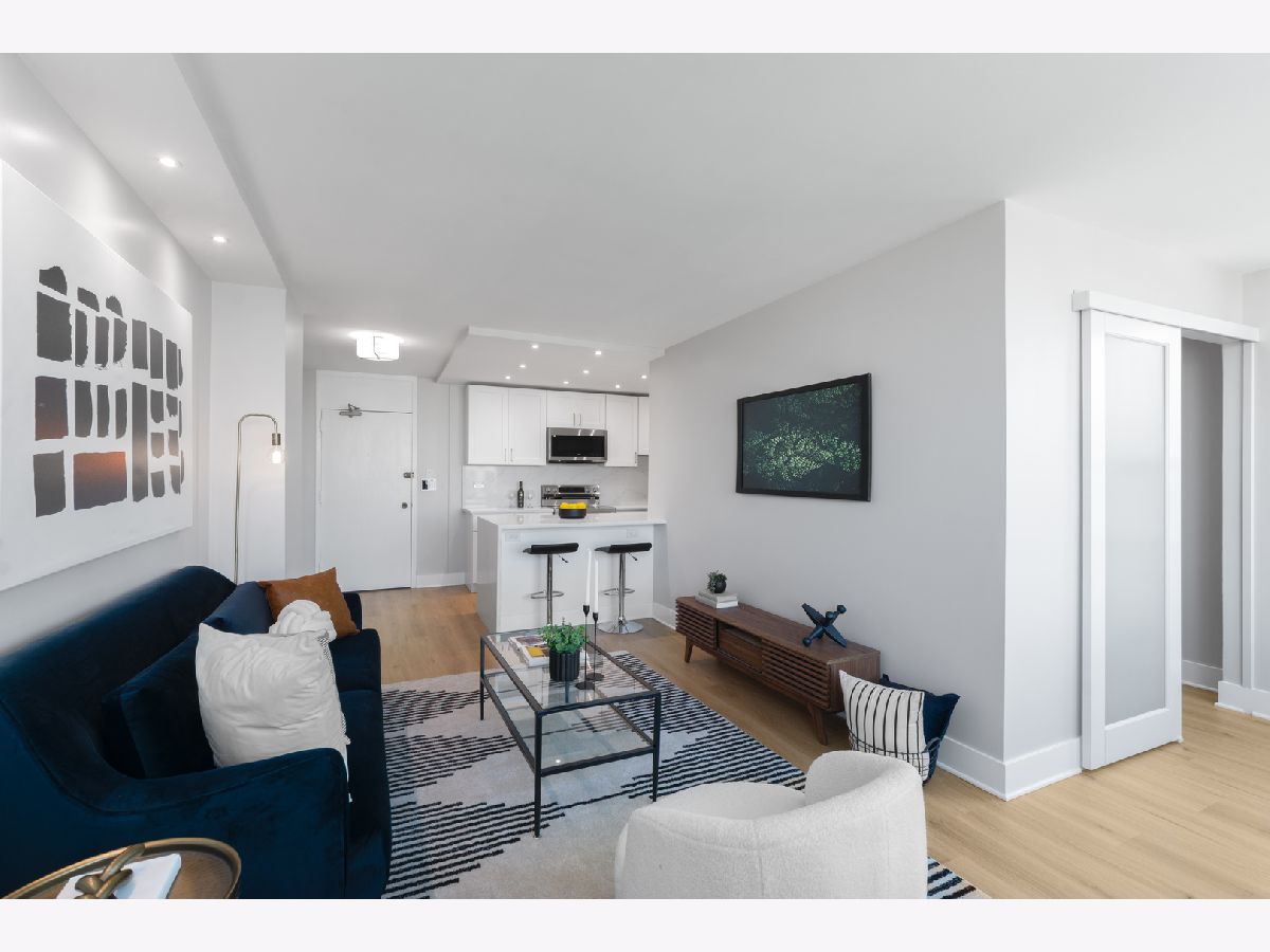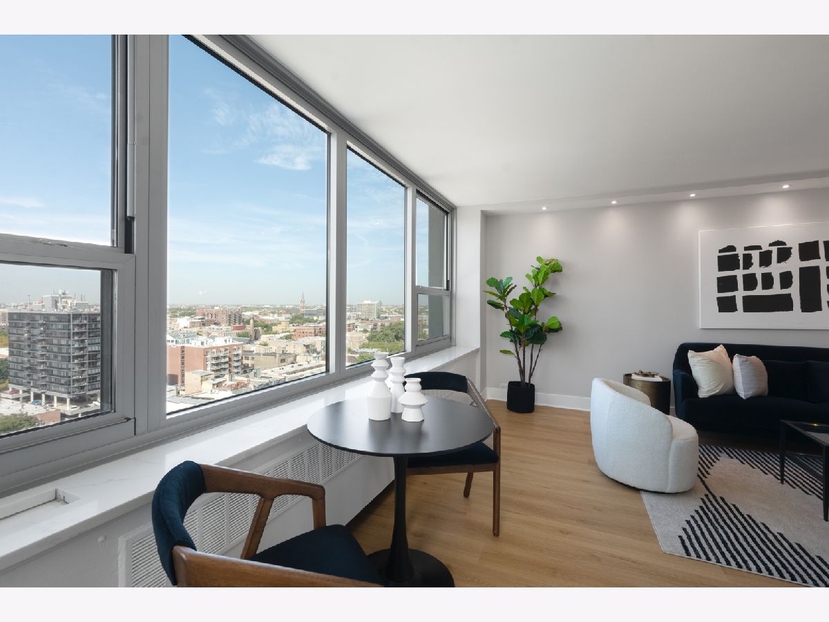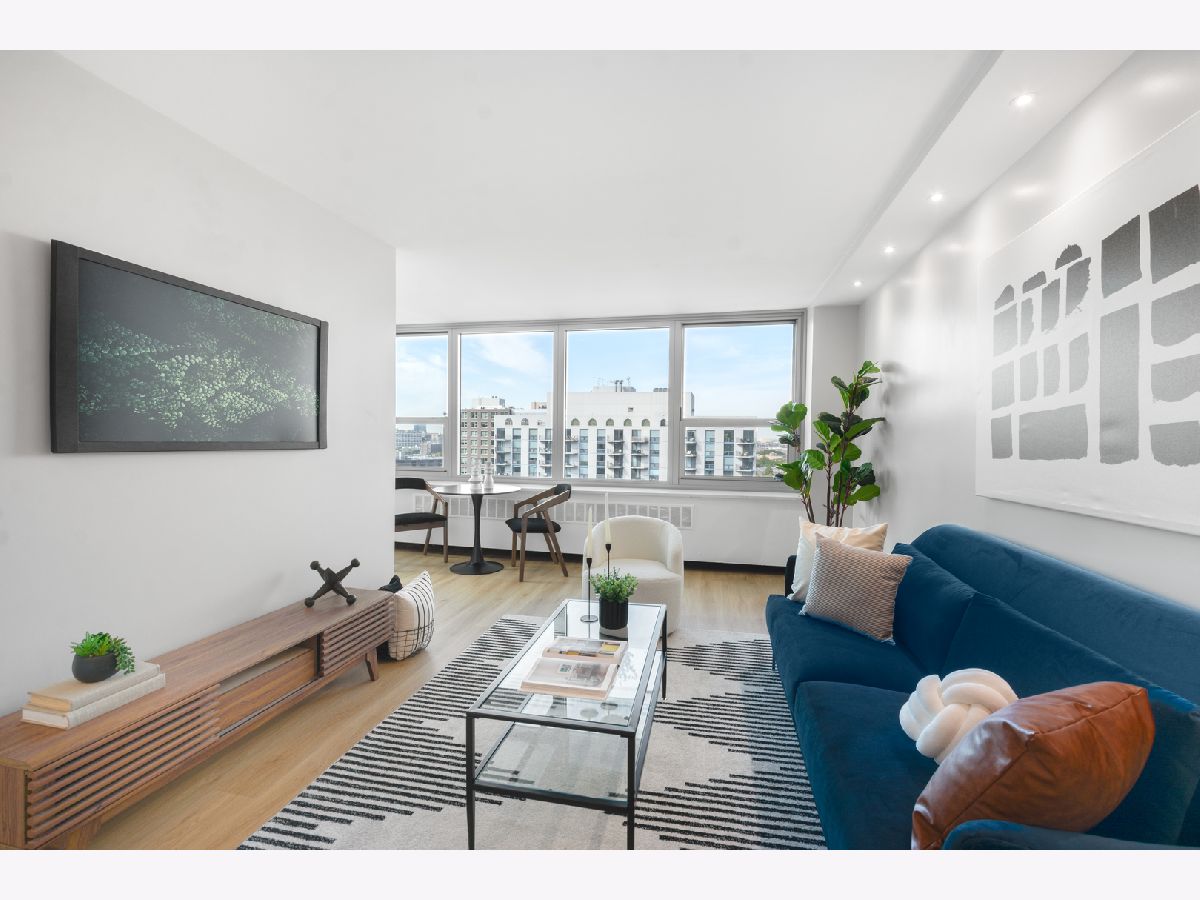 Presenting this rare new one bedroom plus Den home on a high floor (17th) with stunning views. It also has a separate dining/office space. The home has been gut rehabbed and meticulously renovated to the highest standards. Be the first to live in this redesigned floor plan for today's lifestyle and living. Top quality craftsmanship and finishes throughout. The home has all new windows. The kitchen has custom white gloss flat panel cabinets with black accent hardware, quartz counters & island with waterfall edge and breakfast bar with black/gold pendants. High-end stainless steel appliances including french door refrigerator, Kitchen opens to the living/dining room, which has new recessed lighting. The bathroom is fully rehabbed with new walk-in shower, vanity with quartz top, upscale commode & fixtures, mirrored medicine cabinet, contemporary tiles. The primary bedroom is generously sized allowing for a Den/home office,Throughout the unit there are wide plank light wood color floors. New plumbing, electrical, designer lighting and professionally organized closets throughout. Enjoy the spectacular unobstructed views from the 17th floor out over the city with amazing sunsets. Additional storage cage included in the building. Eliot House is a highly desired, well run building with low assessments & good reserves, many major updates completed including all new windows, elevators and renovated lobby. There's a newer rooftop sun deck with furniture and grill and also a ground floor patio BBQ area, renovated laundry room, 24 hour door staff, maintenance & management are onsite. Low monthly assessment includes heat, TV cable and high speed internet service (everything except electricity). Sandburg Village amenities include 2 outdoor pools & sundecks, tennis courts, hospitality rooms- (some additional fees) The landscaped courtyards, play lot, commercial facilities provide a welcoming community environment. Convenient for transportation - train/subway on same block, buses at door, access to Lake Shore Dr, bike path. Located in Gold Coast / Old Town, close to downtown, Lincoln Park. Enjoy all attractions of the neighborhood - restaurants, nightlife, shopping, new Jewel, Lakefront trail, beach, parks. Pool and FFC gym are next door. Pets allowed. Parking in building garage only $150 p/m there is a wait list.