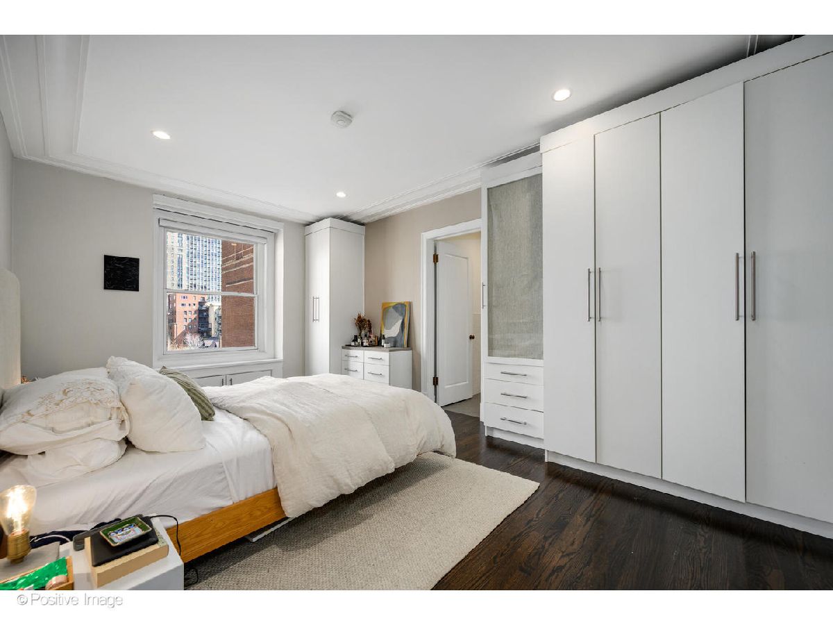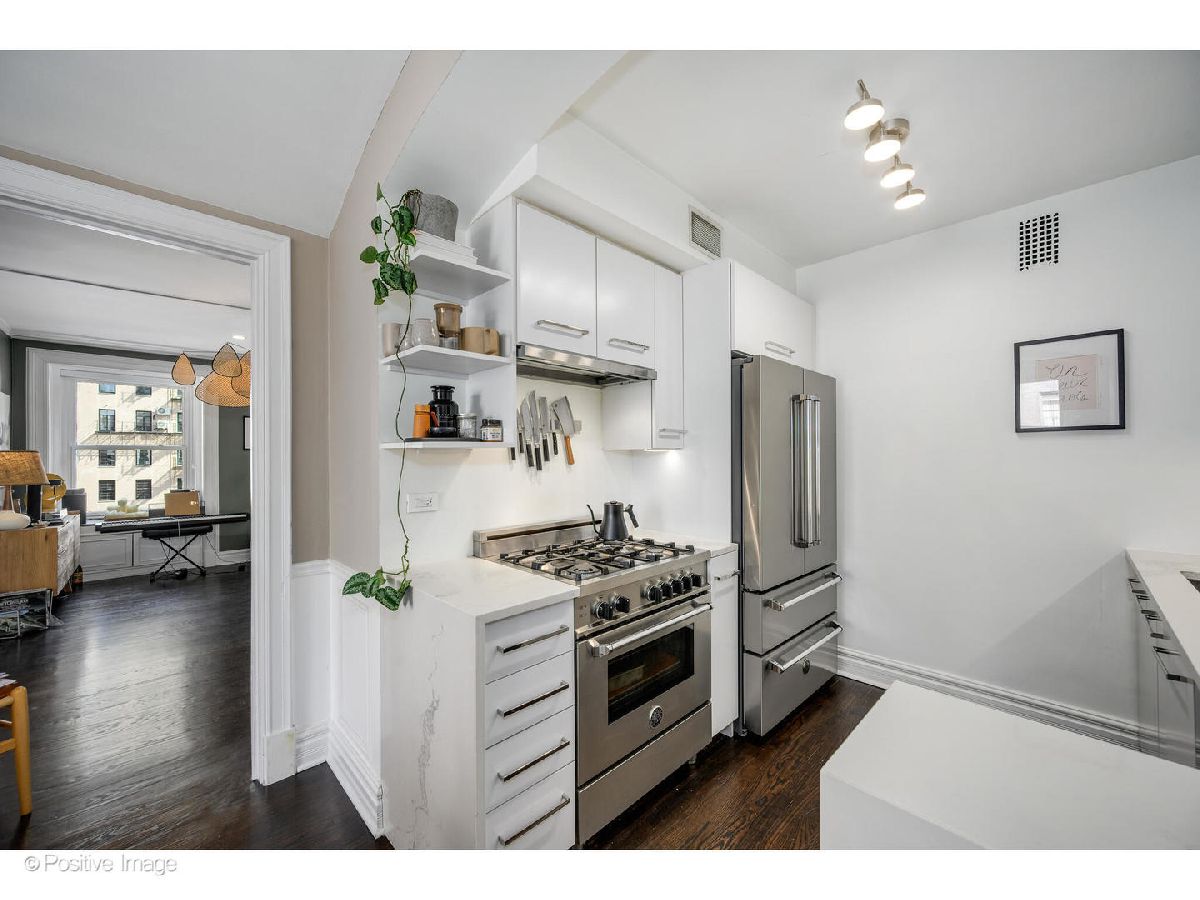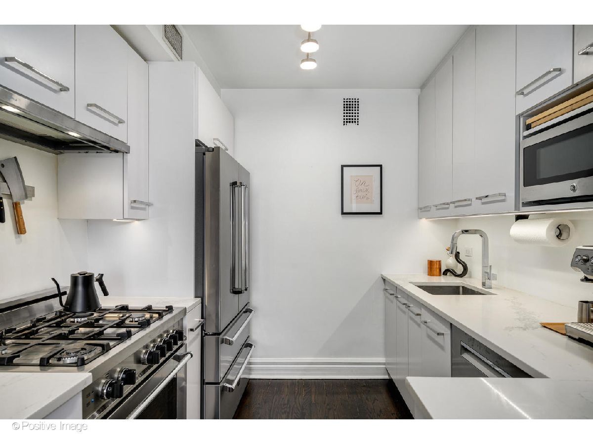 Rarely does a home of this caliber come to market in the Gold Coast. Set on the seventh floor of a distinguished 1924 landmark building at the corner of State Parkway and Goethe, this meticulously gut-renovated 2-bedroom, 2-bath residence delivers the enduring elegance of pre-war architecture alongside thoroughly modern, move-in-ready living. Step through a gracious foyer into one of the most generously proportioned floor plans you will find at this price point. The oversized living room is anchored by a real wood-burning fireplace (currently configured with gas for everyday convenience) and bathed in natural light from coveted north and east exposures. It flows seamlessly into a generous separate dining area made for entertaining. Currently configured as an office, the second bedroom is adjacent to the main living space. Solid oak hardwood floors, custom wood trim, and Hunter Douglas shades run throughout. Set at the quiet end of the hall on a corner with lake views, this unit offers a rare sense of calm and privacy in the heart of the city. The completely redesigned kitchen showcases Caesarstone quartz countertops, Omega/Studio41 cabinetry, a premium Bertazzoni appliance suite (refrigerator, range, and oven), Bosch dishwasher, and a breakfast bar that makes casual mornings as enjoyable as dinner parties. Both bedrooms are generously sized and impeccably finished. The primary suite offers custom California Closets built-in wardrobes and a spa-caliber ensuite bath finished entirely in Porcelanosa tile and fixtures, and a custom floating marble vanity. The second full bath is equally refined - also clad entirely in Porcelanosa throughout. In-unit LG washer and dryer, Nest thermostat, and Pella windows complete the picture. The building's history of careful stewardship speaks for itself. Originally constructed in 1924 and comprehensively revitalized with new piping, boiler system, tuckpointing, masonry, and a stunning new common roof deck, this is a building that has genuinely been invested in. Current amenities include 24-hour door staff, the rooftop deck, and a fitness room under construction. The all-inclusive monthly assessment covers heat, AC, water, electric, gas, cable, doorman service, exterior maintenance, scavenger, and snow removal - backed by $2.9M in building reserves. Two storage options included: a private hall closet adjacent to the front door and a storage cage in the building's lower level. Leased valet available within one block at 1325 N State ($360/mo) or 1340 N Astor ($350/mo). Two pets per unit, no weight limit. 80% owner occupied. Moments from Oak Street Beach, Lincoln Park, and the world-class shopping, five-star dining, and cultural richness that define Chicago's Gold Coast.