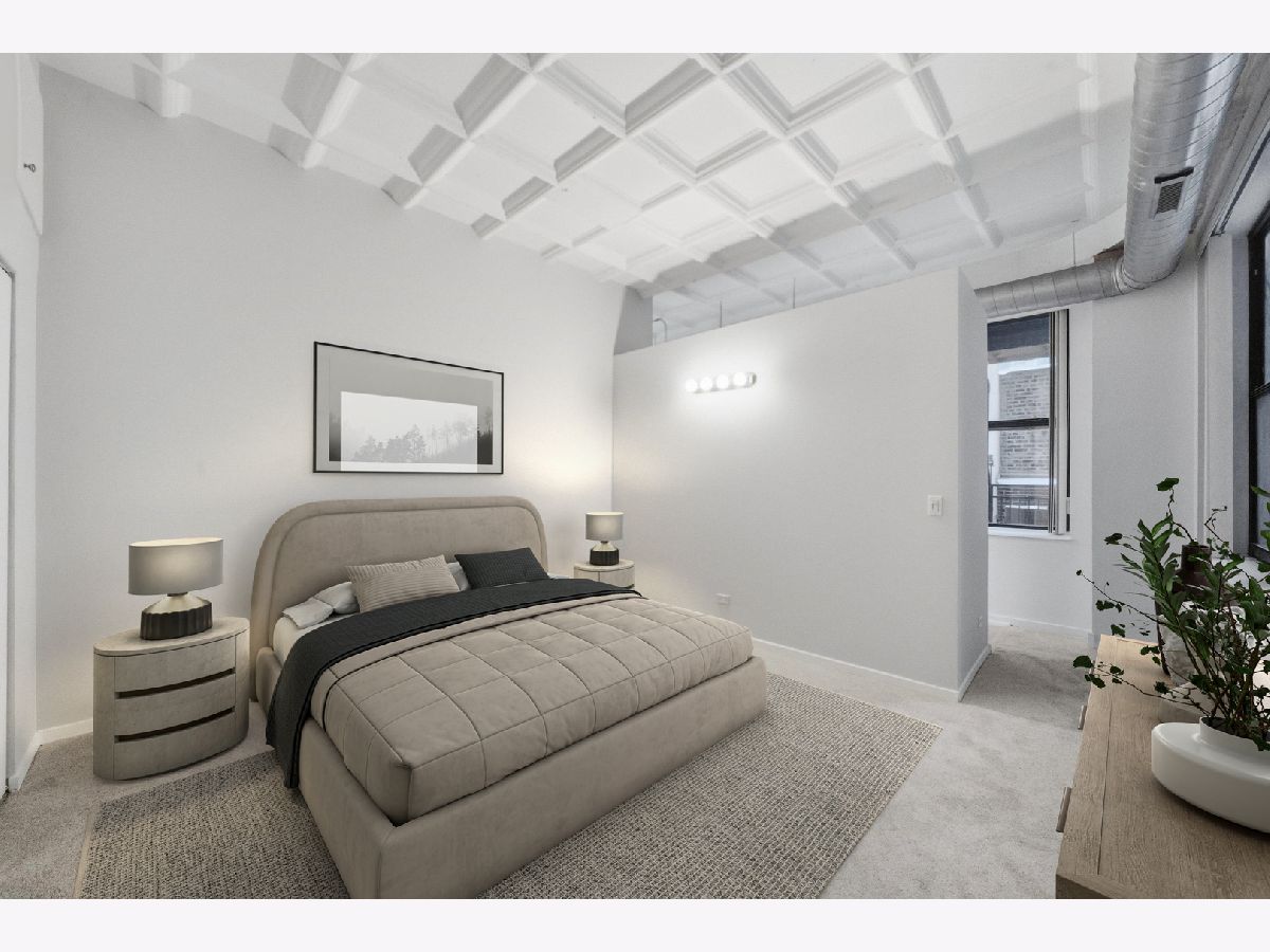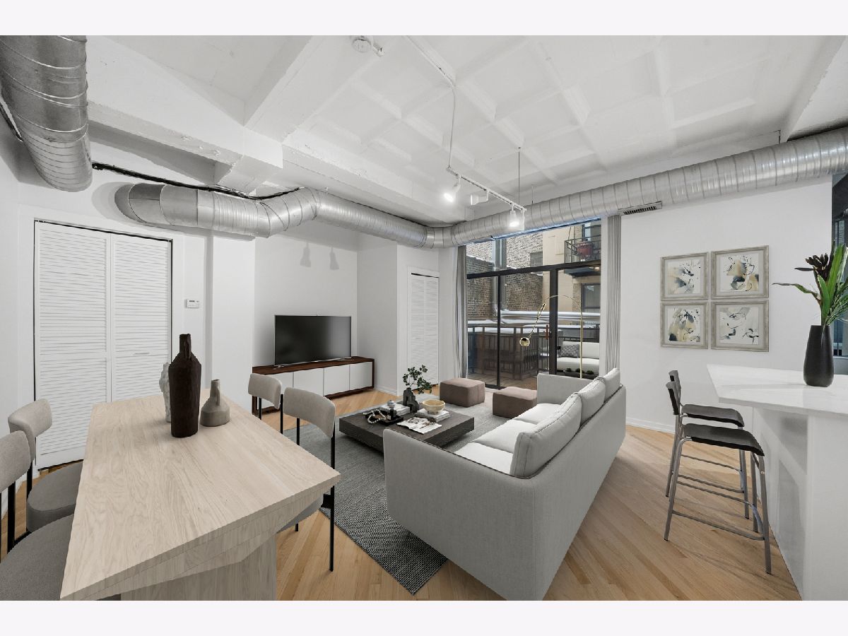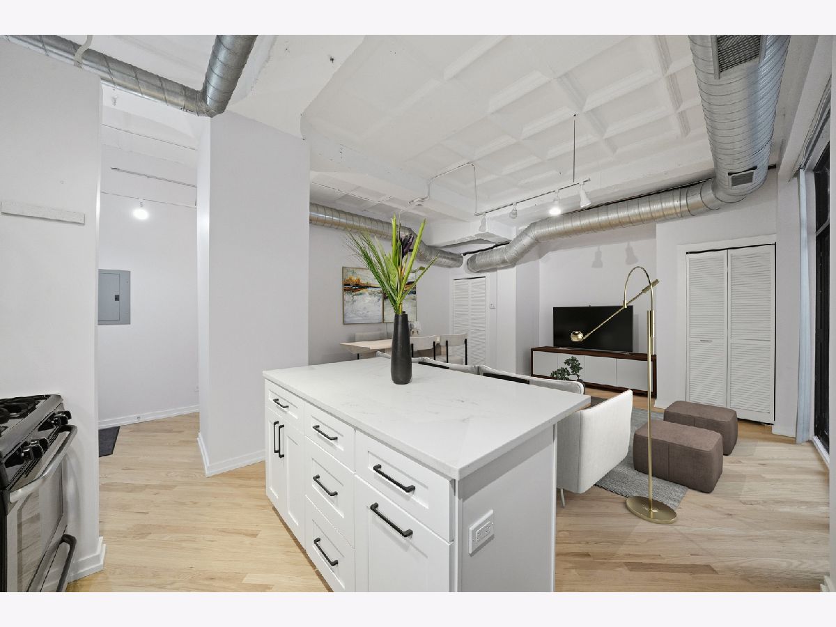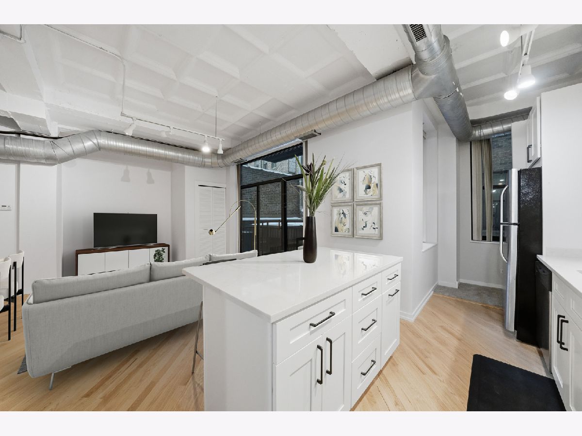 No cookie cutter condo here! Check out this chic and charismatic 800 Sq Ft * 1 bed/1 bath concrete loft in historic Film Exchange Lofts. Converted from Warner Bros corporate offices, this south-facing unit features 11 ft coffered ceilings, a big open concept living and dining area which flows seamlessly out to a large private patio perfect for relaxing with a cup of coffee entertaining with a glass of wine. Recent improvements and updates include: new kitchen with modern white shaker soft close cabinets and drawers, white quartz countertops, hexagon tile backsplash, deep single basin sink, with matte black faucet and kitchen hardware, refinished white oak hardwood floors, fresh paint throughout, new carpet in bedroom, updated lighting, new furnace (2017), and upgraded in-unit washer/dryer and microwave. FEL is a professionally managed boutique elevator building with extra storage and bike storage included. Unbeatable location in the heart of the South Loop, baby steps from tons of locals favorite restaurants, Trader Joe's, Grant & Millennium Parks, Lakefront Bike/Jogging Trail, Museum Campus, and easy CTA and expressway access. One heated garage parking spot offered for $25K additional.