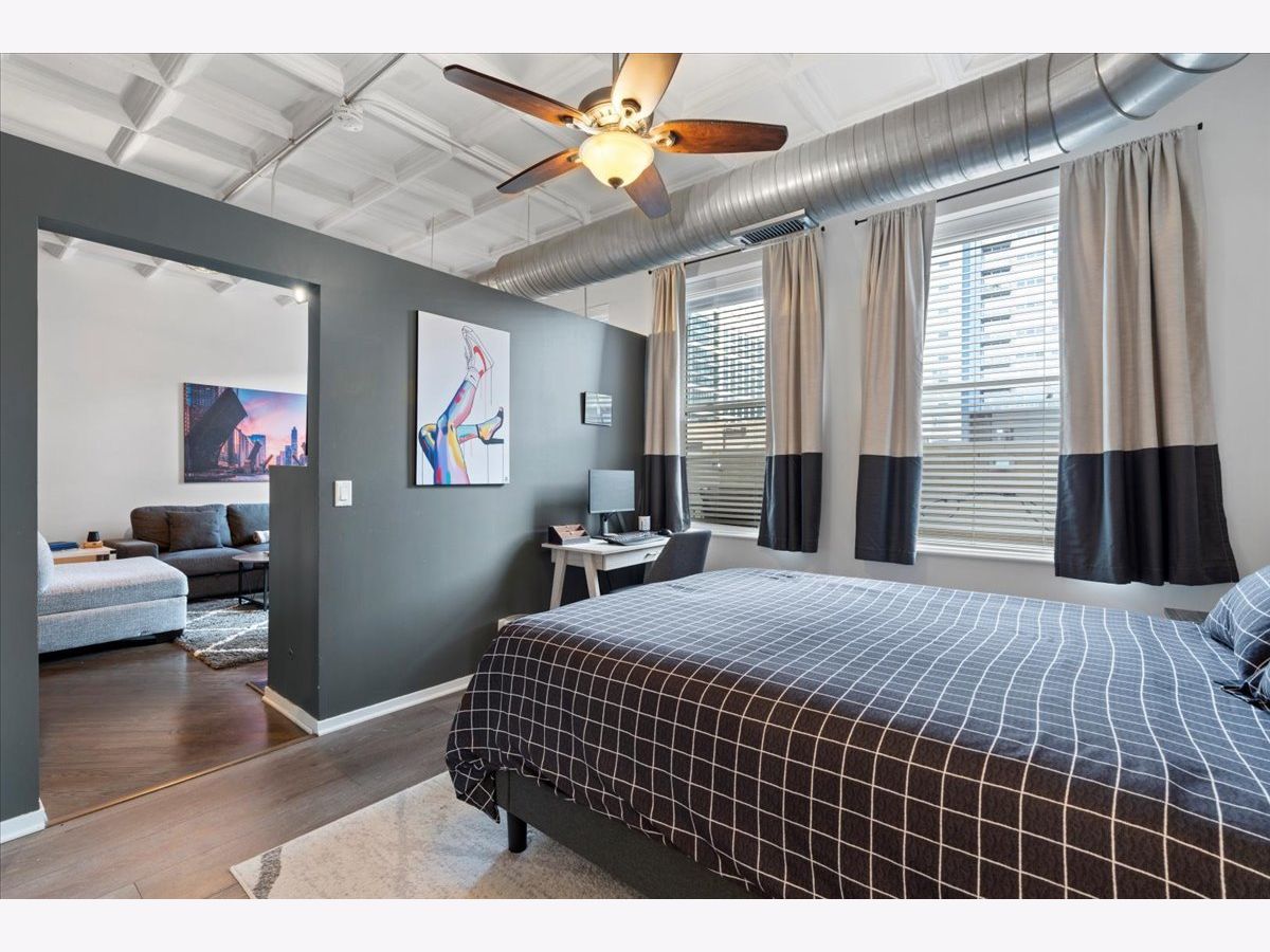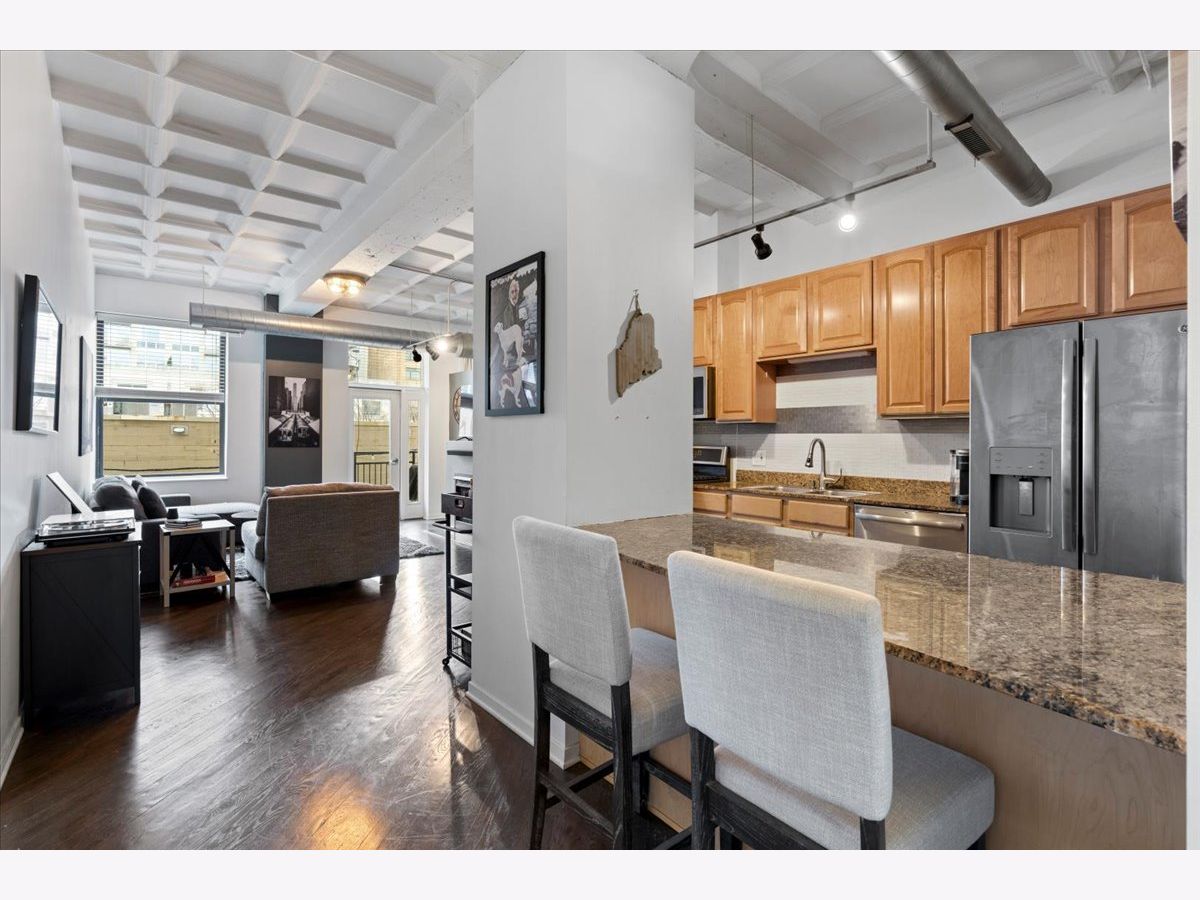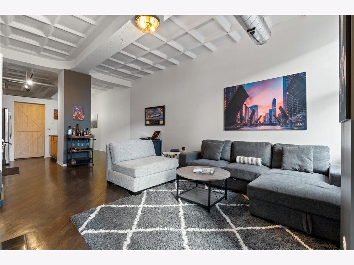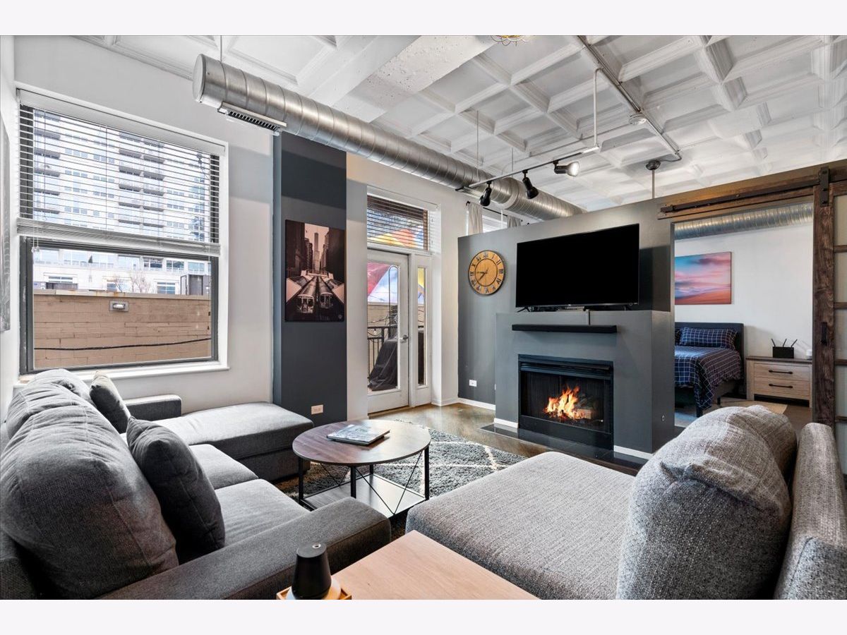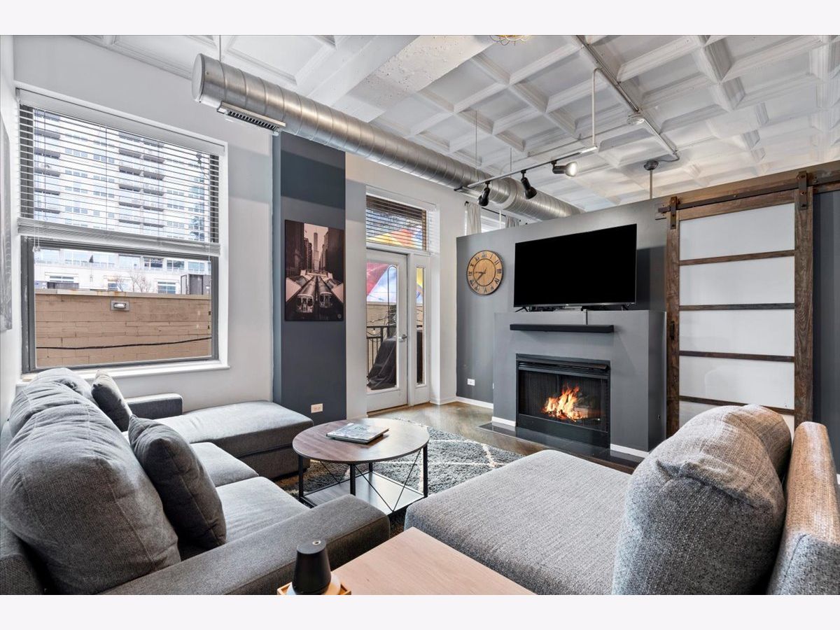 Bright and sunny split 2 bedroom 2 full bath at historic art deco Film Exchange Lofts built originally for Warner Brothers. 11 foot Coffered ceiling, gas fireplace, diagonal hardwood floors, huge windows and balcony - kitchen with stone counters, stainless steel appliances and over-sized island - Separate utility room with stack/washer dryer. Primary bedroom has walk-in closet - Double bowl vanity and separate shower in primary bath. Prime parking space #23 on first level of heated garage additional $35K. Investor friendly and no rental cap. Perfect location. Close to all public transportation, City parks, playgrounds, South Loop Elementary, British, Old St. Marys, Daystar & Jones College Prep schools. Walk to Loop, Target, Jewel, Marianos, Trader Joes, Whole Foods, Roosevelt Collection movies, shops, museums, Grant/Millennium Parks and Lake Michigan. Easy access to all highways 90/94, 55, 290 and Lake Shore Drive