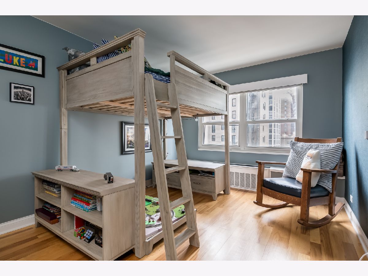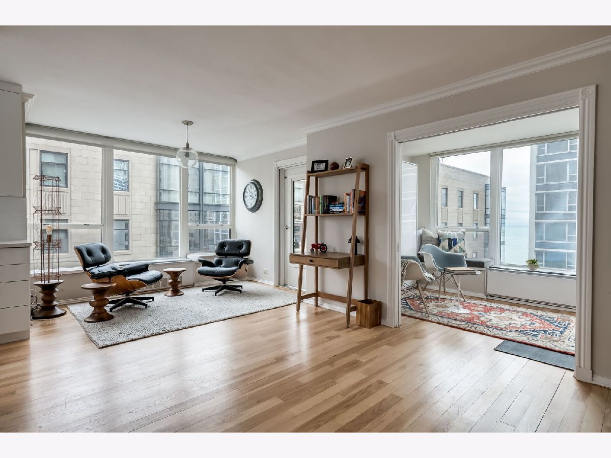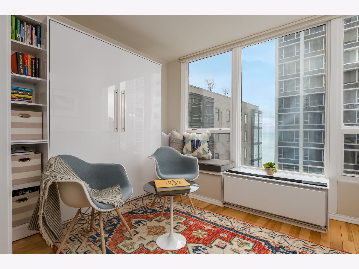 At 2,300 square feet, this exceptional corner residence delivers scale and sophistication in this primely located building in the heart of the Gold Coast. With north, east and west exposures and two private balconies, the four-bedroom, two-bathroom layout feels expansive yet intentionally zoned across a single level. A gallery style entry introduces a central moment that unfolds into two distinct, connected living spaces designed for both entertaining and everyday comfort. Designer lighting from Lightology dresses the home's clean lines with hickory hardwood flooring spanning the interiors and oversized windows capturing abundant light and rich, colorful textures from the fabled streetscape and blue waters of Lake Michigan. An impressive, oversized quartz waterfall island anchors the kitchen offering generous seating and prep space. Custom white cabinetry framed in warm wood adds depth, while stainless steel appliances integrate cleanly alongside a wine refrigerator and thoughtful storage. The space flows seamlessly into the northeast corner family room, wrapped in windows and connected to a private balcony that offers a glimpse of the lake and city below. The east-facing primary suite is set apart for privacy, layered in rich tones that create depth and calm. A generous walk-in closet with custom organization separates the sleeping quarters from the tranquil en-suite bath with a floating dual vanity with integrated lighting, heated towel rack and oversized glass-enclosed shower. Just beyond, framed by pocket doors, a flexible room functions as an office or guest suite, complete with a custom Murphy bed ideal for visitors. Across the residence, the dedicated dining area, defined by a full wall of custom built-ins set against designer wallpaper, extends into the formal living room, creating a gracious entertaining space. Integrated cabinetry and shelving provide storage and structure, while corner windows and a second private balcony offer another invitation outdoors. Two additional bedrooms reside in the west wing with customized closets and a full secondary bath. A dedicated laundry closet includes a new Bosch electric stack with space for shelving and storage. Just off the home's main entry sits a large, built-in mudroom with exceptional storage. 1313 Ritchie offers full-amenity living with 24-hour door staff, on-site maintenance, an outdoor pool and sundeck, fitness center, party room, bike storage, dry cleaning and salon. Substantial, recent updates include a 2023 driveway and pool refresh, 2022 facade restoration with balcony upgrades and new canopy, and a building-wide plumbing riser replacement fully paid by the current owner with elegant hallway renovations slated for completion by May. Two deeded garage parking spaces and storage locker are included in price. Ideally perched in the heart of the historic Gold Coast, just moments from Oak Street Beach, the lakefront trail and the shops and dining within the neighborhood and along Michigan Avenue.