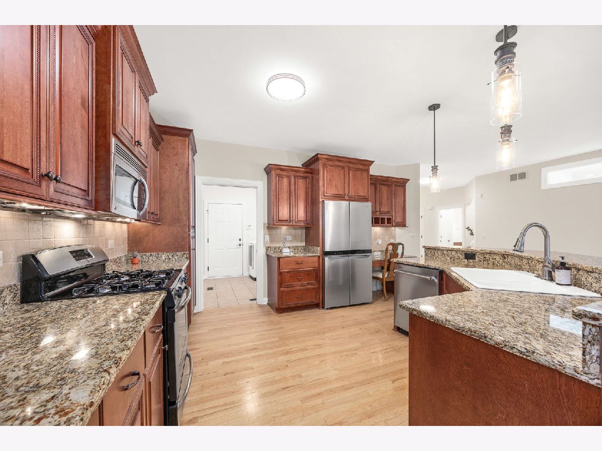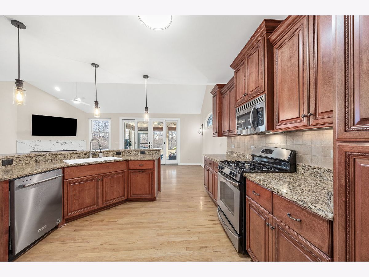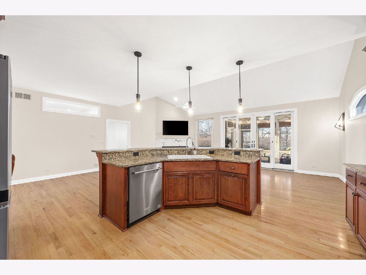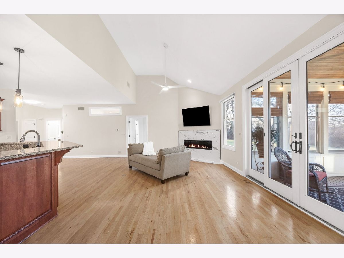 The wait is over! Rarely homes in the Lakelands Club become available! Step inside and get ready to fall in love in this beautifully updated 3 Bedroom, 3 Bath home located in Plainfield's highly sought-after gated Lakelands Club community. With clubhouse access, a pool, and lake rights, this is a lifestyle that truly feels like a retreat. The open floor plan of this home with vaulted ceilings and hardwood floors creates an inviting, light-filled space that's perfect for both everyday living and entertaining. You'll love gathering in the spacious kitchen, where the family room and dining area come together in one large, open space-ideal for hosting holidays, dinner parties, or casual nights in. Kitchen details include granite countertops, Stainless Steel appliances (new Dishwasher and new Refrigerator) and new light fixtures (2025). Cozy up around the brand new fireplace and take in the peaceful views of the surrounding trees. The first-floor den or office with French doors offers wonderful flexibility, whether you need a home office, guest room, or creative space. The main-floor Master Bedroom is a true escape, complete with a fully remodeled bathroom (2025) and a walk-in closet. First-floor laundry makes main-level living effortless. Downstairs, the finished English lookout basement expands your living space with an additional family room featuring a corner fireplace and wet bar, two Bedrooms, a full Bath, and generous storage-perfect for guests, extended family, or entertaining. Start your mornings with a peek of the lake from the front porch, then relax in the covered sunroom surrounded by mature trees and backyard privacy. With recent upgrades including a newer roof and gutters (2020), redone driveway (2021), epoxied garage floor, Tesla charger, and updated mechanicals with a tankless water heater, furnace, humidifier, and A/C, this home is truly move-in ready. Location has quick access to I-55. Residents in the Lakelands community receive full lake rights including Pool & Clubhouse. HOA includes Swimming Pool, Snow removal, Clubhouse, Gym, Scavenger, Landscaping and Common Insurance. This house is the complete package!