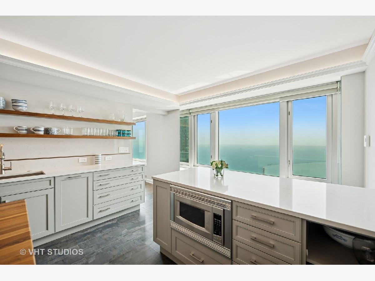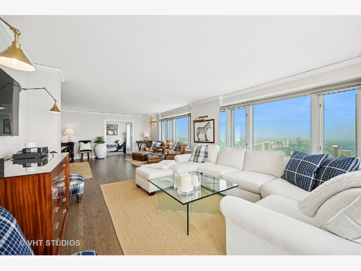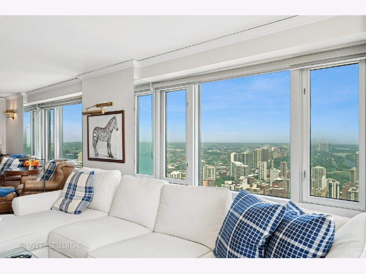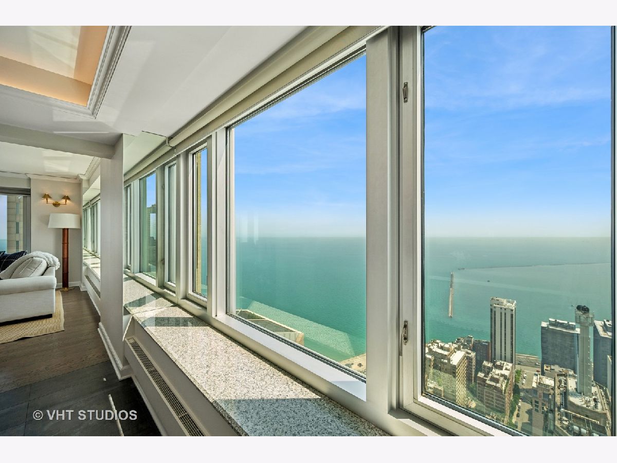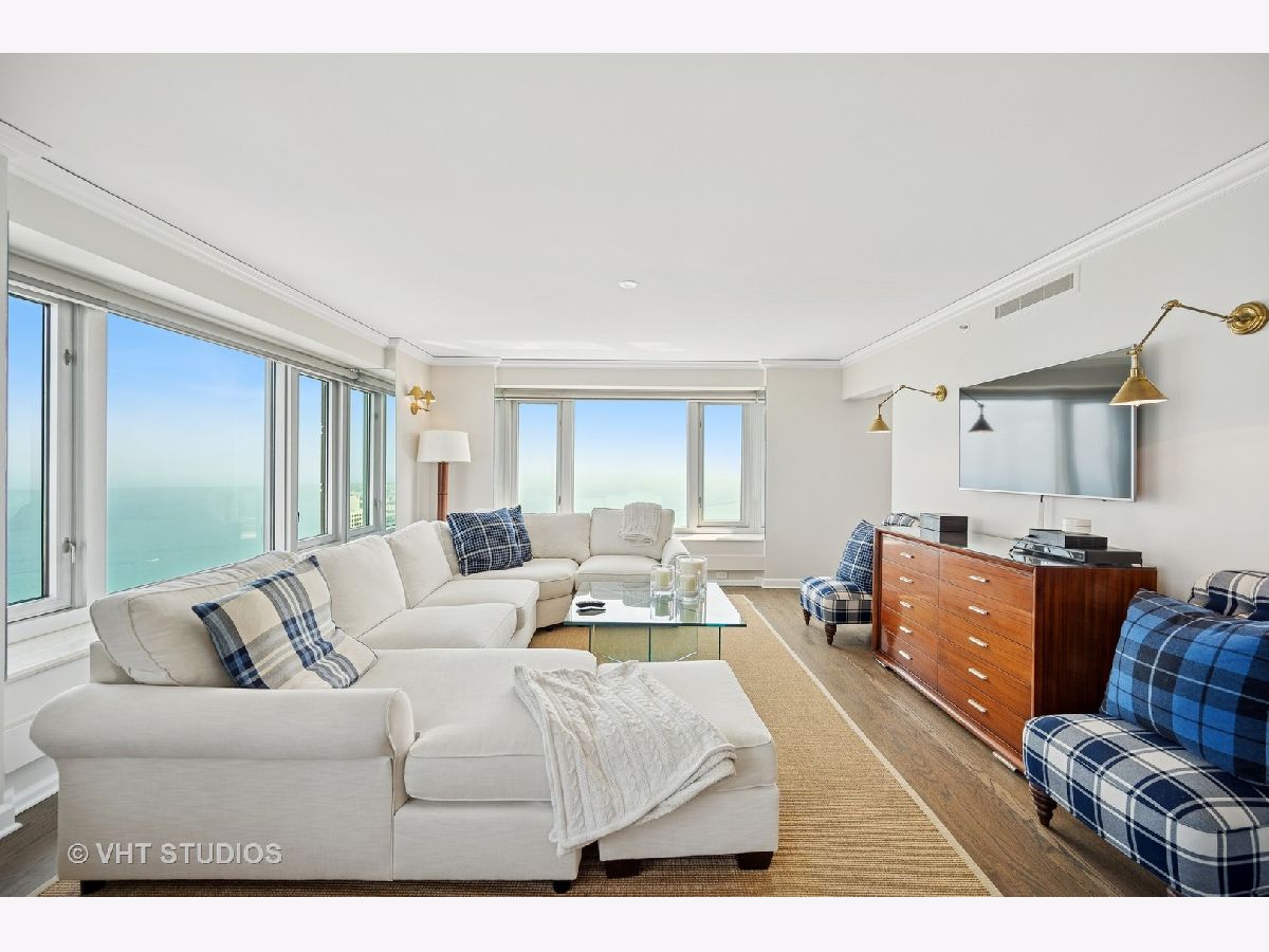 Perched on the 51st floor above the Four Seasons Hotel in Chicago's iconic Gold Coast, this expansive 3 bed, 3 bath corner residence offers panoramic north and east views of Lake Michigan and the city skyline. Renovated in 2017 with a modern, streamlined aesthetic, the home features an open-concept living and dining area, a spacious home office or third bedroom, and wide-plank oak flooring. The chef's kitchen is outfitted with Sub-Zero and Wolf appliances, porcelain tile floors, a striking walnut island, custom two-tone cabinetry, and open shelving for display. The primary suite is a serene retreat with a Victoria & Albert soaking tub overlooking the lake, marble tile, a walk-in shower, and a large dressing room / walk-in closet. The second bedroom includes its own full bath, while a third full bath, in-unit laundry room with storage, and a built-in dry bar offer added convenience. Enjoy full-service living above the Four Seasons Hotel Chicago, with optional access to hotel amenities including room service and spa offerings-all just steps from world-renowned shopping and dining on Michigan Avenue. Don't miss this rare opportunity for turnkey luxury in one of Chicago's most prestigious addresses.