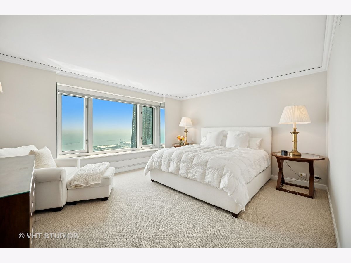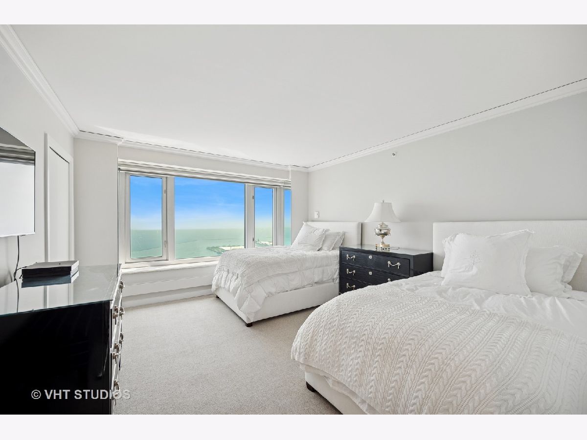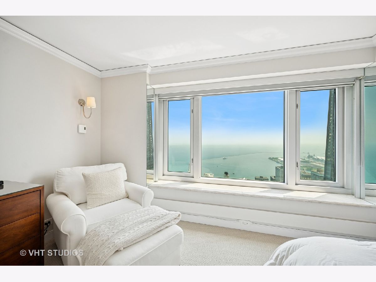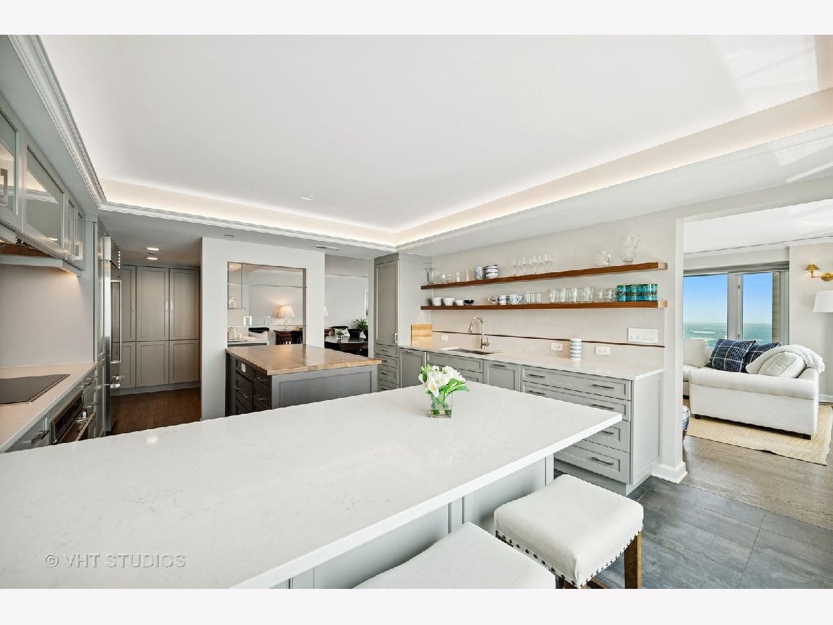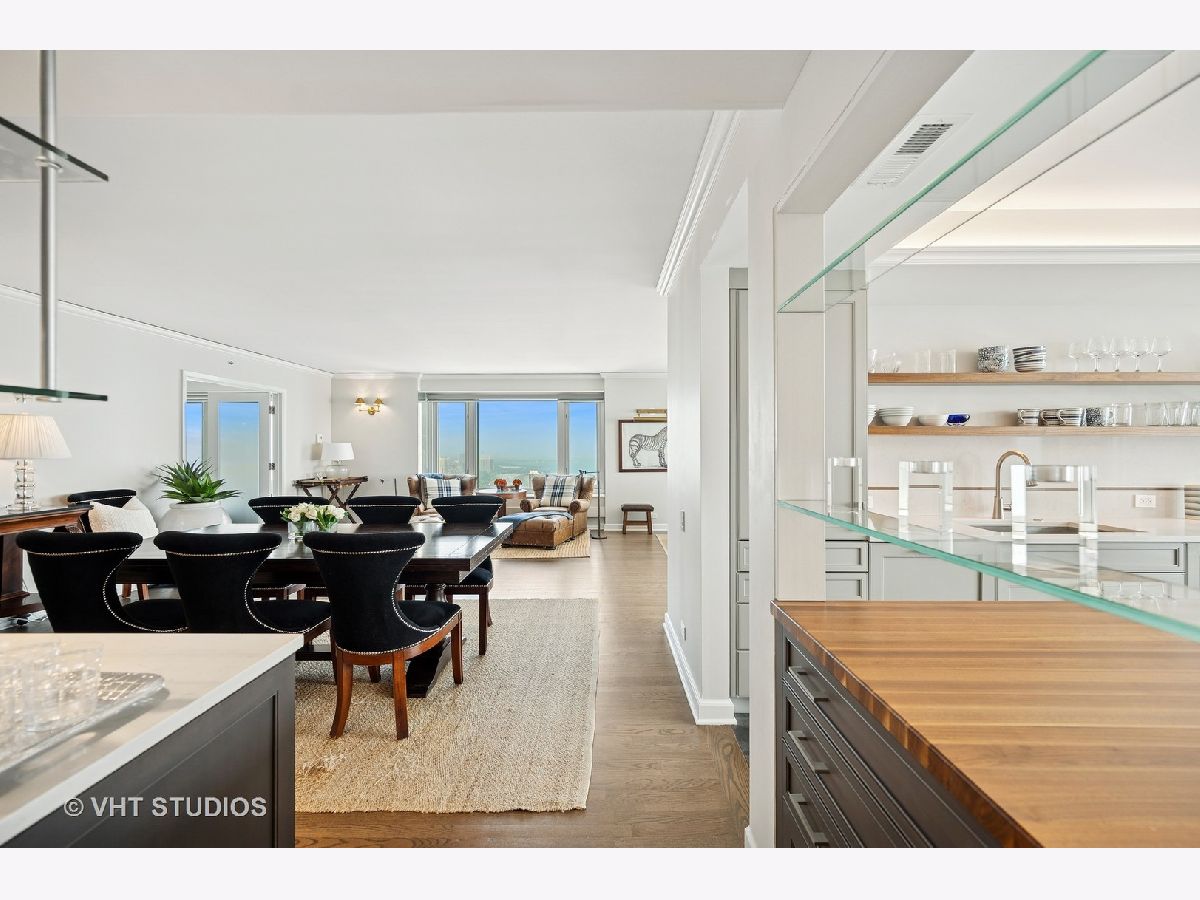 Perched on the 51st floor above the Four Seasons Hotel in Chicago's iconic Gold Coast, this expansive 3 bed, 3 bath corner residence offers panoramic north and east views of Lake Michigan and the city skyline. Renovated in 2017 with a modern, streamlined aesthetic, the home features an open-concept living and dining area, a spacious home office or third bedroom, and wide-plank oak flooring. The chef's kitchen is outfitted with Sub-Zero and Wolf appliances, porcelain tile floors, a striking walnut island, custom two-tone cabinetry, and open shelving for display. The primary suite is a serene retreat with a Victoria & Albert soaking tub overlooking the lake, marble tile, a walk-in shower, and a large dressing room / walk-in closet. The second bedroom includes its own full bath, while a third full bath, in-unit laundry room with storage, and a built-in dry bar offer added convenience. Enjoy full-service living above the Four Seasons Hotel Chicago, with optional access to hotel amenities including room service and spa offerings-all just steps from world-renowned shopping and dining on Michigan Avenue. Don't miss this rare opportunity for turnkey luxury in one of Chicago's most prestigious addresses.