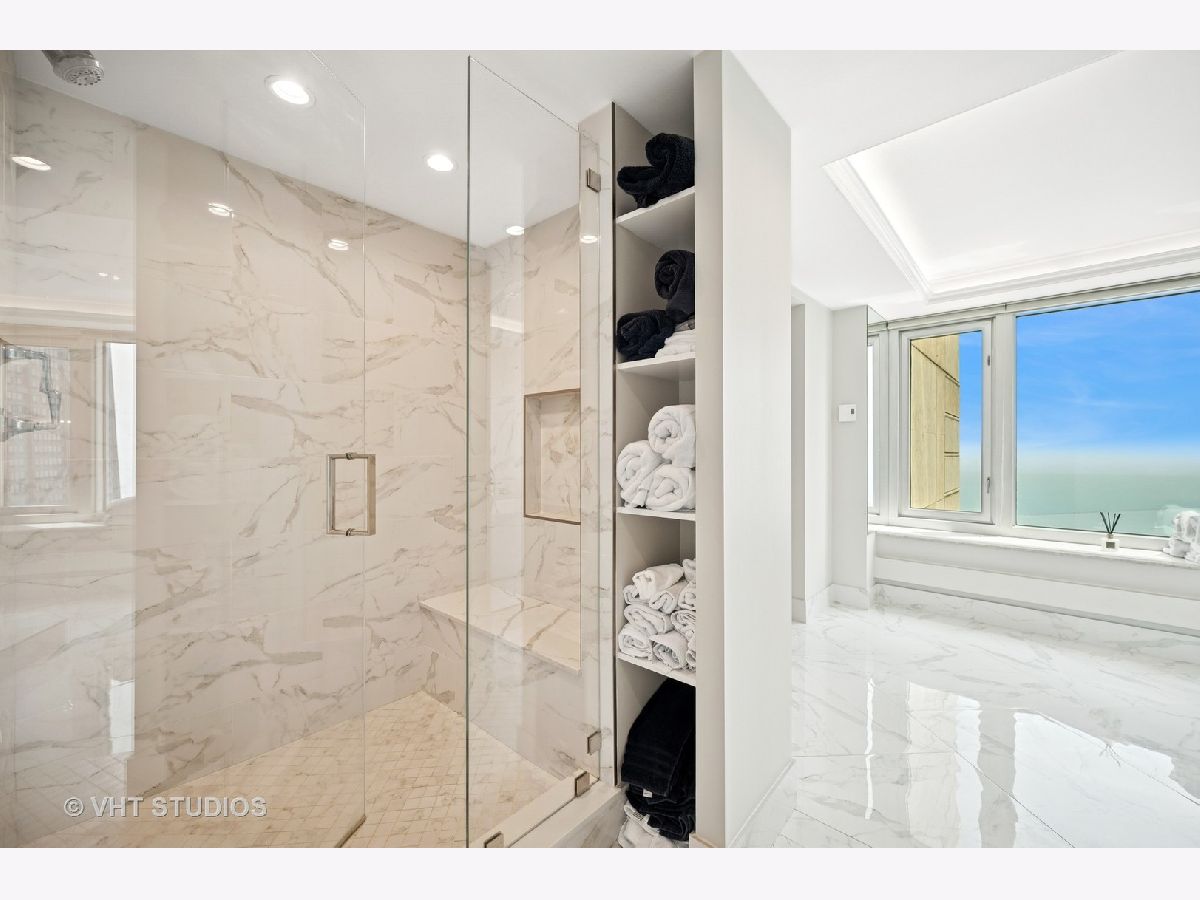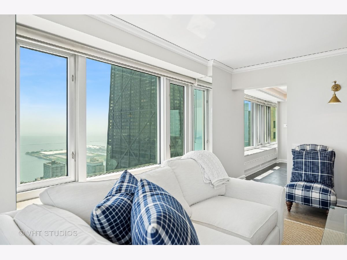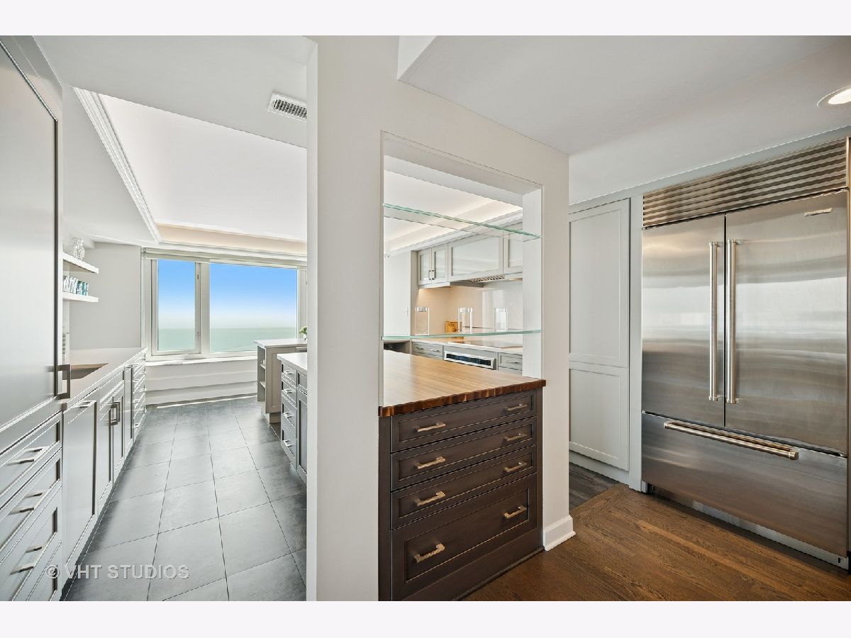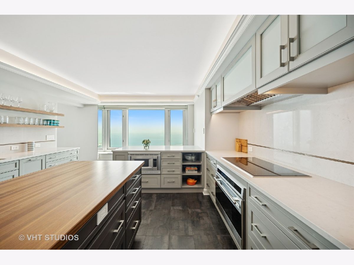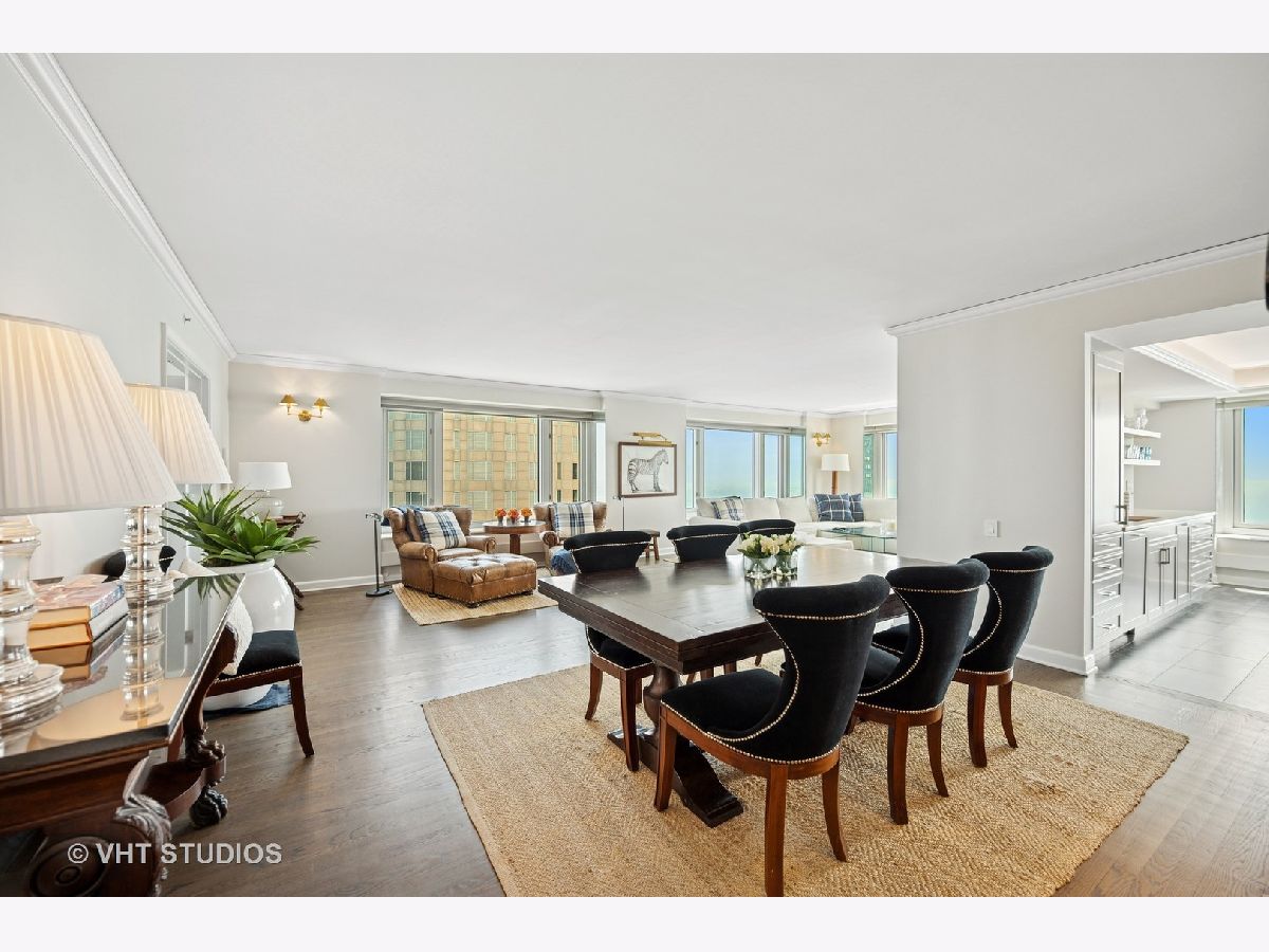 Perched on the 51st floor above the Four Seasons Hotel in Chicago's iconic Gold Coast, this expansive 3 bed, 3 bath corner residence offers panoramic north and east views of Lake Michigan and the city skyline. Renovated in 2017 with a modern, streamlined aesthetic, the home features an open-concept living and dining area, a spacious home office or third bedroom, and wide-plank oak flooring. The chef's kitchen is outfitted with Sub-Zero and Wolf appliances, porcelain tile floors, a striking walnut island, custom two-tone cabinetry, and open shelving for display. The primary suite is a serene retreat with a Victoria & Albert soaking tub overlooking the lake, marble tile, a walk-in shower, and a large dressing room / walk-in closet. The second bedroom includes its own full bath, while a third full bath, in-unit laundry room with storage, and a built-in dry bar offer added convenience. Enjoy full-service living above the Four Seasons Hotel Chicago, with optional access to hotel amenities including room service and spa offerings-all just steps from world-renowned shopping and dining on Michigan Avenue. Don't miss this rare opportunity for turnkey luxury in one of Chicago's most prestigious addresses.