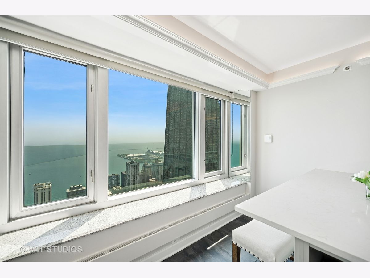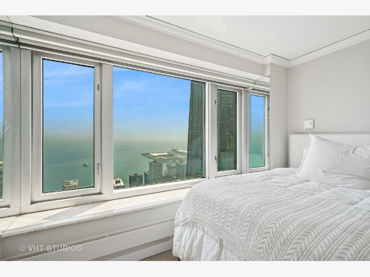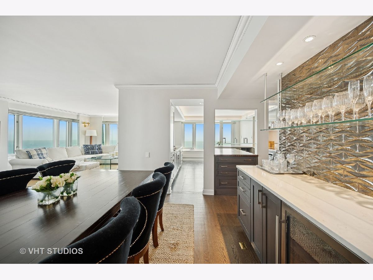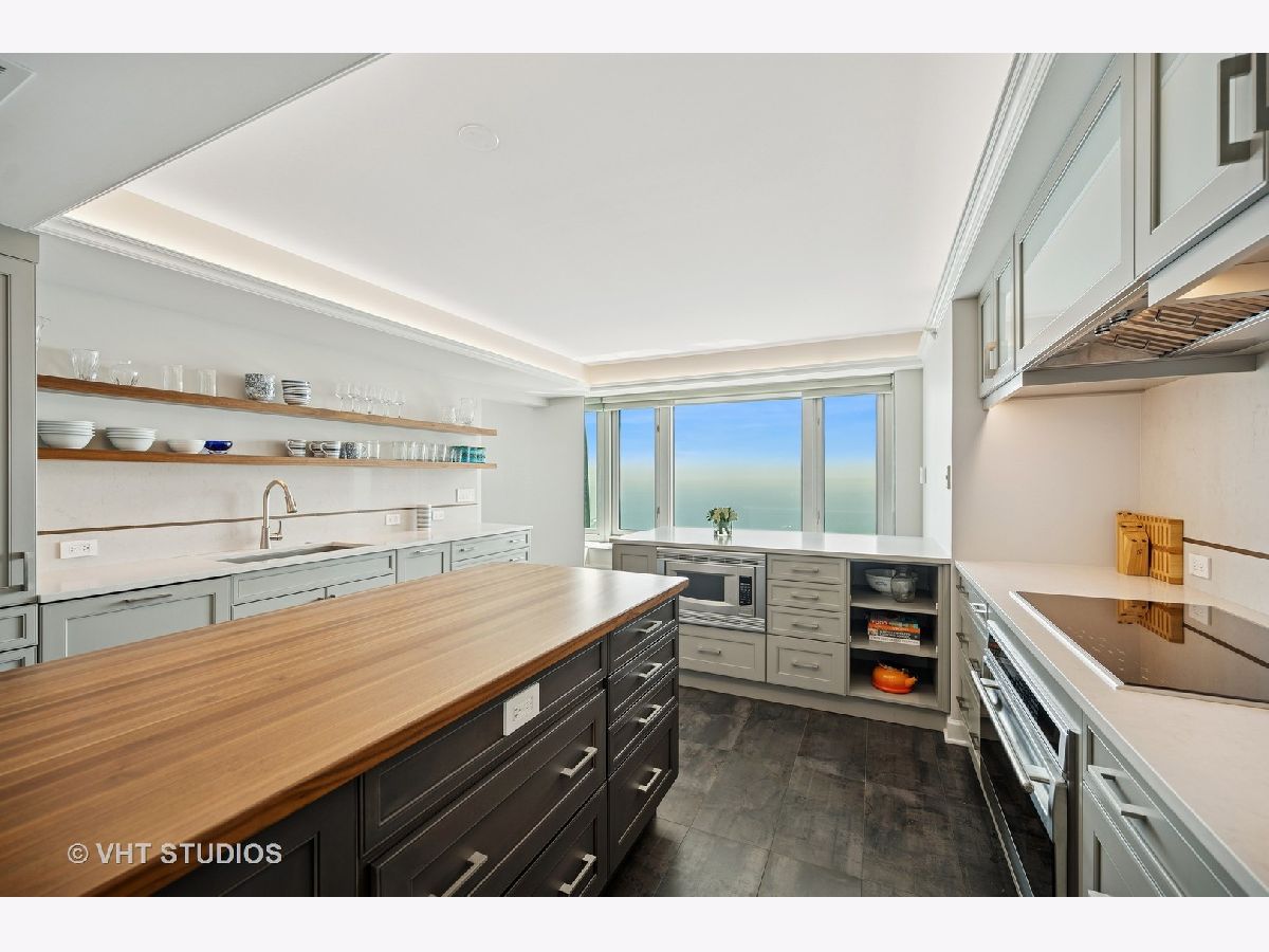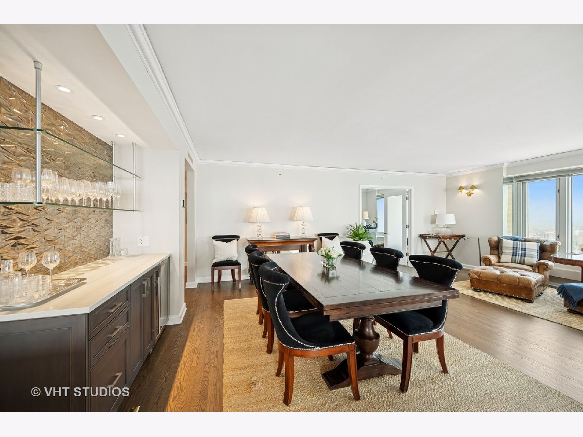 Perched on the 51st floor above the Four Seasons Hotel in Chicago's iconic Gold Coast, this expansive 3 bed, 3 bath corner residence offers panoramic north and east views of Lake Michigan and the city skyline. Renovated in 2017 with a modern, streamlined aesthetic, the home features an open-concept living and dining area, a spacious home office or third bedroom, and wide-plank oak flooring. The chef's kitchen is outfitted with Sub-Zero and Wolf appliances, porcelain tile floors, a striking walnut island, custom two-tone cabinetry, and open shelving for display. The primary suite is a serene retreat with a Victoria & Albert soaking tub overlooking the lake, marble tile, a walk-in shower, and a large dressing room / walk-in closet. The second bedroom includes its own full bath, while a third full bath, in-unit laundry room with storage, and a built-in dry bar offer added convenience. Enjoy full-service living above the Four Seasons Hotel Chicago, with optional access to hotel amenities including room service and spa offerings-all just steps from world-renowned shopping and dining on Michigan Avenue. Don't miss this rare opportunity for turnkey luxury in one of Chicago's most prestigious addresses.