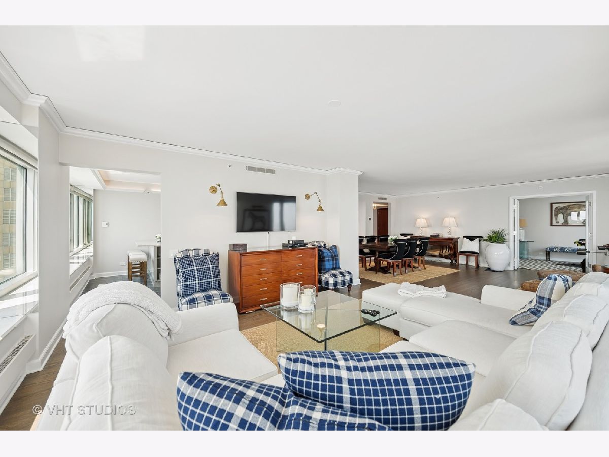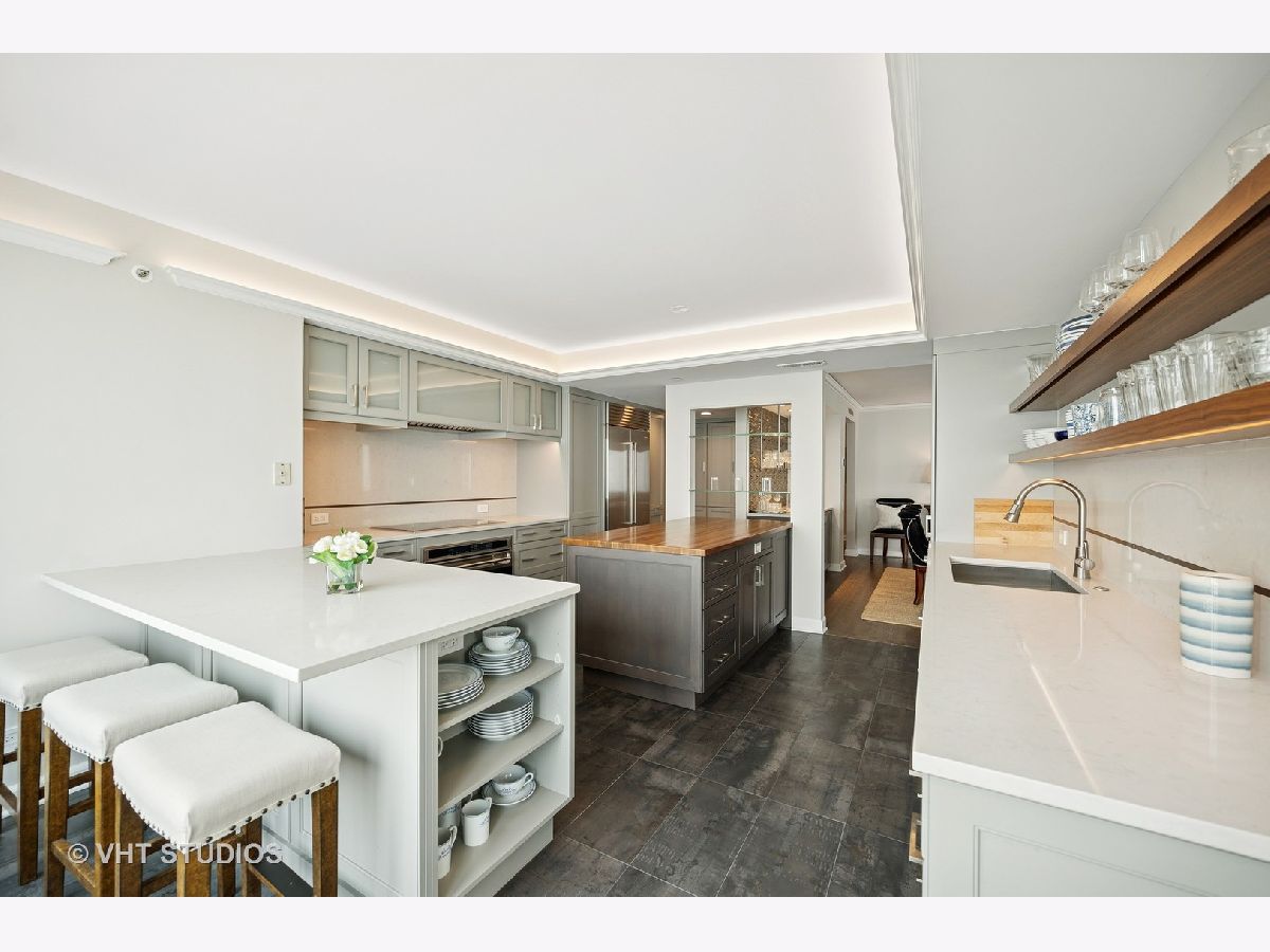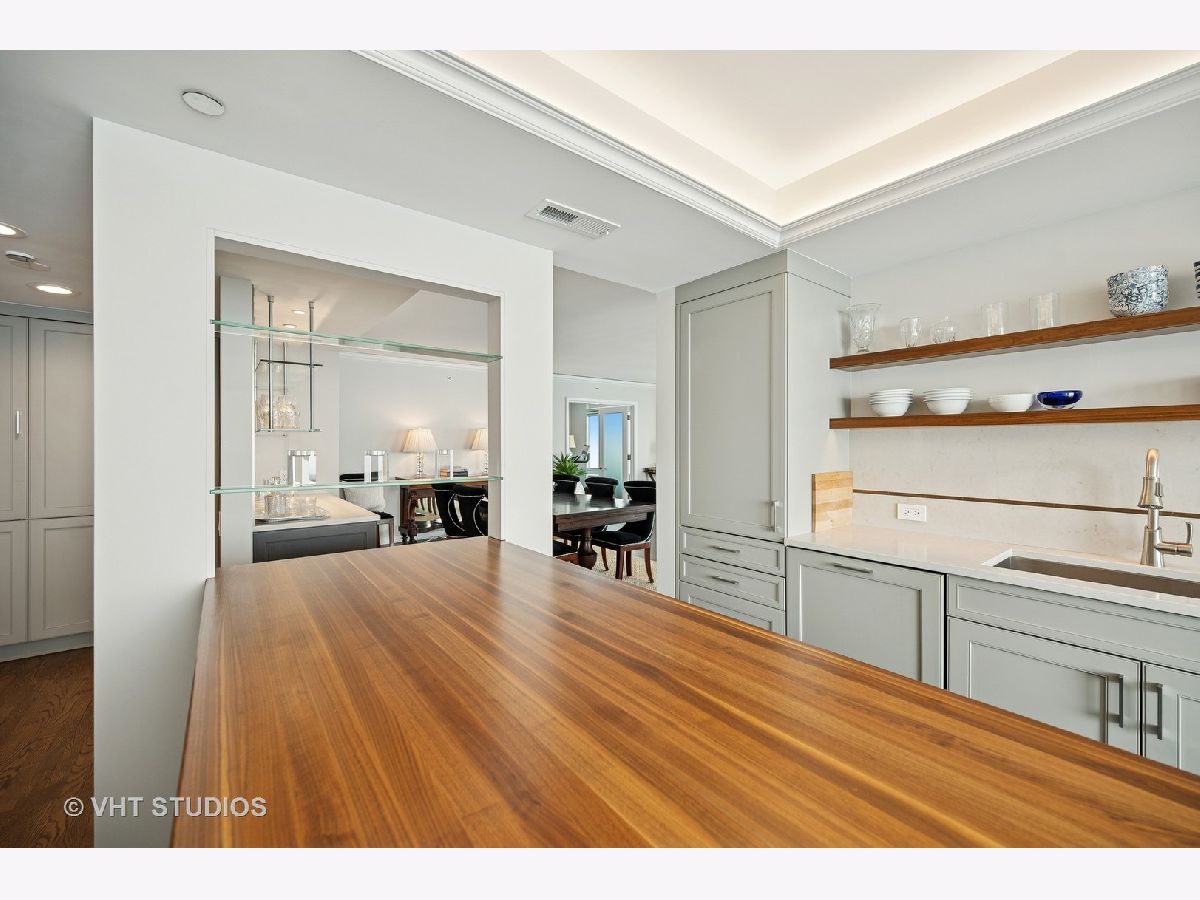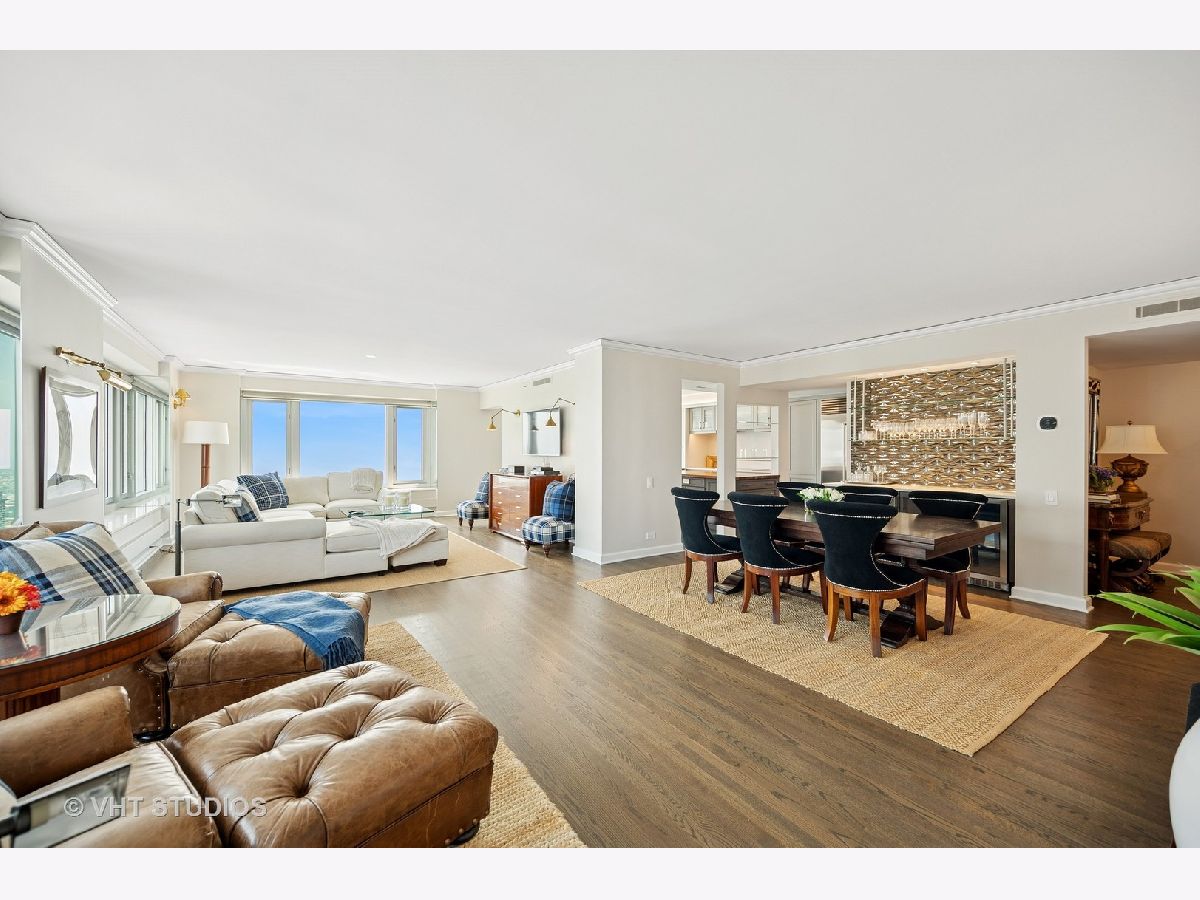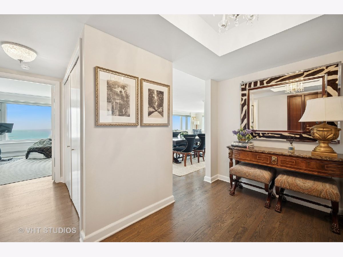 Perched on the 51st floor above the Four Seasons Hotel in Chicago's iconic Gold Coast, this expansive 3 bed, 3 bath corner residence offers panoramic north and east views of Lake Michigan and the city skyline. Renovated in 2017 with a modern, streamlined aesthetic, the home features an open-concept living and dining area, a spacious home office or third bedroom, and wide-plank oak flooring. The chef's kitchen is outfitted with Sub-Zero and Wolf appliances, porcelain tile floors, a striking walnut island, custom two-tone cabinetry, and open shelving for display. The primary suite is a serene retreat with a Victoria & Albert soaking tub overlooking the lake, marble tile, a walk-in shower, and a large dressing room / walk-in closet. The second bedroom includes its own full bath, while a third full bath, in-unit laundry room with storage, and a built-in dry bar offer added convenience. Enjoy full-service living above the Four Seasons Hotel Chicago, with optional access to hotel amenities including room service and spa offerings-all just steps from world-renowned shopping and dining on Michigan Avenue. Don't miss this rare opportunity for turnkey luxury in one of Chicago's most prestigious addresses.
