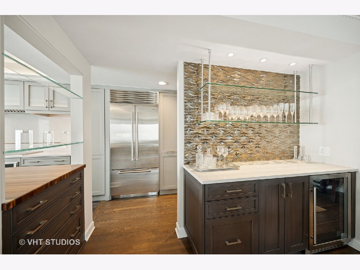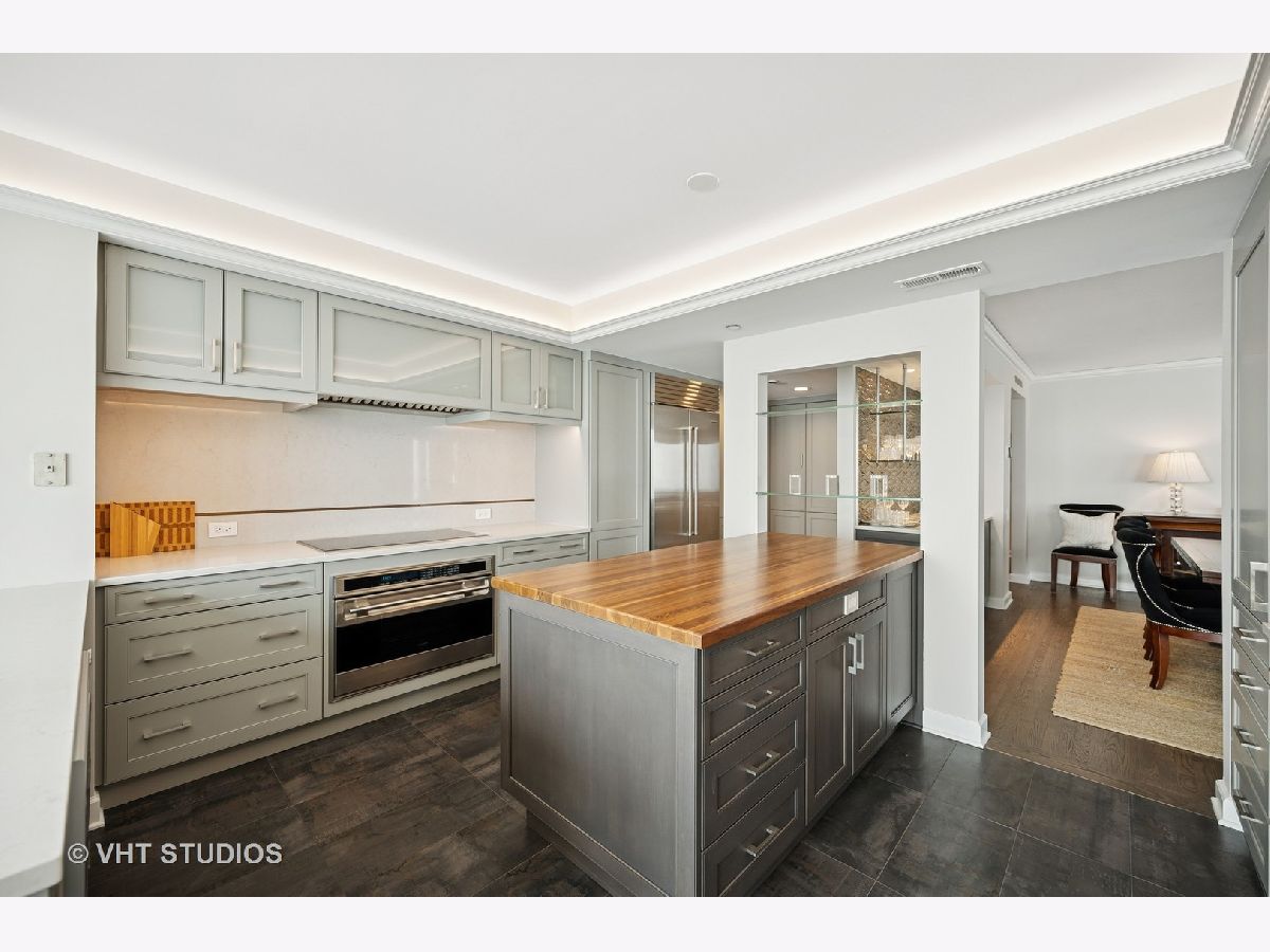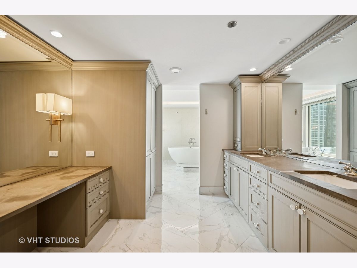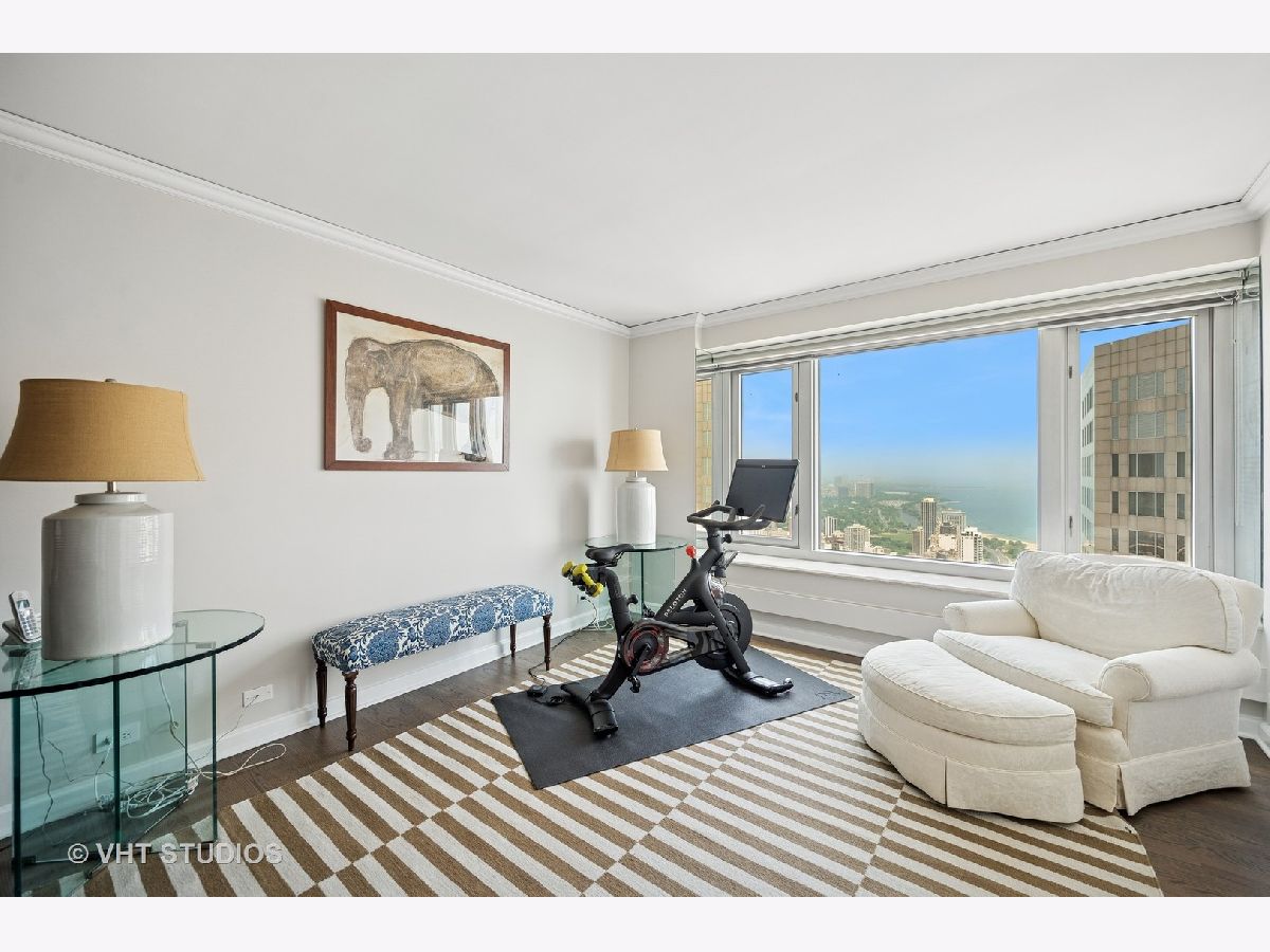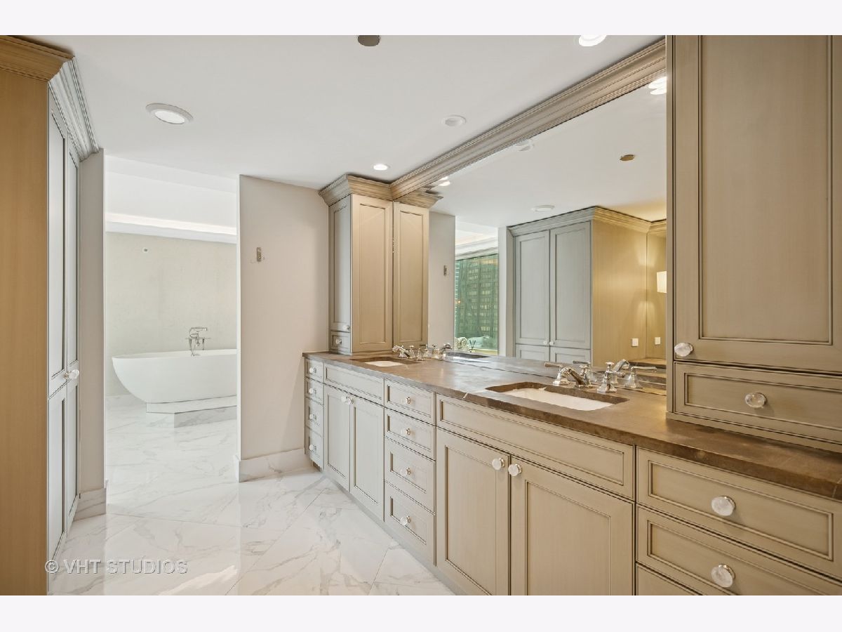 Perched on the 51st floor above the Four Seasons Hotel in Chicago's iconic Gold Coast, this expansive 3 bed, 3 bath corner residence offers panoramic north and east views of Lake Michigan and the city skyline. Renovated in 2017 with a modern, streamlined aesthetic, the home features an open-concept living and dining area, a spacious home office or third bedroom, and wide-plank oak flooring. The chef's kitchen is outfitted with Sub-Zero and Wolf appliances, porcelain tile floors, a striking walnut island, custom two-tone cabinetry, and open shelving for display. The primary suite is a serene retreat with a Victoria & Albert soaking tub overlooking the lake, marble tile, a walk-in shower, and a large dressing room / walk-in closet. The second bedroom includes its own full bath, while a third full bath, in-unit laundry room with storage, and a built-in dry bar offer added convenience. Enjoy full-service living above the Four Seasons Hotel Chicago, with optional access to hotel amenities including room service and spa offerings-all just steps from world-renowned shopping and dining on Michigan Avenue. Don't miss this rare opportunity for turnkey luxury in one of Chicago's most prestigious addresses.