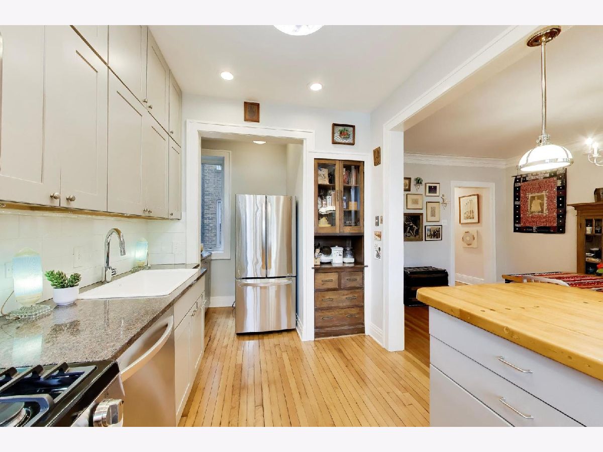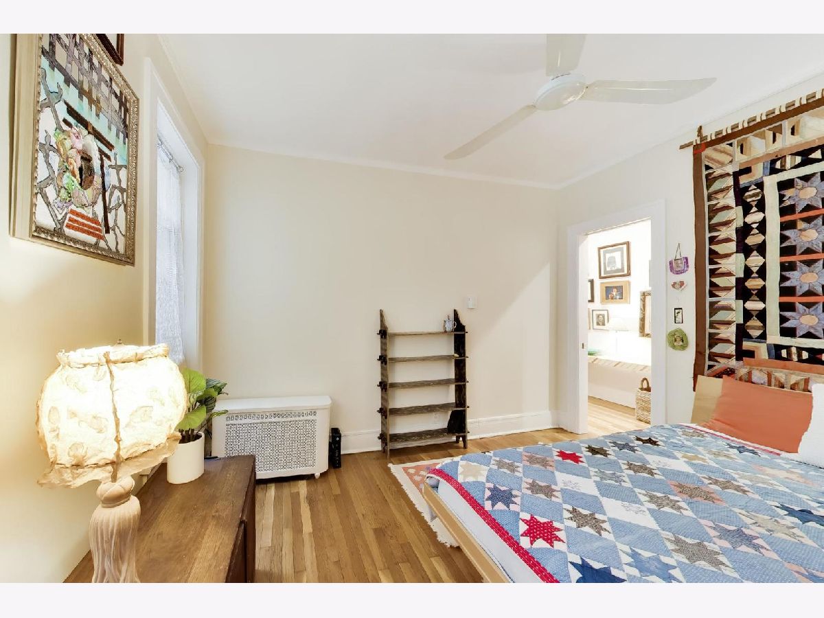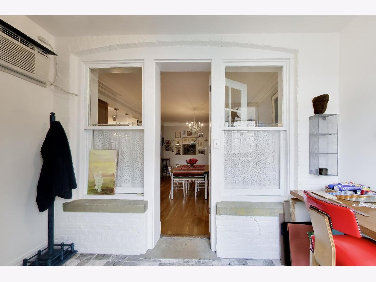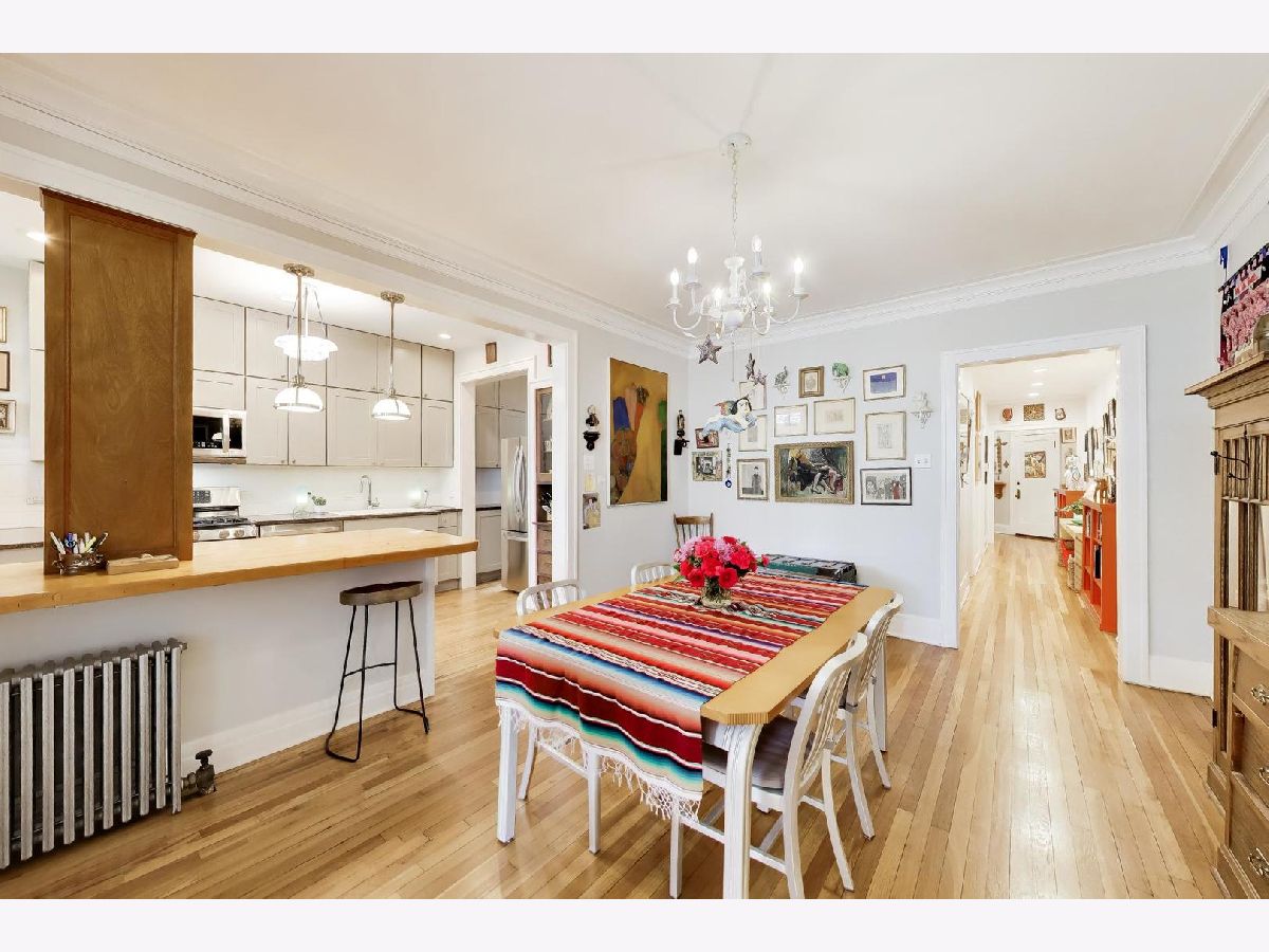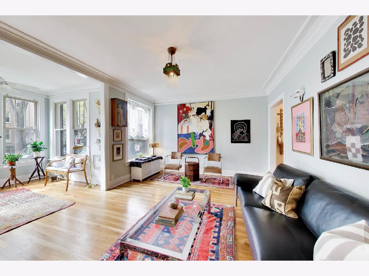 Bright and spacious vintage 2 bed, 2 bath home in a charming 6-flat building located in East Rogers Park on a quiet, tree lined block with a beautifully landscaped front entry. As you step in, the living room is filled with natural light from large windows and features a gas fireplace with a classic mantel, recently installed and operated by remote control, framed by built in bookshelves. The space flows seamlessly into a front sunroom, creating a perfect sitting area or reading nook. Hardwood floors, crown molding, and thoughtful updates run throughout, blending with the home's vintage character. A long hallway provides great separation and leads to a formal dining room with original built ins, offering an ideal setup for entertaining. The fully renovated kitchen stands out with new cabinetry, updated stainless steel appliances, and a one of a kind island crafted from a refinished bowling alley, along with a charming built in detail that ties in the vintage feel. Off the back, an additional sunroom or bonus space features great natural light, newer flooring, and an extra closet, making it perfect for a home office, workspace, or additional storage. Both bedrooms are tucked down the hallway for added privacy. The primary bedroom includes a walk in closet and an updated en suite bath with a newer vanity and a glass enclosed walk in shower with tub. The second bedroom is well sized and positioned down the hall, offering flexibility for guests or a home office. The second full bath is located just next to the bedroom and has been updated with a newer vanity and a walk in shower. Very large basement includes common laundry with washer and dryer, a dedicated storage unit, and additional space for bikes or extra storage. Well maintained building with lush front and back yard greenery. Garage parking included. Conveniently located near Loyola Park, the lakefront, Red Line, Loyola University, and neighborhood dining and shopping.