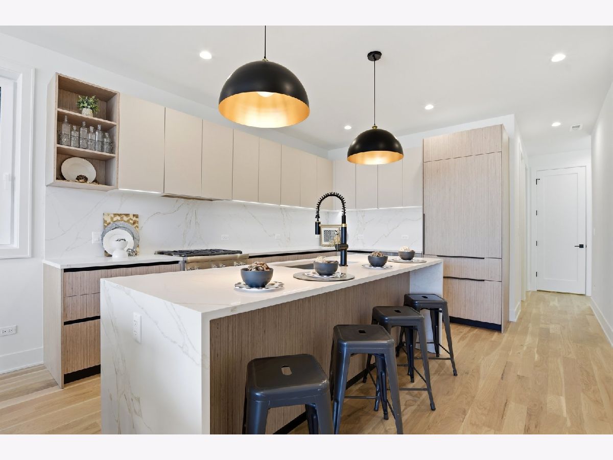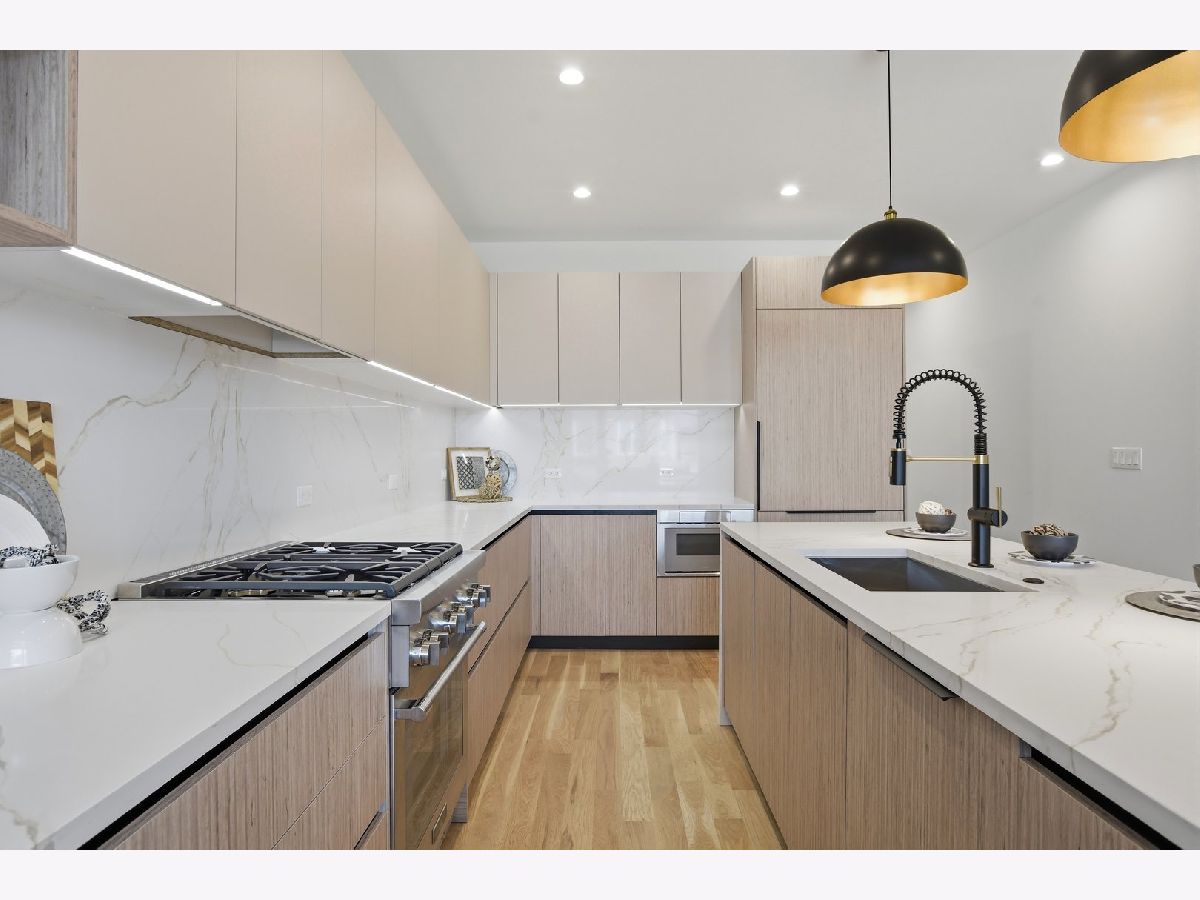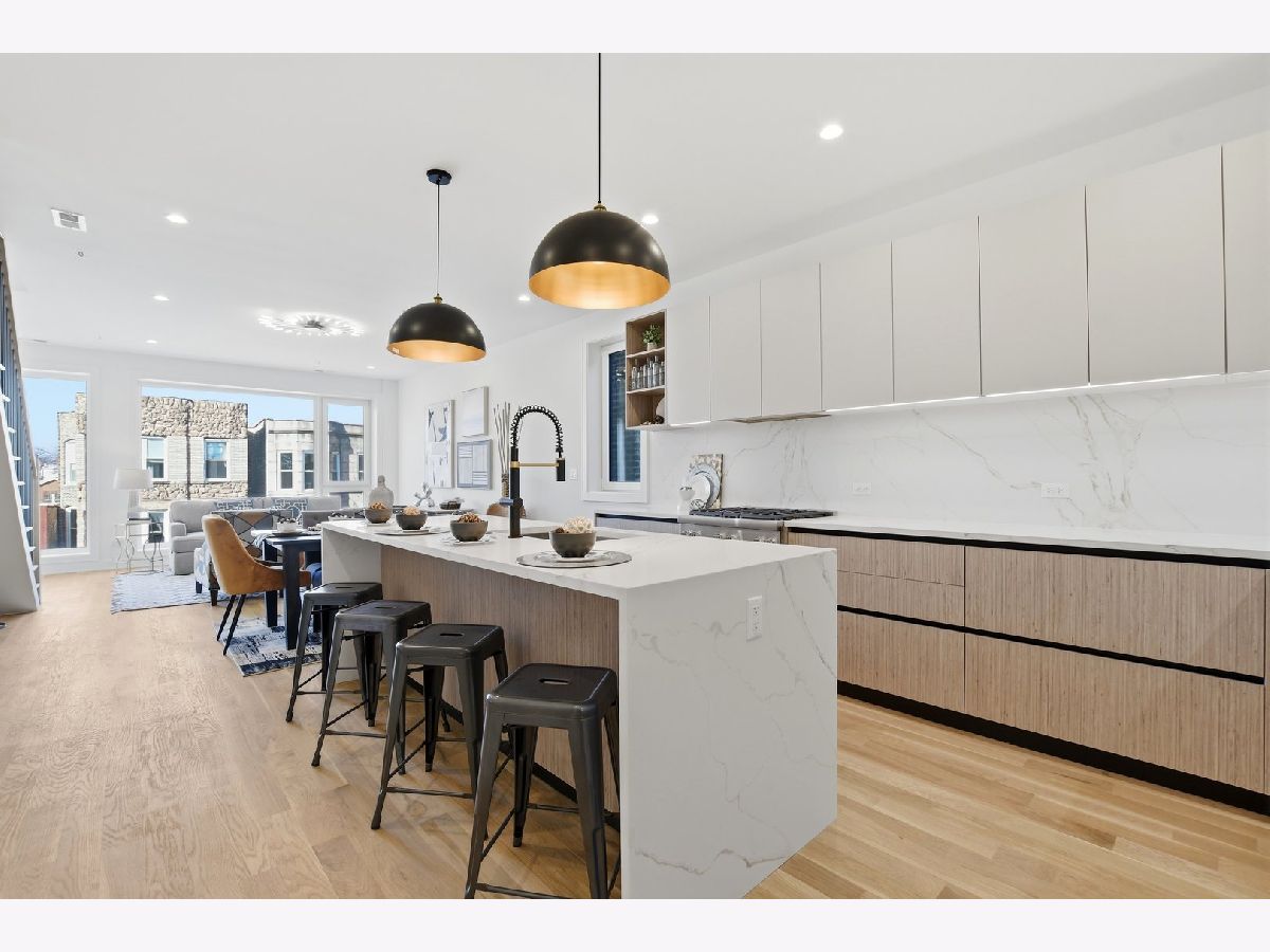 Experience elevated living in this brand-new Duplex Up in the heart of Ukrainian Village. Spanning approximately 2,400 square feet, this exceptional 3-bedroom, 3.5-bath residence offers two expansive levels of thoughtfully designed living space with luxury finishes throughout. The main level features a bright, open-concept layout anchored by massive, floor-to-ceiling west-facing European tilt-and-turn windows, delivering abundant natural light along with superior insulation and soundproofing. Wide-plank flooring and designer lighting add warmth and sophistication. The chef's kitchen showcases custom European cabinetry, quartz countertops with a dramatic waterfall edge and full-height backsplash, and a premium Thermador appliance package with a fully integrated refrigerator and dishwasher. A custom built-in bench with hooks and a spacious pantry provide both style and function. Down the hall, you'll find oversized bedrooms and spa-inspired baths adorned with large-format tile and high-end finishes. The primary suite offers peaceful eastern exposure, a generous walk-in closet, and a luxurious bath complete with a soaking tub, double vanity, and separate glass-enclosed shower. Upstairs, a stunning second level opens to a spacious family room with a fireplace, wet bar, and built-in European cabinetry featuring onyx quartz, floating shelves, and a dedicated beverage station. Floor-to-ceiling east-facing glass doors lead to an impressive 600+ square-foot private roof deck equipped with a Luvar System pergola and sweeping views of the Chicago skyline-perfect for entertaining. This level also offers the option for a second primary suite with dramatic windows and a private en-suite bath. Additional highlights include top-tier mechanicals with a tankless water heater, high-efficiency furnace, central AC, and humidifier. The home also features two private outdoor spaces, a carport garage space with an EV charger, and a one-year builder's warranty. Ready for immediate occupancy. Ideally located near Division Street and all the dining, shopping, parks, and CTA access that Ukrainian Village and Wicker Park have to offer, this home perfectly blends modern luxury with neighborhood charm.