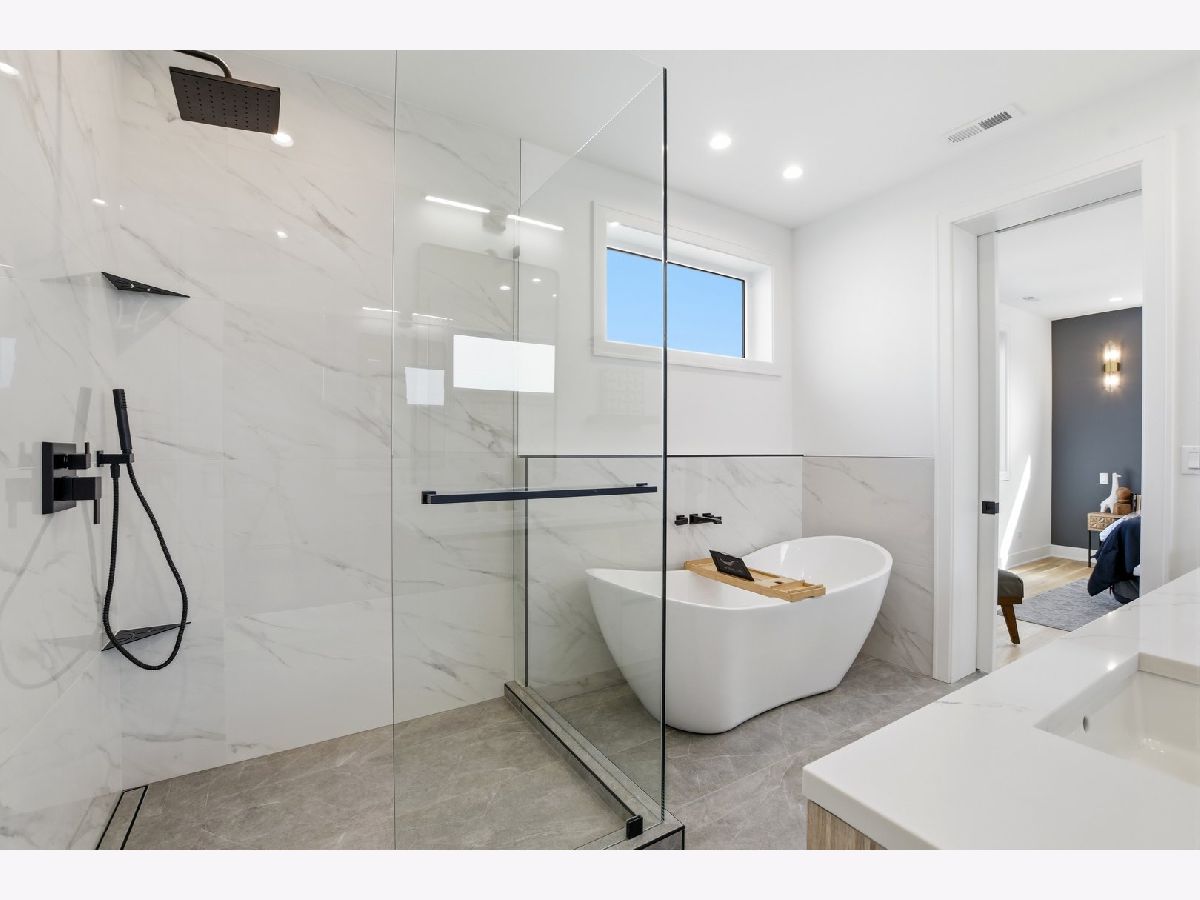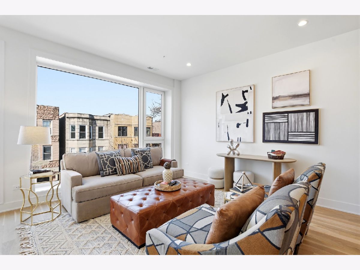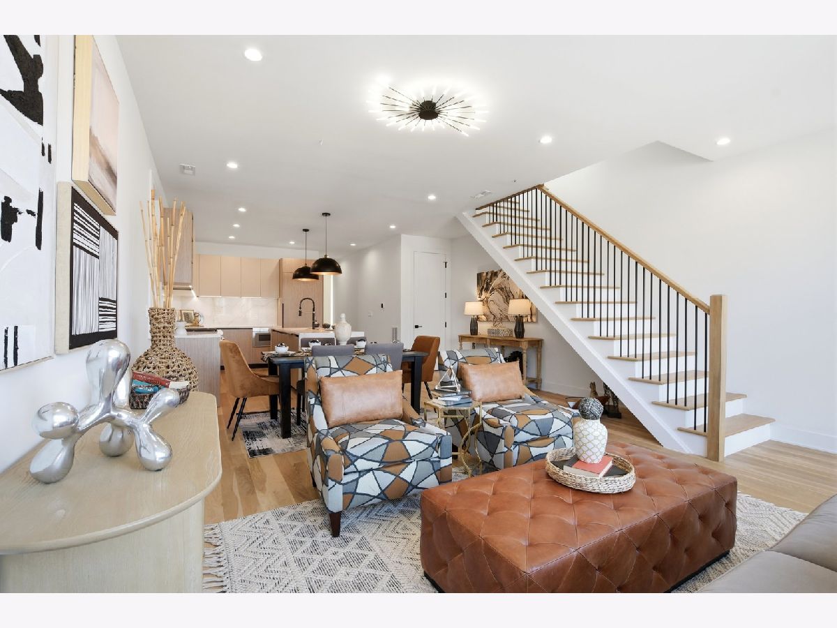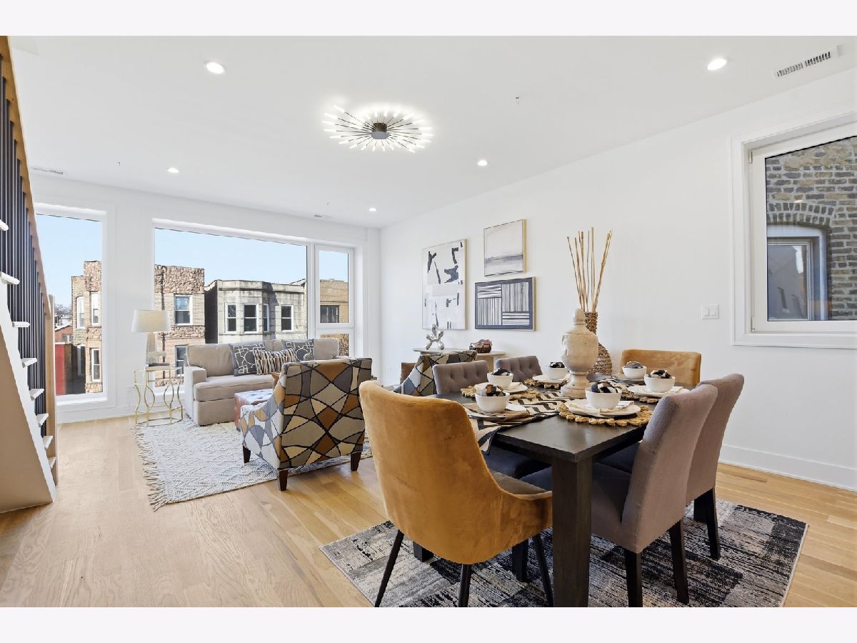 Experience elevated living in this brand-new Duplex Up in the heart of Ukrainian Village. Spanning approximately 2,400 square feet, this exceptional 3-bedroom, 3.5-bath residence offers two expansive levels of thoughtfully designed living space with luxury finishes throughout. The main level features a bright, open-concept layout anchored by massive, floor-to-ceiling west-facing European tilt-and-turn windows, delivering abundant natural light along with superior insulation and soundproofing. Wide-plank flooring and designer lighting add warmth and sophistication. The chef's kitchen showcases custom European cabinetry, quartz countertops with a dramatic waterfall edge and full-height backsplash, and a premium Thermador appliance package with a fully integrated refrigerator and dishwasher. A custom built-in bench with hooks and a spacious pantry provide both style and function. Down the hall, you'll find oversized bedrooms and spa-inspired baths adorned with large-format tile and high-end finishes. The primary suite offers peaceful eastern exposure, a generous walk-in closet, and a luxurious bath complete with a soaking tub, double vanity, and separate glass-enclosed shower. Upstairs, a stunning second level opens to a spacious family room with a fireplace, wet bar, and built-in European cabinetry featuring onyx quartz, floating shelves, and a dedicated beverage station. Floor-to-ceiling east-facing glass doors lead to an impressive 600+ square-foot private roof deck equipped with a Luvar System pergola and sweeping views of the Chicago skyline-perfect for entertaining. This level also offers the option for a second primary suite with dramatic windows and a private en-suite bath. Additional highlights include top-tier mechanicals with a tankless water heater, high-efficiency furnace, central AC, and humidifier. The home also features two private outdoor spaces, a carport garage space with an EV charger, and a one-year builder's warranty. Ready for immediate occupancy. Ideally located near Division Street and all the dining, shopping, parks, and CTA access that Ukrainian Village and Wicker Park have to offer, this home perfectly blends modern luxury with neighborhood charm.