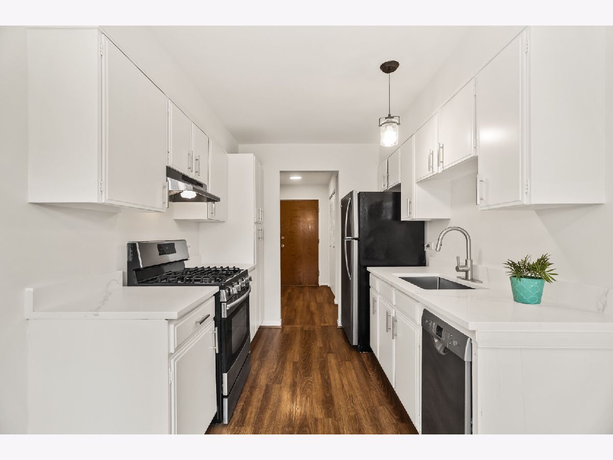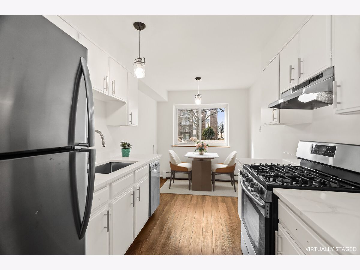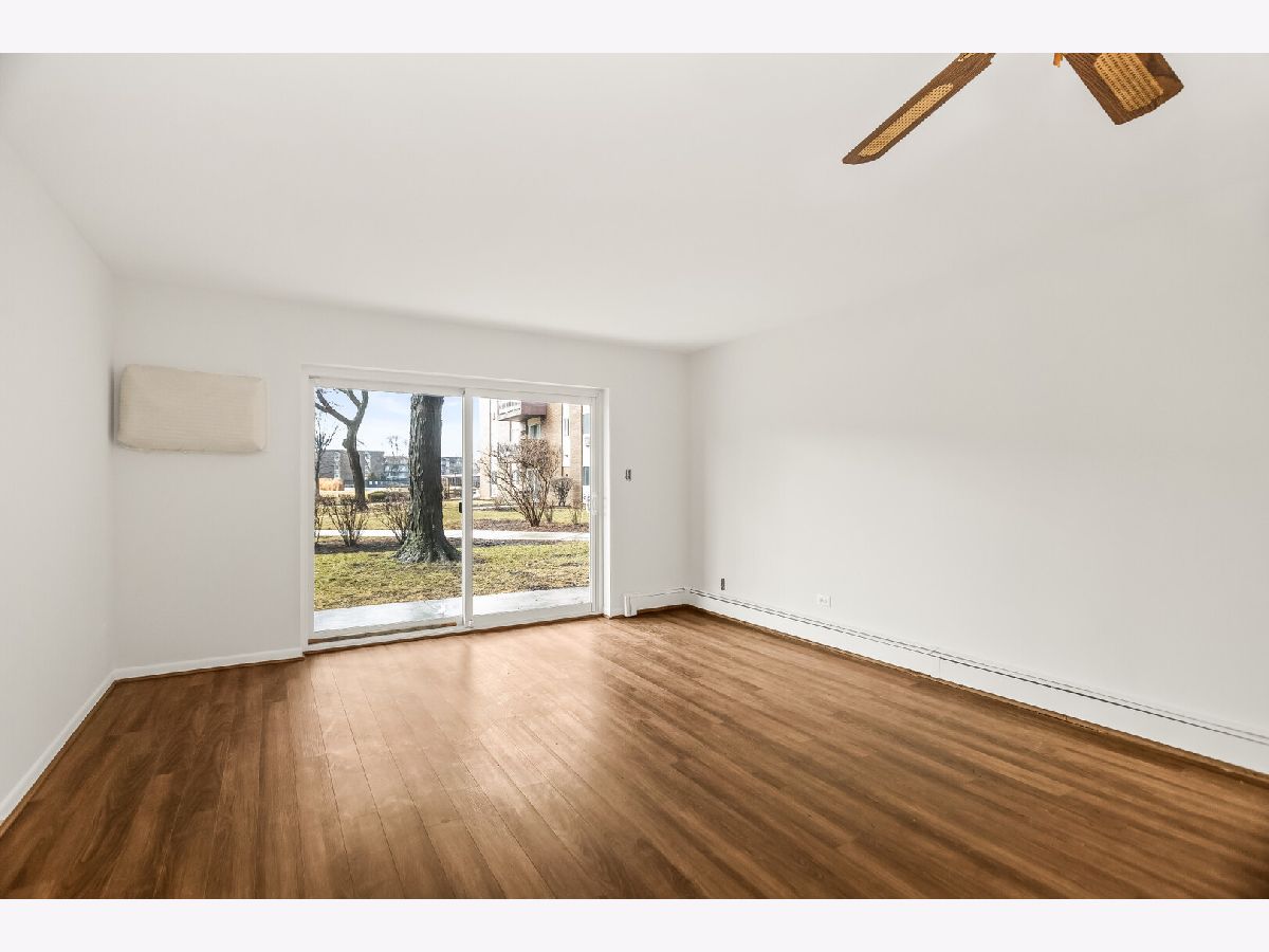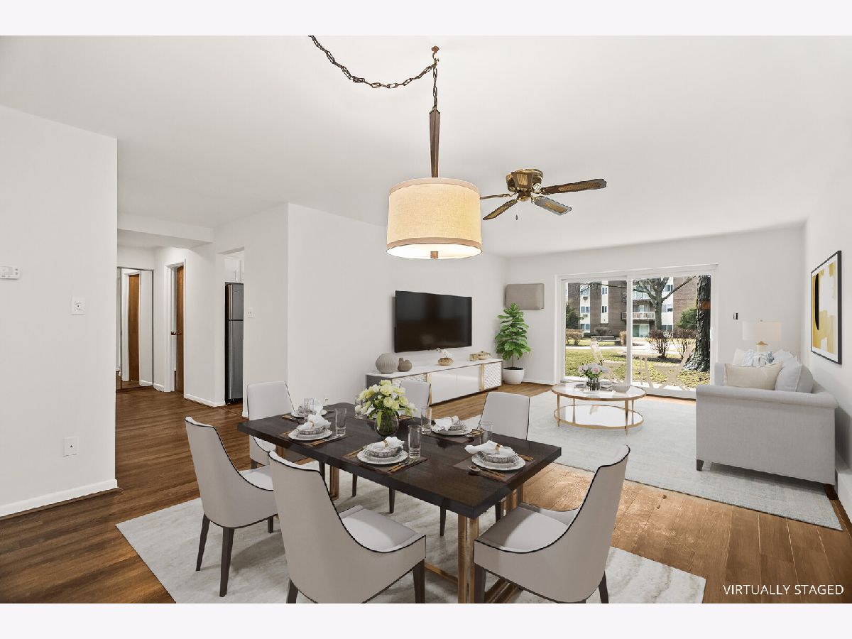 Beautiful 1 bedroom/1 bath Point West first floor condo with gorgeous view of the courtyard. Freshly painted throughout (2026), and newer high quality floors throughout (2017). The spacious living room has sliding doors (2017) to the private patio which opens to the courtyard. The dining room has newer light fixture. The eat-in kitchen has been updated (2026) with freshly painted cabinets and new hardware, new deep stainless steel sink and faucet, quartz countertops (2026), new window (2021), stainless steel appliances. (2017). The bedroom is large with a walk-in closet, and a new window (2021). Bathroom boasts new light fixture and mirror. Great closet space throughout. 2 parking spots. Fantastic amenities: Laundry on each floor, elevator, and outdoor pool. All of this in a wonderful location close to shopping, restaurants, schools.