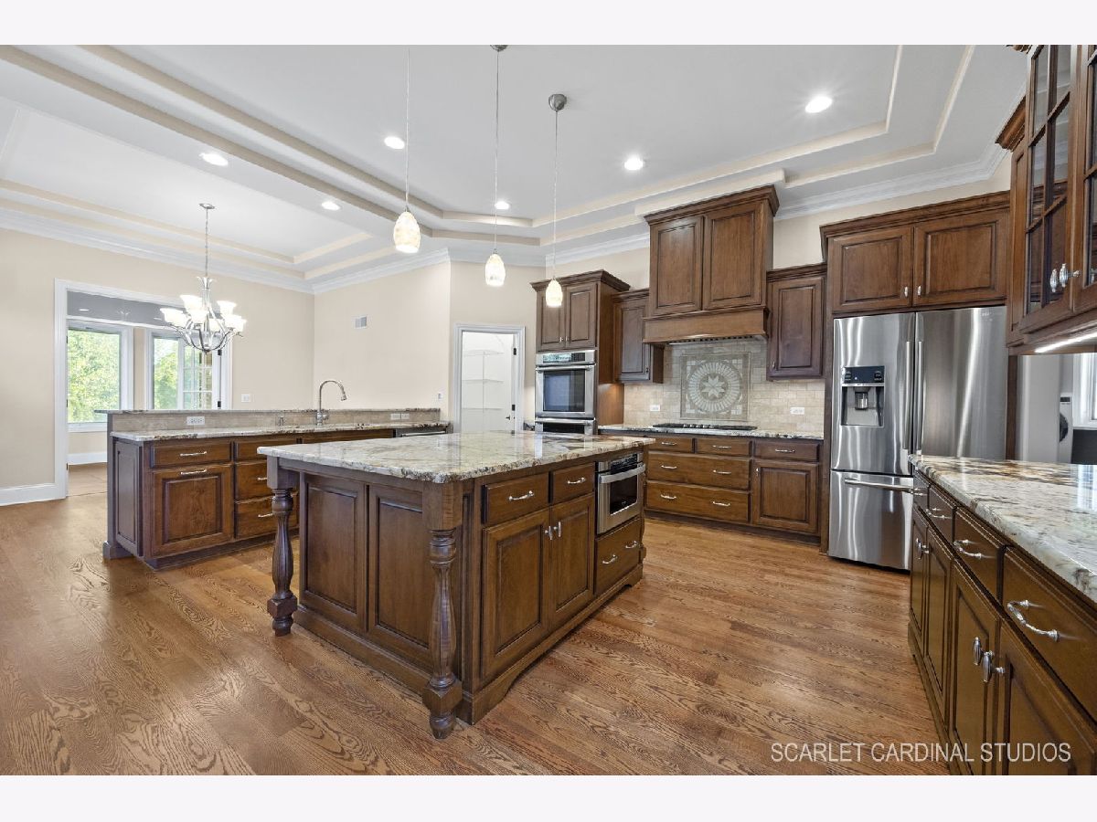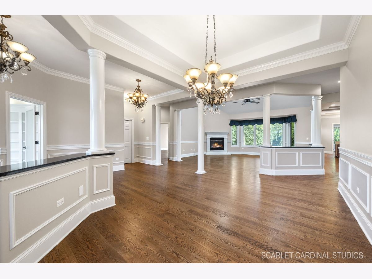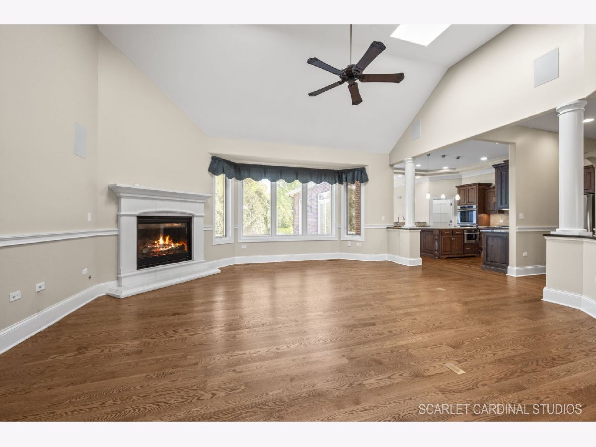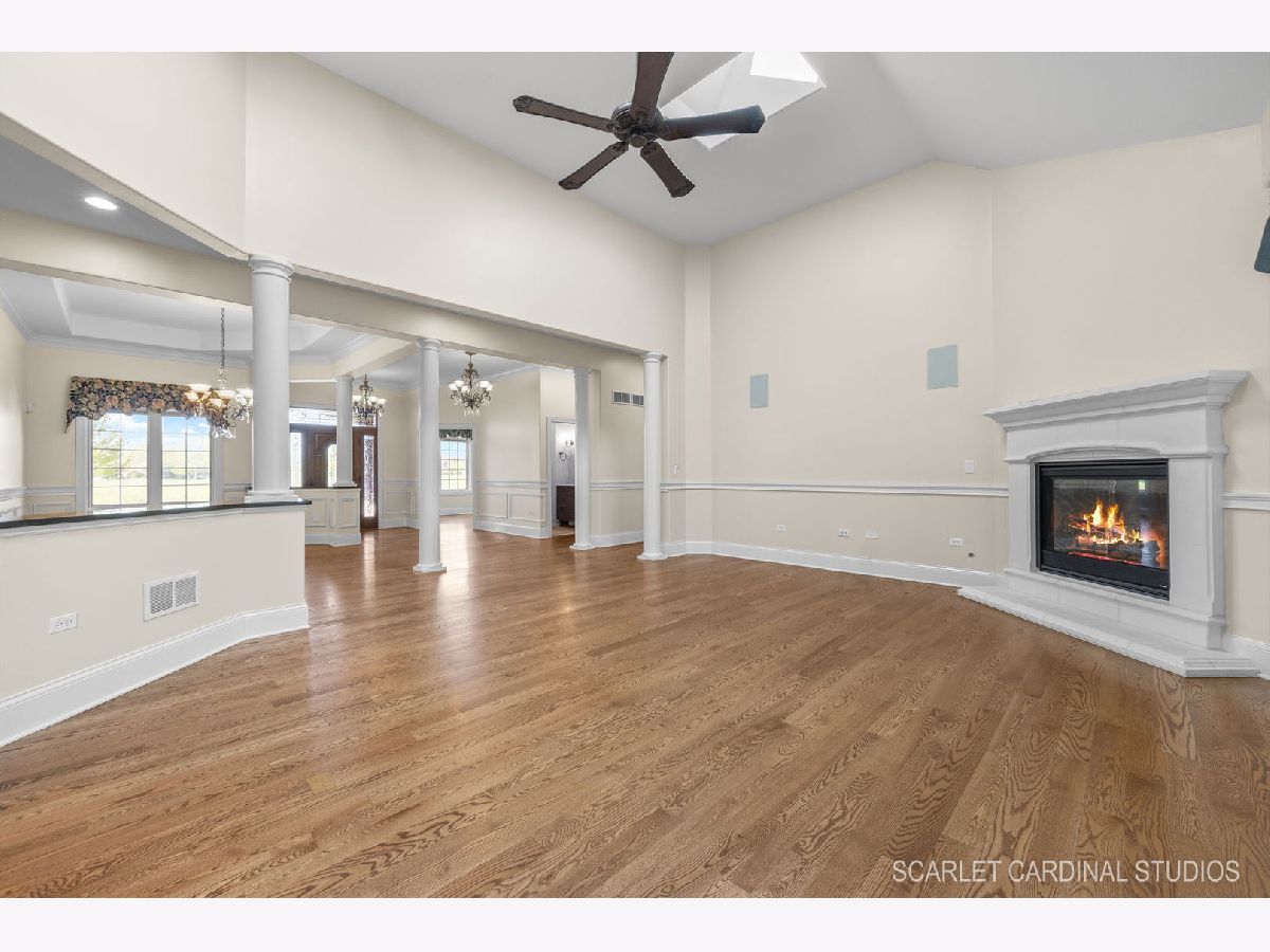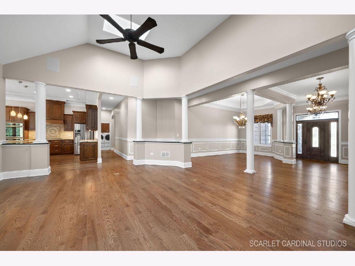Why wait for new Construction! Nestled within the prestigious Dunmoor Estates, this exquisite one-of-a-kind Custom Ranch-style residence, crafted by Oak Hill Builders, stands as a testament to luxury living. Its captivating blend of All Brick and Stone exterior exudes timeless elegance, setting the stage for a truly remarkable home. With four bedrooms and three and a half bathrooms, this residence epitomizes spaciousness and comfort, showcasing meticulous attention to detail throughout, from the full finished basement to the 3 1/2 car heated garage. Step inside to discover an open floor plan seamlessly integrating the living spaces. The gourmet kitchen, the heart of the home, is a haven for culinary enthusiasts. Featuring Brakur custom cabinetry with custom built-ins and pull-out drawers, granite counters, a Center Island, breakfast bar, eat-in area, walk-in pantry, and top-of-the-line Thermador appliances including a dual oven, cooktop, and dishwasher, it epitomizes sophistication. Entertain guests effortlessly in the expansive family room, adorned with soaring ceilings, a custom stone gas log fireplace, dual oversized skylights, surround sound, and 4" hardwood Oak flooring. Find serenity in the sunroom, boasting French doors and a slider leading to the brick paver patio, perfect for moments of relaxation. The master suite offers a private retreat, complete with a voluminous ceiling, a generous walk-in closet, and a luxurious ensuite bath with a whirlpool tub, separate shower, elegant lighting, and dual vanities. Additional highlights include a first-floor office/den, a dining room adorned with an elegant chandelier, wainscotting, and hardwood flooring, as well as a laundry room for added convenience. The deep pour basement offers a fourth bedroom, a full bathroom, huge recreation area, and ample storage space. This home boasts numerous upgrades, including 10' ceilings on the first floor, 4" hardwood floors throughout the first floor (Except Sunroom) , crown molding, columns, 8" baseboards, tankless hot water tank, high-efficiency furnace with UV light protection, central vacuum, inground lawn sprinklers, and upgraded Pella windows. Home is professionally landscaped with a front brick paver patio as well. With impeccable craftsmanship and unparalleled amenities, it epitomizes luxury living at its finest. Don't miss the opportunity to make this your dream home, conveniently located near District #202 schools and overlooking the tranquil pond and park. Welcome Home!