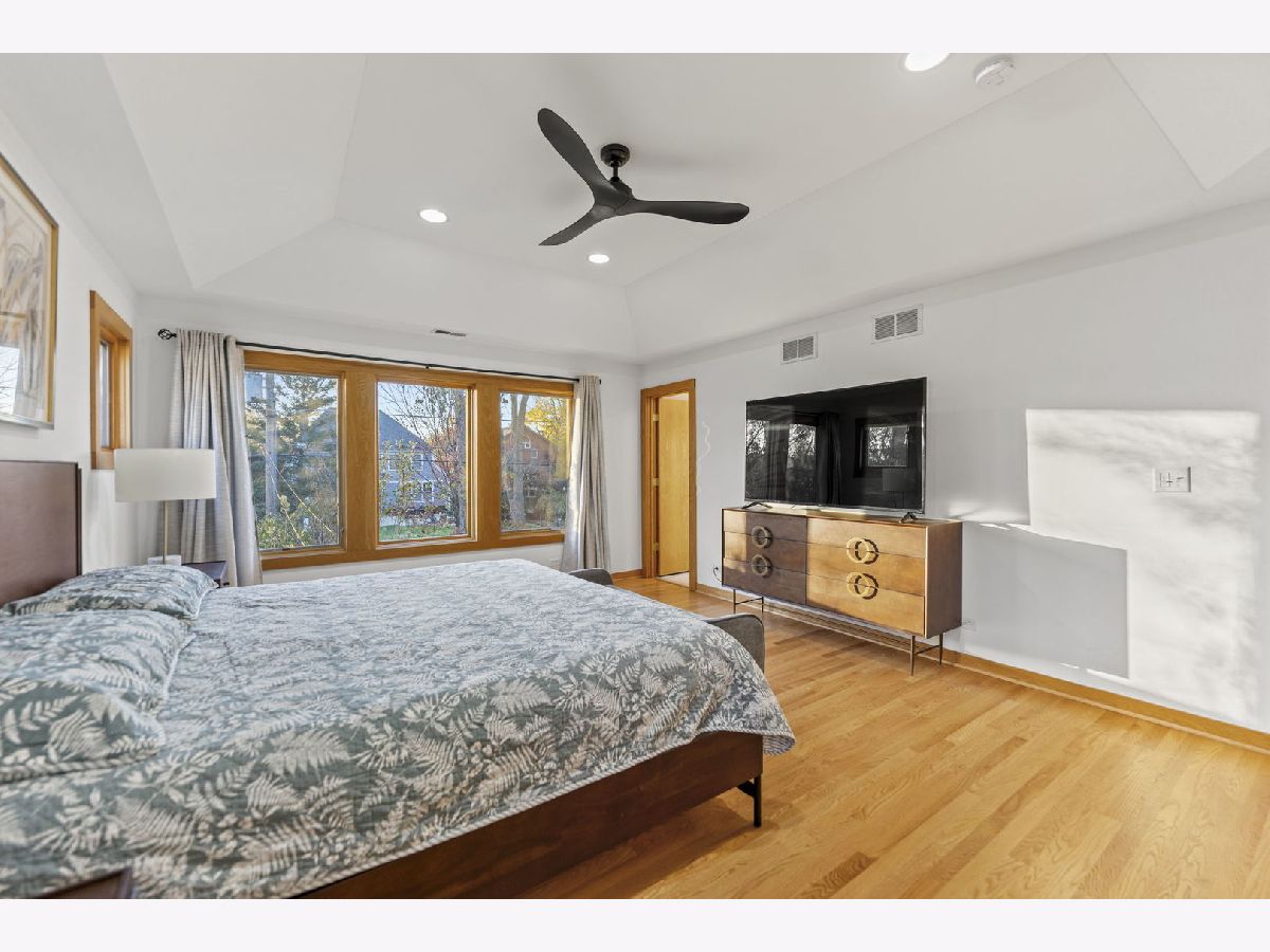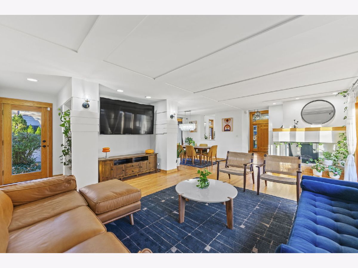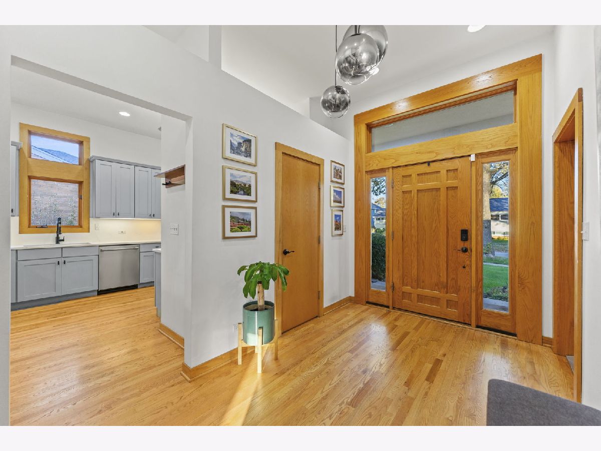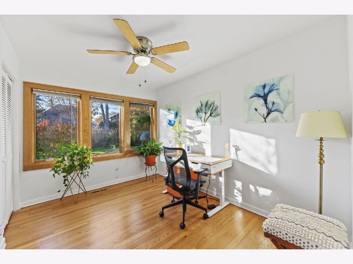 Perfectly located within walking distance to downtown Elmhurst, filled with charming shops, restaurants, and entertainment. This stunning Prairie style home, was made famous by Frank Lloyd Wright and his contemporaries and combines timeless design with modern functionality. Newly refinished hardwood floors extend throughout both levels, complemented by large sun filled windows and an open layout connecting the family and dining rooms, highlighted by a corner fireplace. The kitchen features freshly painted shaker style cabinets, quartz countertops, and upgraded Cafe brand stove and dishwasher, along with ample storage and a cozy breakfast nook. Two first floor bedrooms, a full bath, and an office provide flexibility for guests, in laws, or a work from home setup. Upstairs are two private ensuite bedrooms, including a spacious primary suite with a whirlpool tub and separate shower. The finished basement adds versatile living space, while the backyard offers both a deck and patio for outdoor enjoyment. On No through street just steps from East End Park and Pool for recreation and leisure.