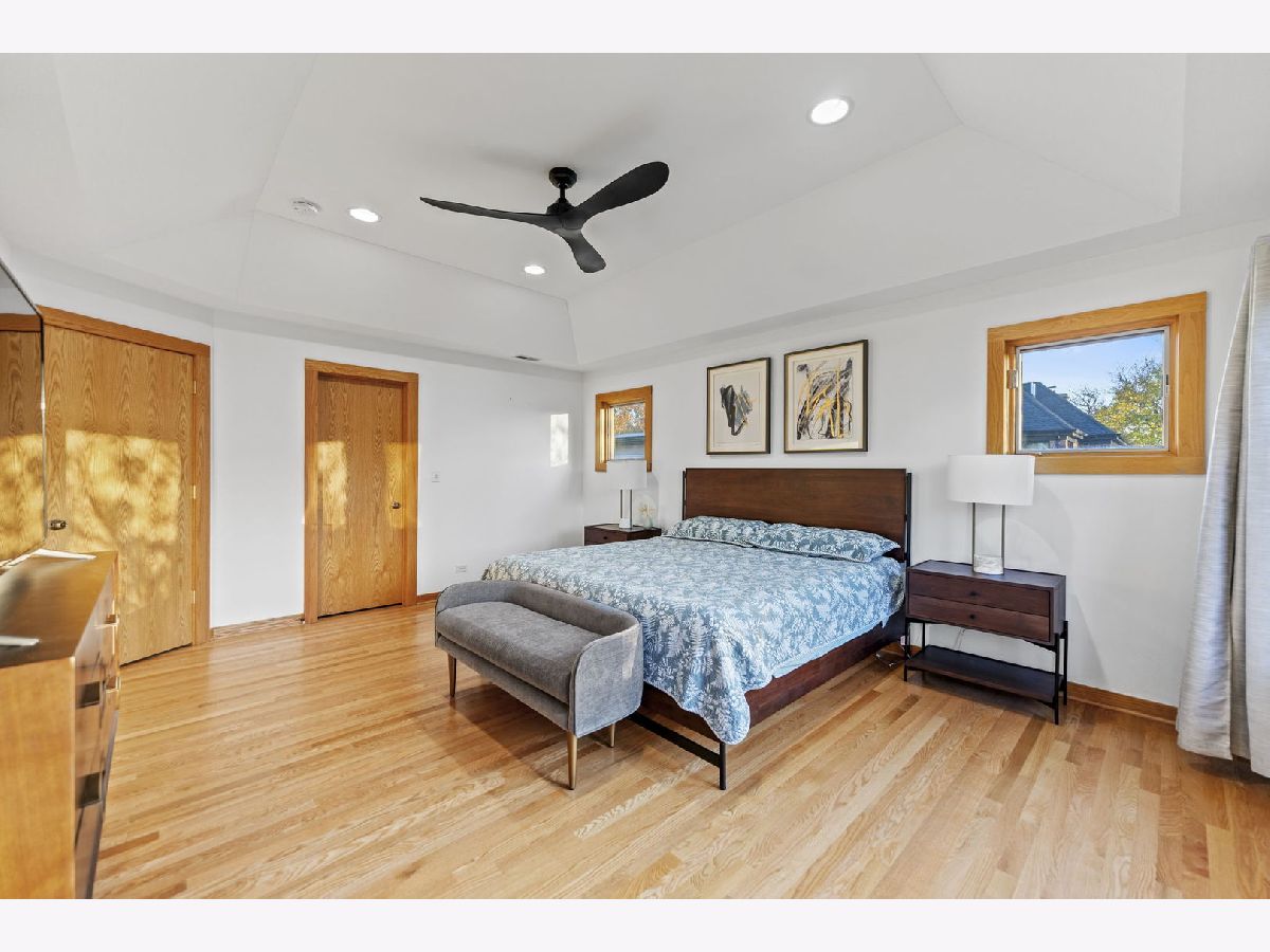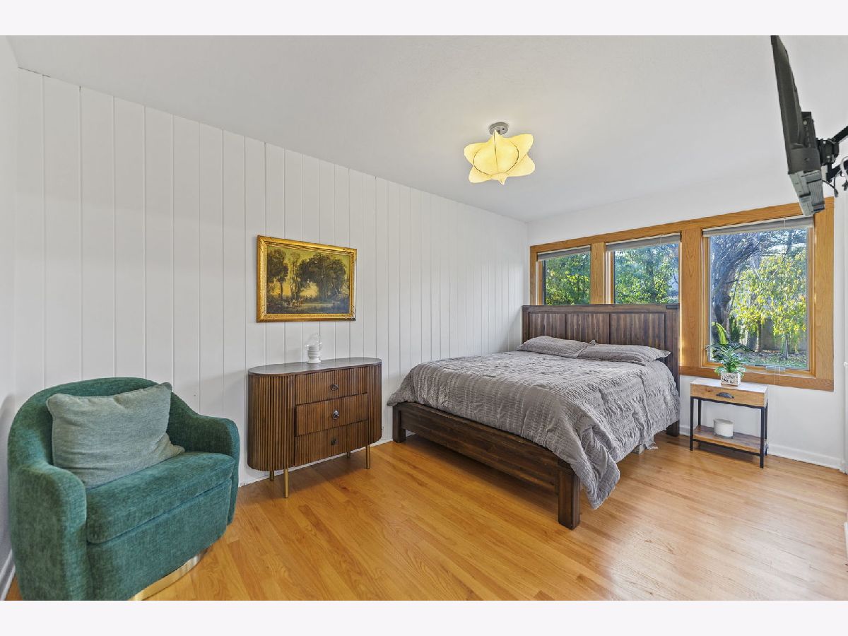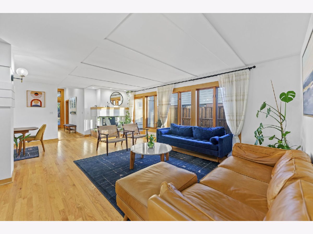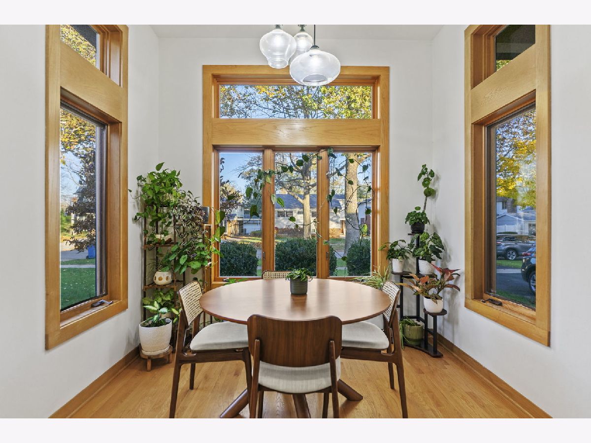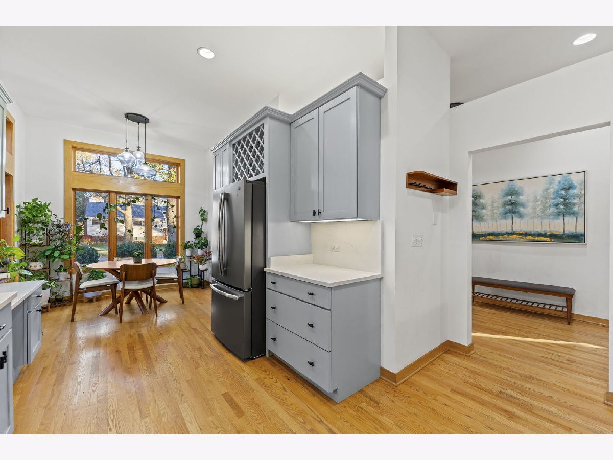 Perfectly located within walking distance to downtown Elmhurst, filled with charming shops, restaurants, and entertainment. This stunning Prairie style home, was made famous by Frank Lloyd Wright and his contemporaries and combines timeless design with modern functionality. Newly refinished hardwood floors extend throughout both levels, complemented by large sun filled windows and an open layout connecting the family and dining rooms, highlighted by a corner fireplace. The kitchen features freshly painted shaker style cabinets, quartz countertops, and upgraded Cafe brand stove and dishwasher, along with ample storage and a cozy breakfast nook. Two first floor bedrooms, a full bath, and an office provide flexibility for guests, in laws, or a work from home setup. Upstairs are two private ensuite bedrooms, including a spacious primary suite with a whirlpool tub and separate shower. The finished basement adds versatile living space, while the backyard offers both a deck and patio for outdoor enjoyment. On No through street just steps from East End Park and Pool for recreation and leisure.