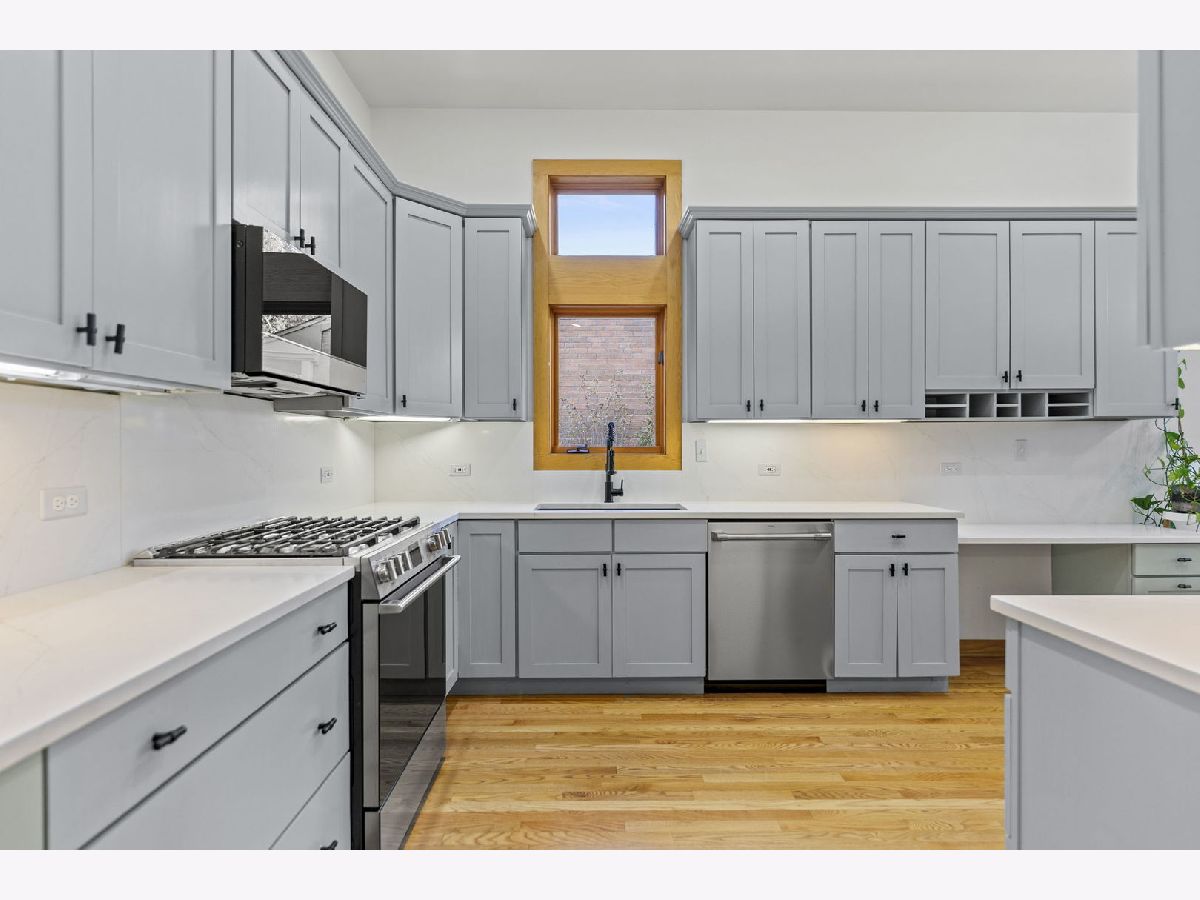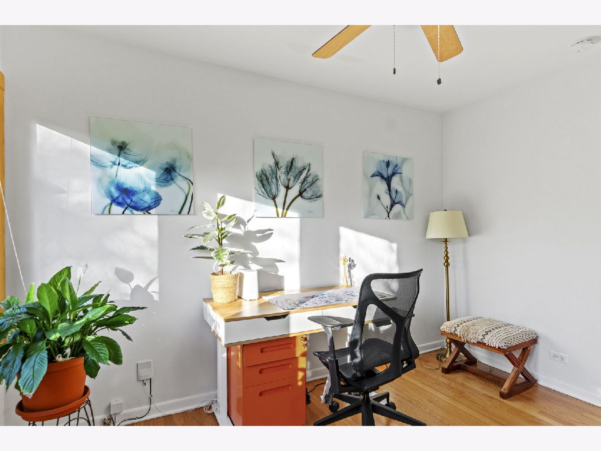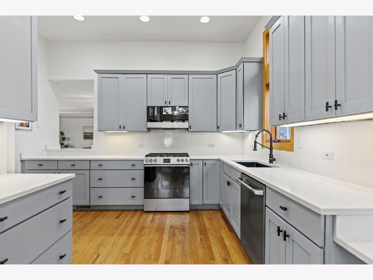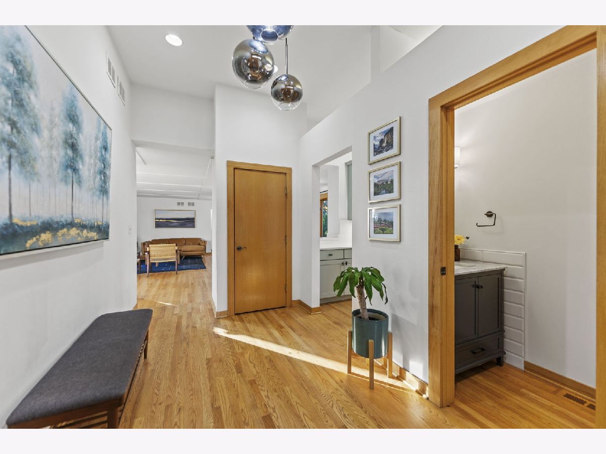 Perfectly located within walking distance to downtown Elmhurst, filled with charming shops, restaurants, and entertainment. This stunning Prairie style home, was made famous by Frank Lloyd Wright and his contemporaries and combines timeless design with modern functionality. Newly refinished hardwood floors extend throughout both levels, complemented by large sun filled windows and an open layout connecting the family and dining rooms, highlighted by a corner fireplace. The kitchen features freshly painted shaker style cabinets, quartz countertops, and upgraded Cafe brand stove and dishwasher, along with ample storage and a cozy breakfast nook. Two first floor bedrooms, a full bath, and an office provide flexibility for guests, in laws, or a work from home setup. Upstairs are two private ensuite bedrooms, including a spacious primary suite with a whirlpool tub and separate shower. The finished basement adds versatile living space, while the backyard offers both a deck and patio for outdoor enjoyment. On No through street just steps from East End Park and Pool for recreation and leisure.