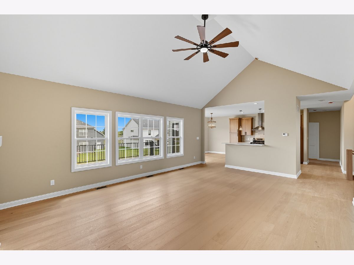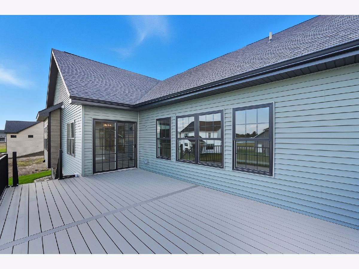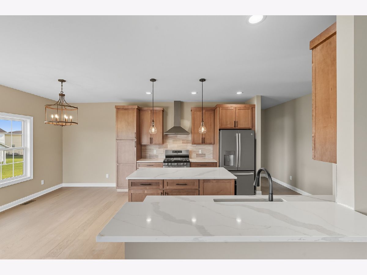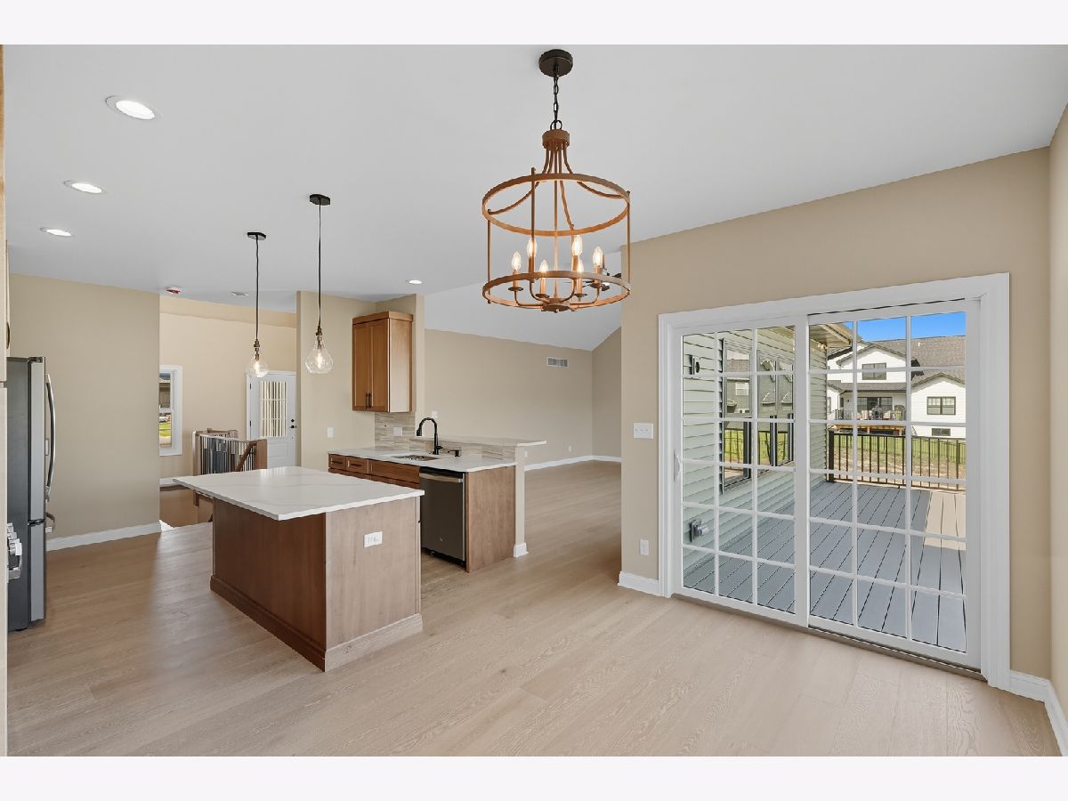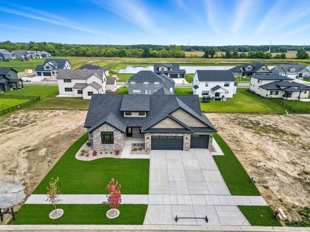This beautifully crafted new-construction ranch delivers the ease of single-level living paired with elevated design throughout. Offering 1,890 sq. ft. of thoughtfully planned space, the home showcases engineered hardwood floors, a striking two-story foyer with chandelier, and a sun-filled great room with cathedral ceiling and an electric fireplace framed by a wood mantle. Oversized Andersen windows with black exterior trim bring in abundant natural light, creating bright, inviting spaces from room to room. The kitchen is both functional and stylish, featuring quartz countertops, soft-close cabinetry, a GE Slate appliance package, and generous island seating that flows seamlessly into the great room-ideal for entertaining or everyday living. Added conveniences include under-cabinet lighting, a large workstation sink, and a pantry cabinet with pull-out shelving. The adjacent breakfast area opens through sliding glass doors to an oversized composite deck, extending your living space outdoors. Ceiling fans throughout, solid-core doors, and oak stairs with a custom railing add comfort and quality, while the main-level laundry room with sink enhances day-to-day ease. The primary suite is a true retreat, featuring a tray ceiling, custom window storage bench, walk-in closet, and spa-inspired ensuite bath with dual vanities, a deep soaking tub, and a custom-tiled walk-in shower complete with bench, glass doors, and handheld sprayer. Two additional main-level bedrooms offer flexible use, including vaulted ceilings and a walk-in closet, and are served by a second full bath with custom tilework and a quartz vanity top. The daylight basement offers 9-ft walls, is pre-plumbed for a future bathroom, and provides endless potential for added living space. Outside, enjoy a covered front porch, a fully landscaped yard with irrigation, and a finished, insulated three-car garage pre-piped for a heater. A tankless water heater completes this modern, energy-efficient home. Every detail has been carefully selected to blend comfort, craftsmanship, and timeless style-creating a home designed to live beautifully from day one.
