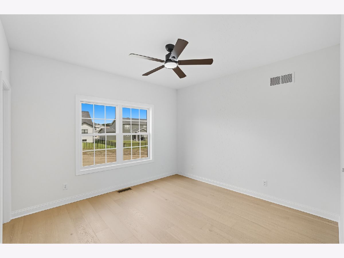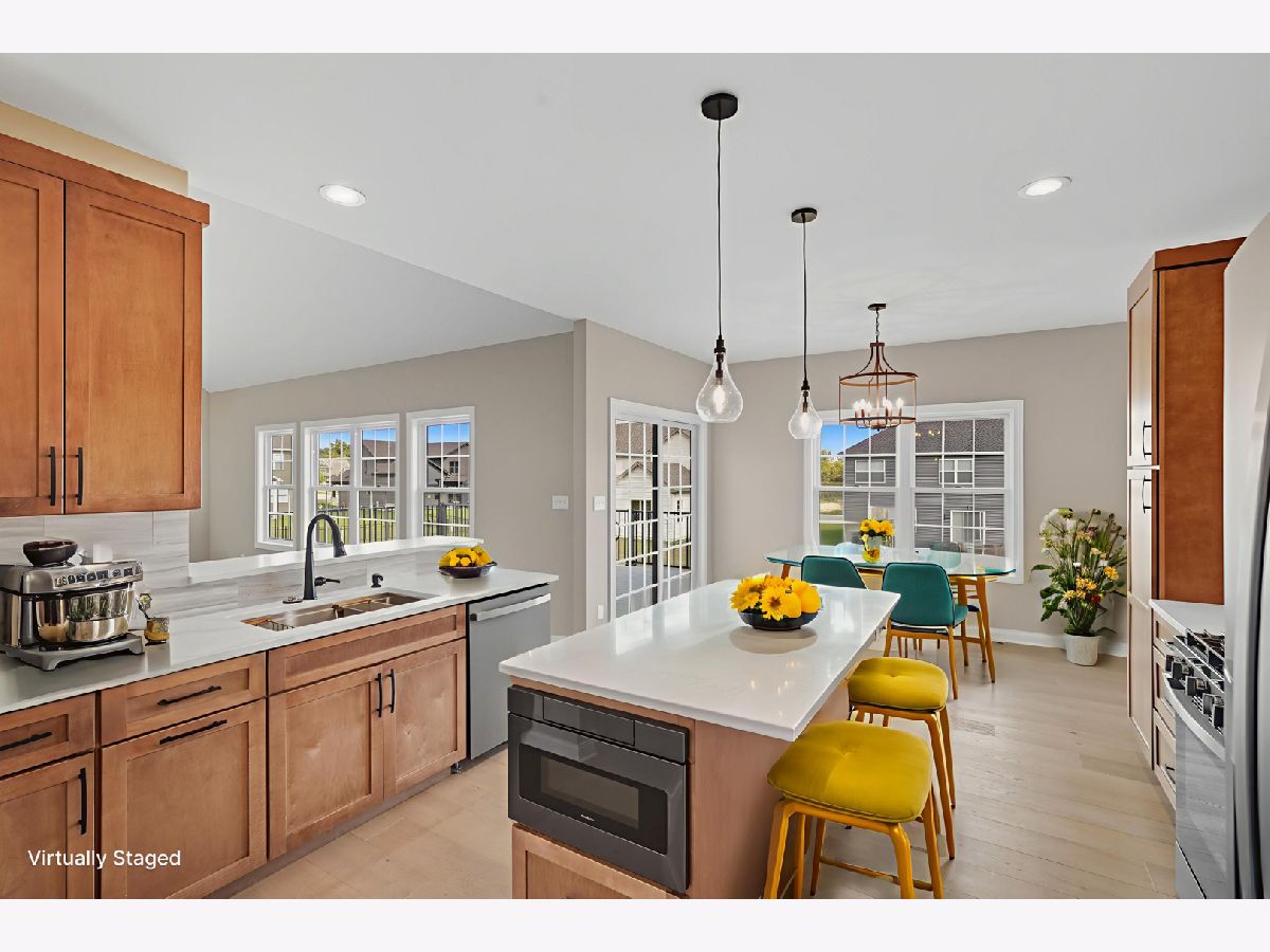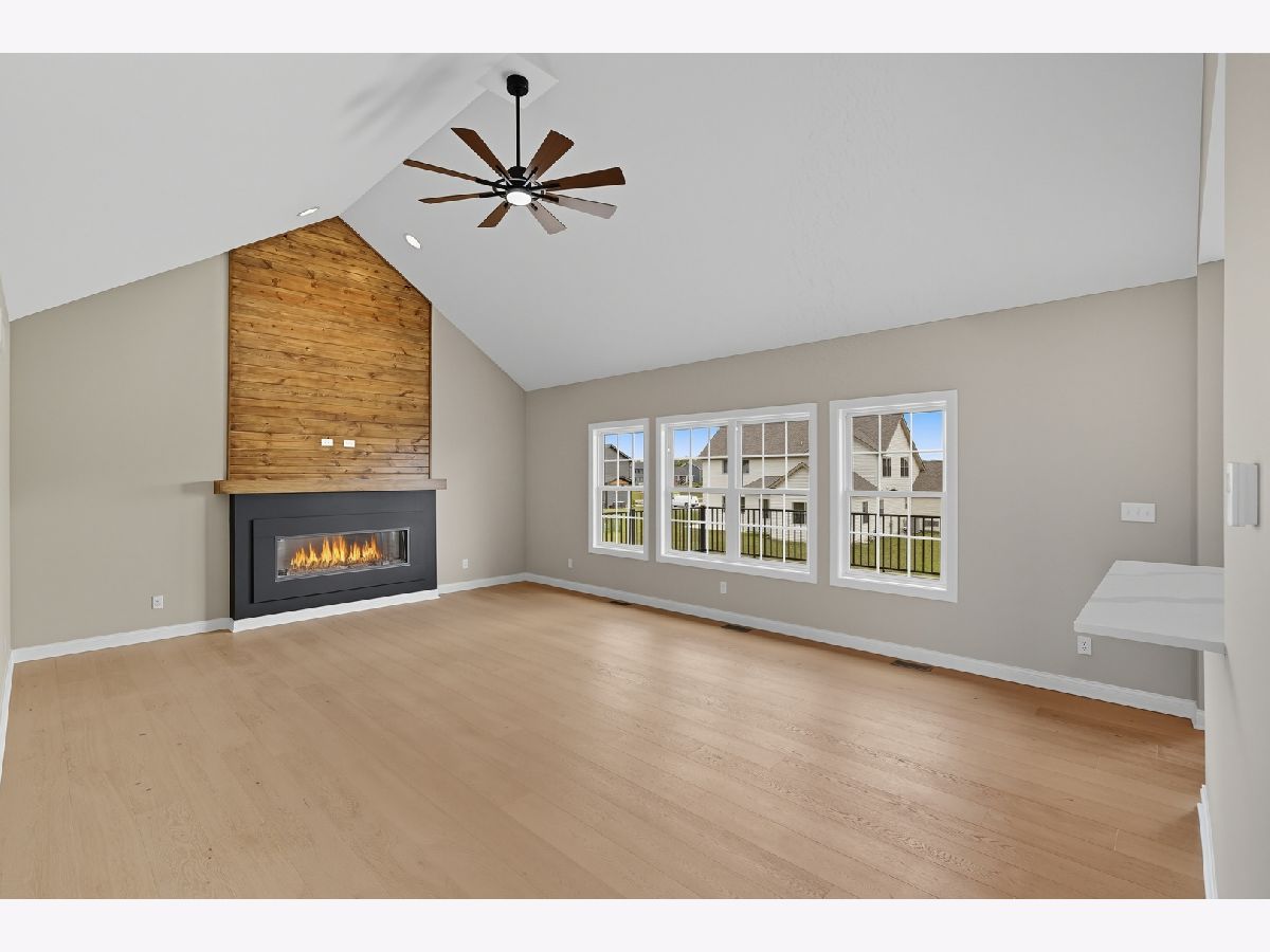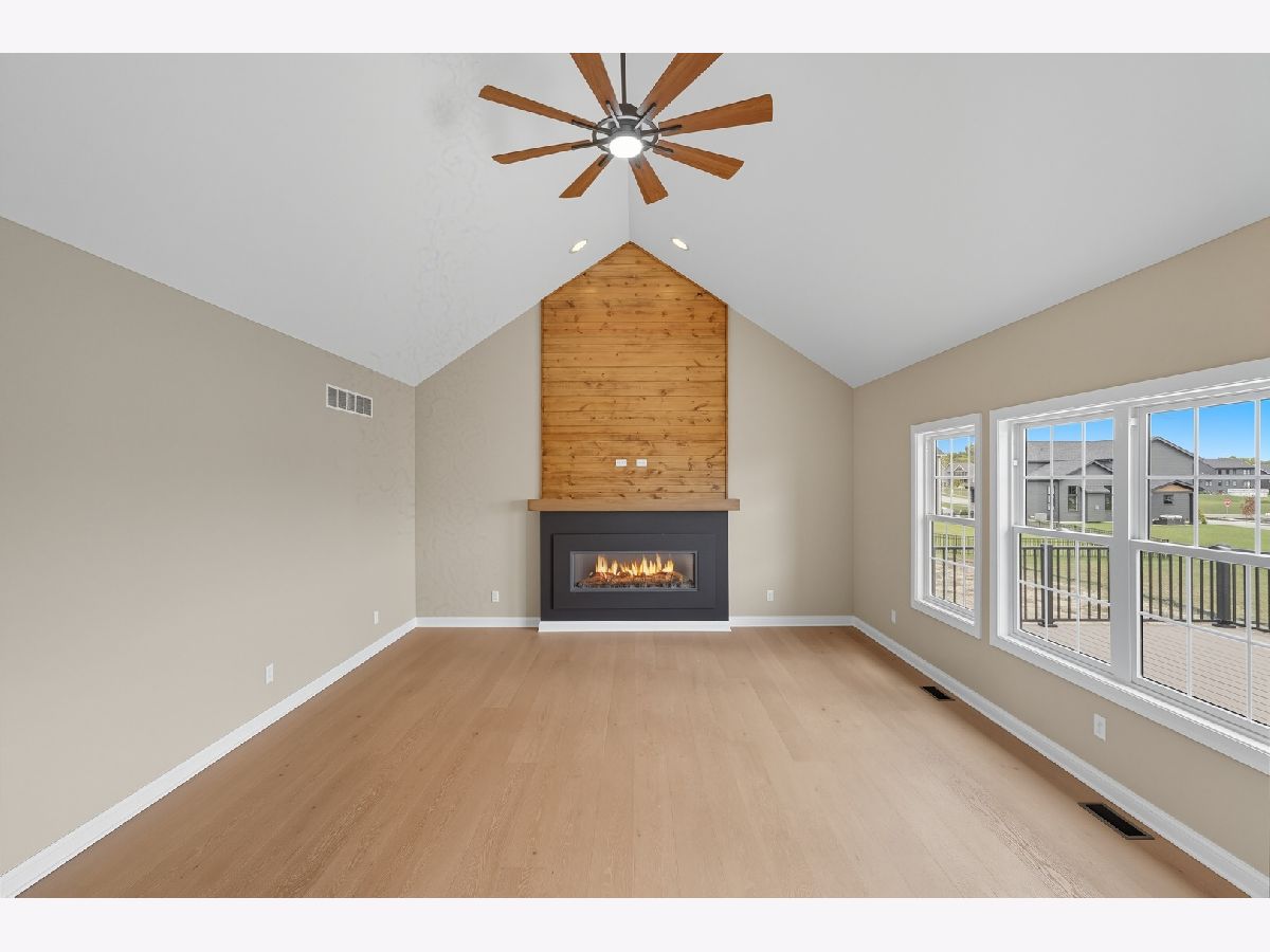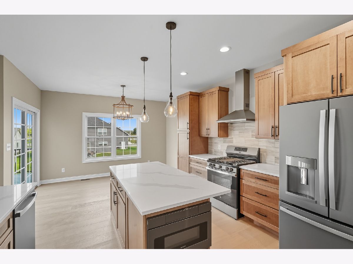 This beautifully crafted new-construction ranch delivers the ease of single-level living paired with elevated design throughout. Offering 1,890 sq. ft. of thoughtfully planned space, the home showcases engineered hardwood floors, a striking two-story foyer with chandelier, and a sun-filled great room with cathedral ceiling and an electric fireplace framed by a wood mantle. Oversized Andersen windows with black exterior trim bring in abundant natural light, creating bright, inviting spaces from room to room. The kitchen is both functional and stylish, featuring quartz countertops, soft-close cabinetry, a GE Slate appliance package, and generous island seating that flows seamlessly into the great room-ideal for entertaining or everyday living. Added conveniences include under-cabinet lighting, a large workstation sink, and a pantry cabinet with pull-out shelving. The adjacent breakfast area opens through sliding glass doors to an oversized composite deck, extending your living space outdoors. Ceiling fans throughout, solid-core doors, and oak stairs with a custom railing add comfort and quality, while the main-level laundry room with sink enhances day-to-day ease. The primary suite is a true retreat, featuring a tray ceiling, custom window storage bench, walk-in closet, and spa-inspired ensuite bath with dual vanities, a deep soaking tub, and a custom-tiled walk-in shower complete with bench, glass doors, and handheld sprayer. Two additional main-level bedrooms offer flexible use, including vaulted ceilings and a walk-in closet, and are served by a second full bath with custom tilework and a quartz vanity top. The daylight basement offers 9-ft walls, is pre-plumbed for a future bathroom, and provides endless potential for added living space. Outside, enjoy a covered front porch, a fully landscaped yard with irrigation, and a finished, insulated three-car garage pre-piped for a heater. A tankless water heater completes this modern, energy-efficient home. Every detail has been carefully selected to blend comfort, craftsmanship, and timeless style-creating a home designed to live beautifully from day one.