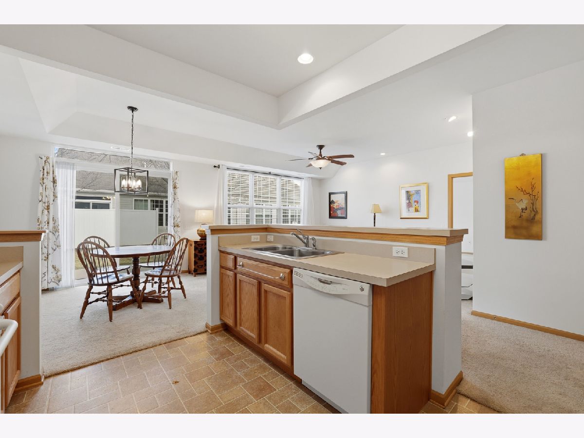 Bright and open Savoy model in Del Webb Sun City! This 2 bedroom, 2 bathroom home with a 2 car garage is located in the highly sought-after 55+ community of Sun City Huntley. The kitchen features oak cabinets, stainless steel refrigerator, and a breakfast bar overlooking the dining area and spacious living room. Neutral paint, decor lighting, and abundant natural light throughout. All window treatments stay. The owner's suite includes a tray ceiling, ceiling fan, walk-in closet, and private bath with dual vanity and walk-in shower. Concrete patio with open green space views. Enjoy resort-style living with access to two lodges, indoor and outdoor pools, fitness centers, golf, tennis, walking paths, clubs, and more. Dishwasher conveyed as-is.