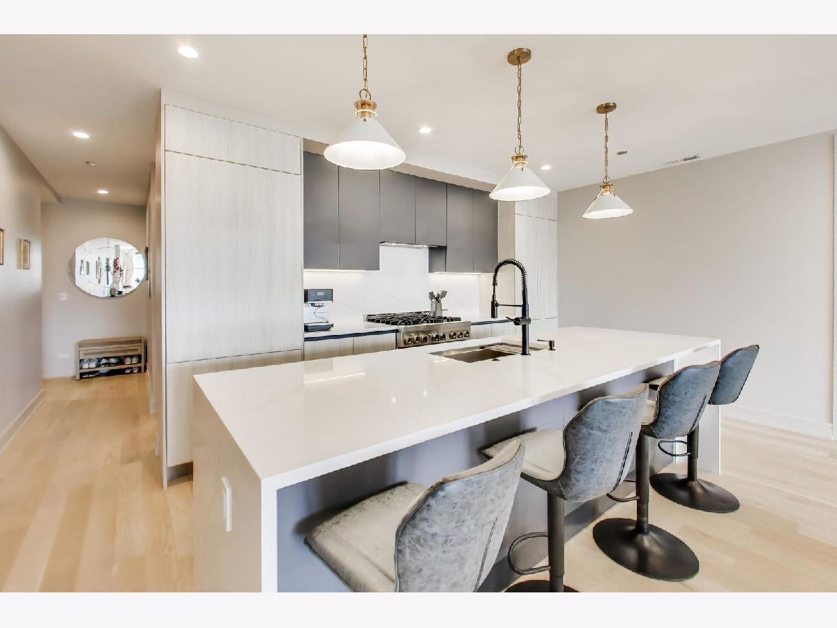 A newer construction luxurious condominium, in the vibrant West Town neighborhood. With modern living and comfort, elevator access and garage parking included. Step into this residence and you'll be greeted by hardwood floors throughout, oversized windows and a top of the line designer kitchen. The kitchen boasts a large eat-in island, custom Scavolini cabinetry with soft-close drawers, integrated modern appliances, and premium quartz countertops. Bathrooms are equally impressive, with custom vanities and designer porcelain tile. The master bathroom provides radiant heated flooring, complemented by a spacious spa inspired walk-in rain shower and double vanity. Each residence includes a high efficiency furnace, smart thermostat and in unit laundry for added comfort and convenience. Imported European tilt and turn windows offer natural light throughout. Individual balconies providing a personal oasis amidst the bustling neighborhood. Set in the heart of West Town, you'll find yourself immersed in a community known for its tree-lined streets, art galleries, music venues, charming boutiques, and a plethora of restaurants and coffee shops, all within reach.