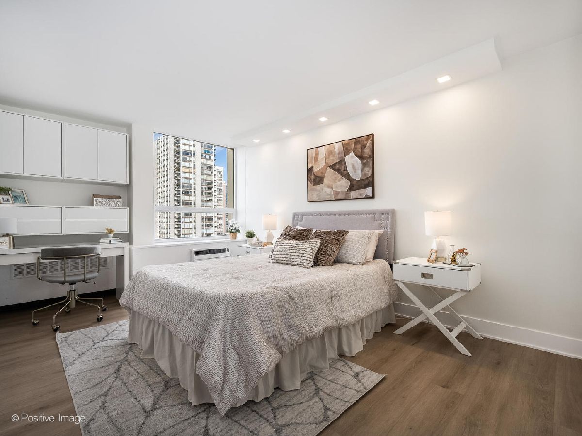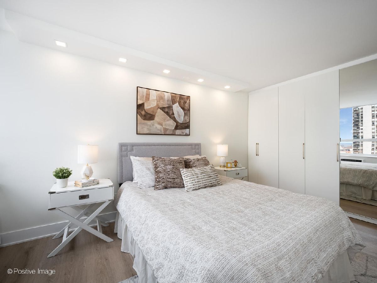 Presenting this stunning two bedroom two bathroom corner unit with large balcony on the 12th floor of Ciummings House in Sandburg Village.Ideally located between Gold Coast and Old Town. This is a brand new gut renovation with exquisite standards of workmanship and finishes. Be the first to live in this unit with a new open floor-plan that takes advantage of the spectacular views across the city from all angles. Central to the unit is the chef's kitchen where you can enjoy cooking and entertaining while taking in the views. The custom cabinets are off-white slim shaker with gold accent hardware and under-cabinet lighting. Appliances are top of the line - French-door refrigerator, microwave drawer, slide-in range, Bosch dishwasher with cabinet panel. Quartz counters and a large island with waterfall ends and breakfast bar, designer black/gold pendants and recessed LED lights. The kitchen flows into the dining area which has a built-in credenza with additional cabinet storage. The open living space has abundant natural light from wraparound windows. There is new built-in recessed lighting. The large balcony has sliding doors from the living room to provide the perfect outdoor extension of the space. Enjoy spectacular wide open views of the while relaxing in a cool lake breeze. There are two split bedrooms that are both very spacious and have professionally organized closets with automated lighting, built-in recessed lighting over the beds. Each has a full bathroom. The primary suite has an ensuite bathroom with walk-in shower that has sliding glass doors, black/gold accent hardware & fixtures, Toto toilet, white vanity cabinet with quartz counter, finished with contemporary tiling. The 2nd bathroom has bathtub. There is wide plank natural wood color flooring throughout the unit and specialized paint used with air sanitizing technology. New electrical, plumbing, A/C units. Abundant closet space that is all professionally organized. A separate storage cage is included in the building. Cummings House is a well run building with good reserves, many recent major updates completed including new elevators and renovated hallways. There's a rooftop sun deck, 24 hour door staff, maintenance & management are onsite. Monthly assessment includes heat, TV cable and high speed (1GB) internet service (everything except electricity). Sandburg Village amenities include 2 outdoor pools & sundecks, tennis & pickle ball courts (some additional fees), hospitality rooms. The landscaped courtyards, play lot, commercial facilities provide a welcoming community environment. Convenient for transportation - 1 block to train/subway, buses at door, access to Lake Shore Dr, bike path. Located in Gold Coast / Old Town, close to downtown, Lincoln Park. Enjoy all attractions of the neighborhood - restaurants, nightlife, shopping, Jewel, Lakefront trail, beach, parks. Garage parking currently has a waitlist. Pets allowed.