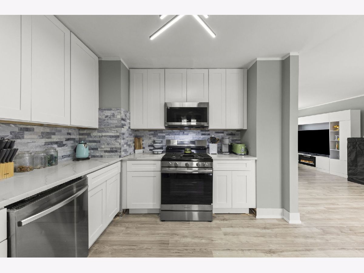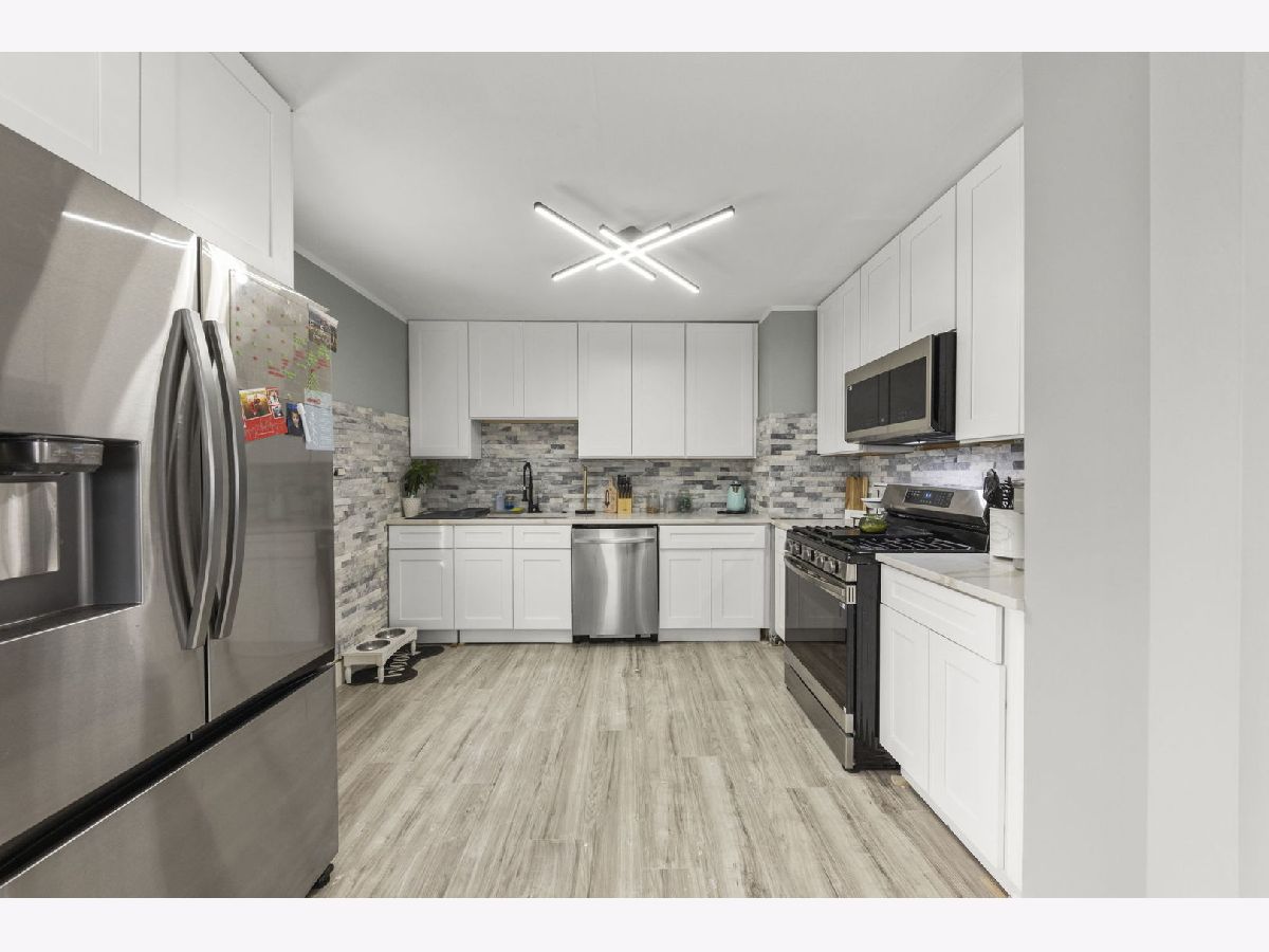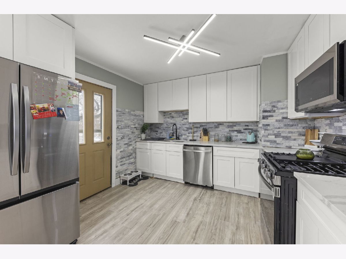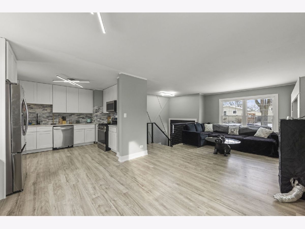 This fully remodeled raised ranch blends modern design with everyday comfort.**Kitchen touch ups not shown in pictures: Completed kickboards, knobs installed on cabinets, backsplash & grout finished, kitchen door painted white. Basement updates not shown in pictures: Painted walls gray to match the rest of the house.** The welcoming entry features a striking accent wall that sets the tone for the home's clean, cohesive aesthetic. The open-concept kitchen anchors the main living space and is designed for both function and flow, featuring white shaker cabinets, stainless steel appliances, and gray hardwood-style laminate flooring throughout. Fresh white doors and trim, paired with a soft neutral color palette, create a bright, cohesive look inspired by today's most popular renovation styles. The updated bathroom offers clean lines and tasteful finishes, continuing the home's modern, polished feel. Every update has been thoughtfully selected to create a space that feels current, comfortable, and move-in ready.