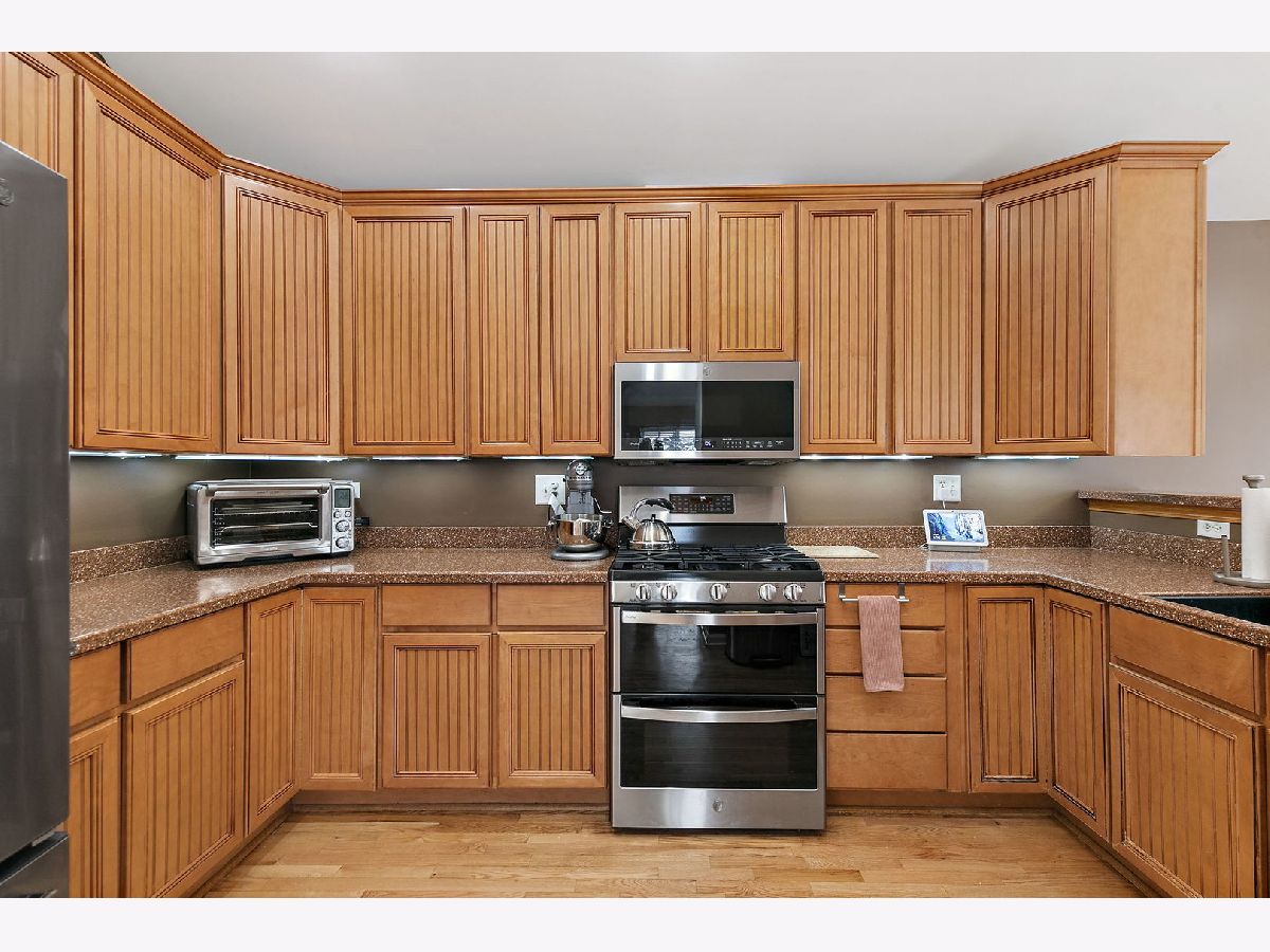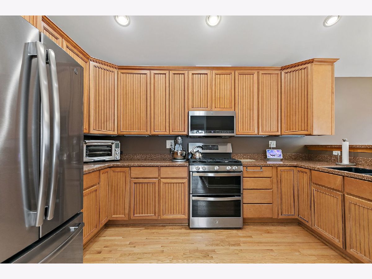 Welcome to this beautifully updated 3-bed, 2-bath townhouse offering modern comfort, abundant natural light, and thoughtful upgrades throughout. The main level features rich hardwood flooring and an open layout anchored by a cozy gas fireplace in the family room, perfect for both everyday living and entertaining. The spacious kitchen is designed for both style and function, showcasing 42-inch maple cabinets with exceptional storage, stainless steel GE Profile appliances (only four years old), and elegant under-cabinet and above-cabinet lighting that enhances both ambiance and workspace. The primary and second bedroom on the main floor have brand new hardwood floors. Both full bathrooms have been newly renovated with contemporary finishes, including tile floors, floating vanities, and clean, modern design. Large windows throughout the home fill every room with warm, natural light. The attached 2-car garage is a true standout, featuring a professionally finished epoxy floor and added cabinets that provide excellent storage and organization. Move-in ready and meticulously maintained, this townhome delivers convenience, style, and value in every detail.
