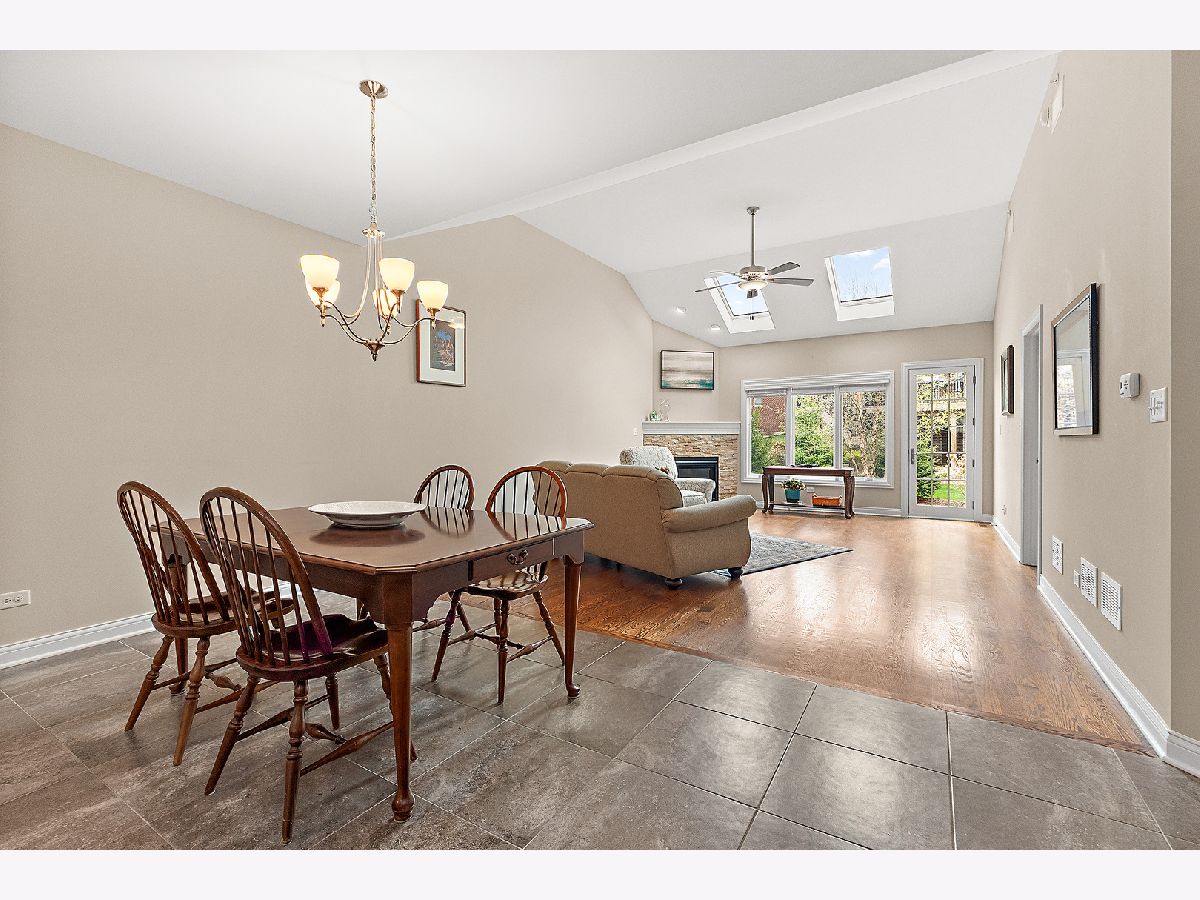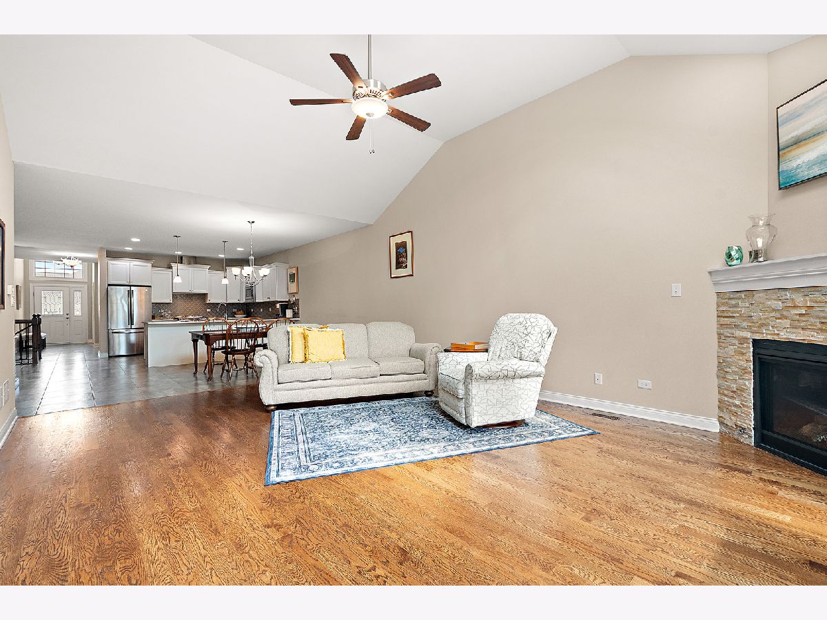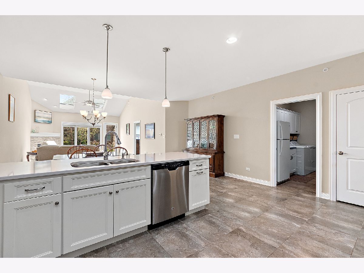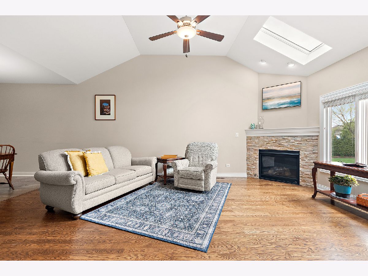 Welcome to this beautiful ranch townhome in the highly sought-after Stonebridge Woods Villas of Homer Glen. Truly move-in ready and like new! Step into a bright, spacious foyer that opens to an inviting floor plan filled with natural light. Vaulted and 9ft ceilings, and white trim and doors throughout. The stunning kitchen features crisp white cabinetry, granite countertops, breakfast bar, and stainless-steel appliances, seamlessly connecting to the main living space-perfect for everyday living and entertaining. The living room features hardwood floors, vaulted ceilings, skylights, a cozy corner fireplace, and direct access to patio. The spacious primary suite offers vaulted ceilings, a walk-in closet, and an en-suite bath complete with dual sinks, a walk-in shower, and separate soaking tub. Convenient first-floor laundry room with utility tub and cabinetry for additional storage. The fully finished basement expands your living space with a large recreation area, wet bar with refrigerator, and a full bathroom featuring an American Standard walk-in tub and large walk-in shower. Two car garage. Just steps away, you'll find a scenic pond with fountain, walking trails, a park, ball field, tennis courts, and a pavilion. This home combines comfort, style, and convenience in a beautiful community. A must see!