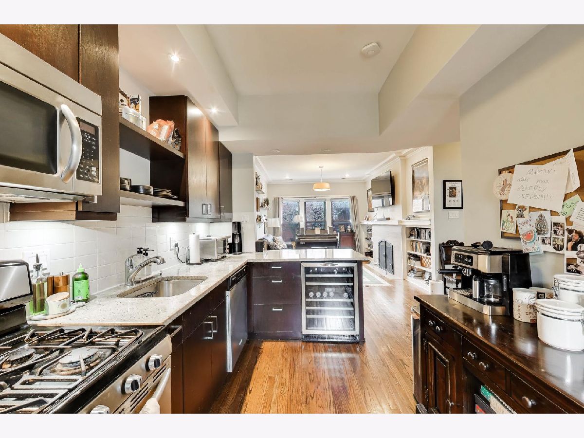 Top floor south facing Andersonville vintage unit in boutique building. Open kitchen with breakfast bar, stainless steel appliances, under cabinet built-in wine cooler, custom cabinetry, granite stone countertops. Gas fireplace with built-in bookshelves. Hardwood floors throughout, washer/dryer, upgraded bathroom with stone tiles and soaking tub. Private outdoor space. Large private storage room and shared bike room in the basement included. Walk to Red Line, the lake, and all Andersonville has to offer!