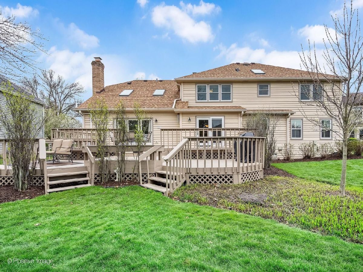 WINDING CREEK GEM! This stunning Georgian home offers exceptional curb appeal, top-rated schools, and an unbeatable location. Meticulously maintained, it welcomes you with a dramatic two-story foyer featuring beautiful stone flooring that flows into the spacious kitchen-the true heart of the home. Enjoy granite countertops, stainless steel appliances, a large center island, and a wine fridge, with an adjacent breakfast room perfect for everyday living or entertaining, offering direct access to the backyard. Step outside to the freshly painted (2026) deck overlooking the scenic neighborhood pond. The main level also features a spacious dining room, formal living room, and a private office with hardwood floors and built-in shelving-ideal for working from home-alongside a convenient half bath. The inviting family room showcases a striking gas fireplace with brick surround, vaulted ceilings, and skylights that fill the space with natural light. Upstairs, the primary suite is a true retreat with a tray ceiling, dual walk-in closets, and a spa-like bath complete with double sinks, soaking tub, separate shower, travertine stone flooring and skylight. Three additional generously sized bedrooms and a full bath with double sinks complete the upper level. The finished basement offers a recreation room with LVP flooring and ample storage. An attached garage features new durable polyaspartic coating flooring. Conveniently located near I-88, I-355, and the Naperville Metra station, with easy access to shopping, dining, parks, nature preserves, and golf courses. See additional information for a full list of updates-this home is a must-see!