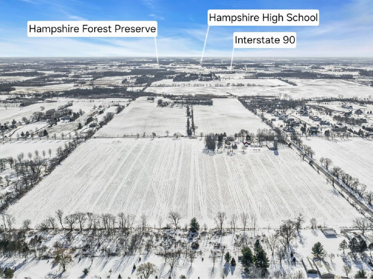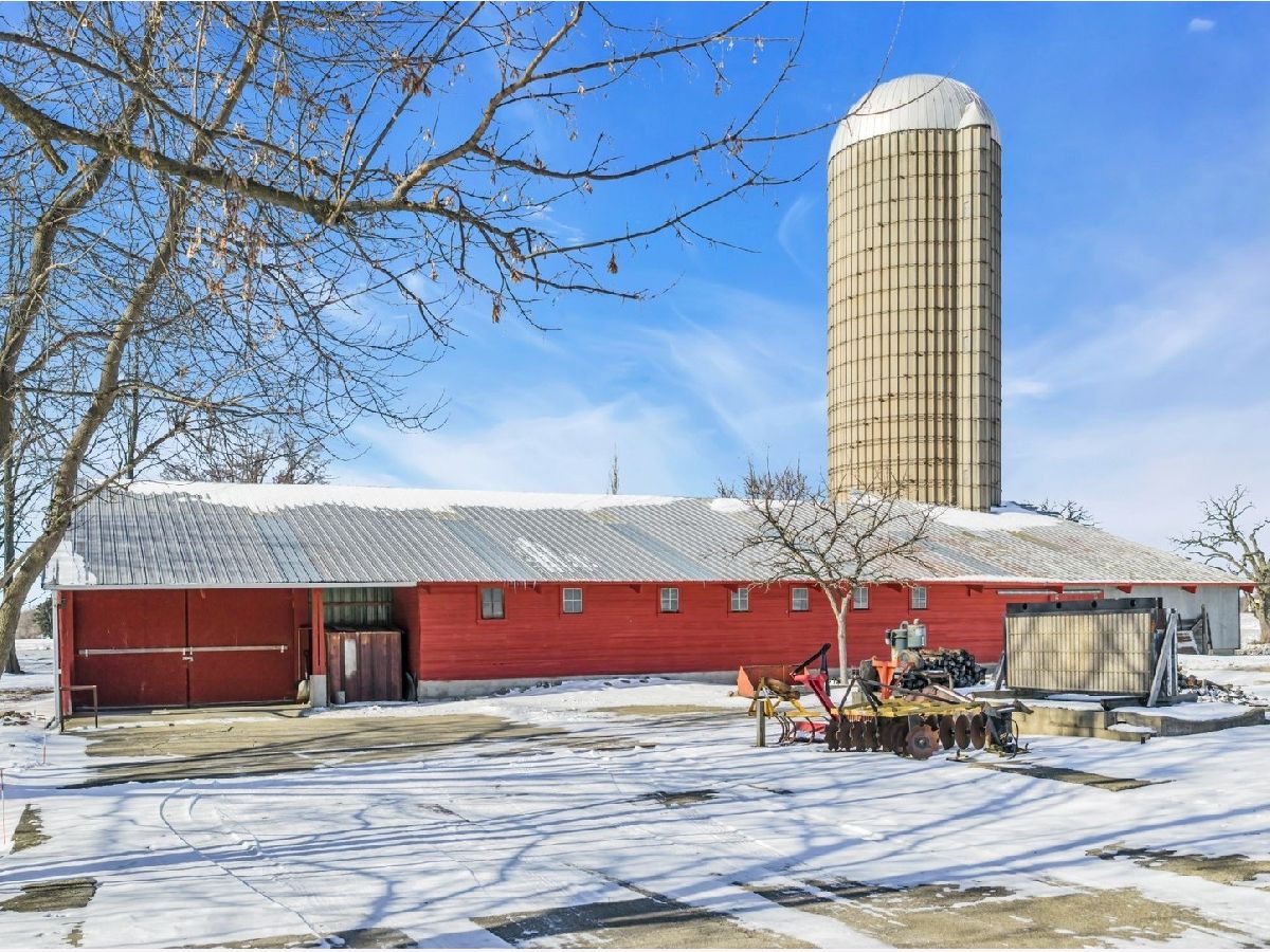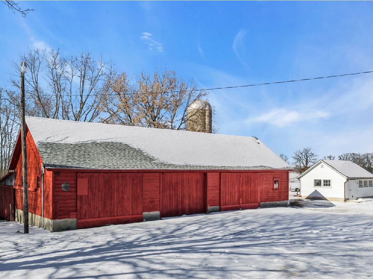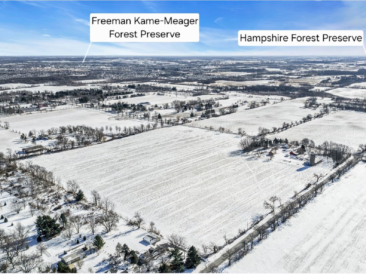 UNBELIEVABLE, PANORAMIC VIEWS OF THE COUNTRYSIDE!! First time offered, a beautiful farmette at the corner of Harmony Rd., and Seeman Road, Huntley, IL, 60142. Wonderful location, in close proximity to I-90. This property is situated on 9.96 acres. The home is well built, with an open kitchen area with loads of cabinets and window exposure, connected to a large recreation/utility area. Great 2 BR, 1 1/2 Bath Ranch home w/ a full basement and a roughed in full bath. The basement has been insulated and has all natural light exposure, exterior entrance, has great potential for a family room, possible bedroom, and a large full bath. This is a very energy efficient home, with electric baseboard heat and wood-burning furnace, which could be converted to gas. The exterior of the home is Aluminum Siding with Anderson windows and a brick patio in back. The front of the home is framed by a boulder hedge and there are other very unique features. There are outbuildings on the property, a 3.5 Car Garage, a Milk House, corn crib, silo, a windmill in need of repair, grain bin, an exceptional open center barn with a concrete floor, and metal roof. That barn is being used as a caretakers shed, and will become available after May 1, 2026. In addition, the 5 acres to the northern edge, contiguous of the property, and next to the barn, will be available for purchase for $150,000, should the buyer desire additional land. Please note that the taxes reflect a 40 acre parcel and will be revised. NOTE: No appliances are included. Property is Zoned Estate (E-2) Horses allowed!