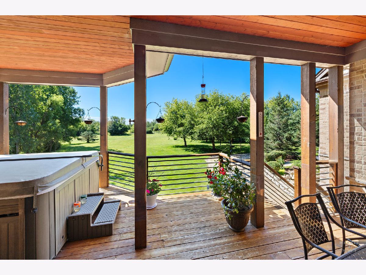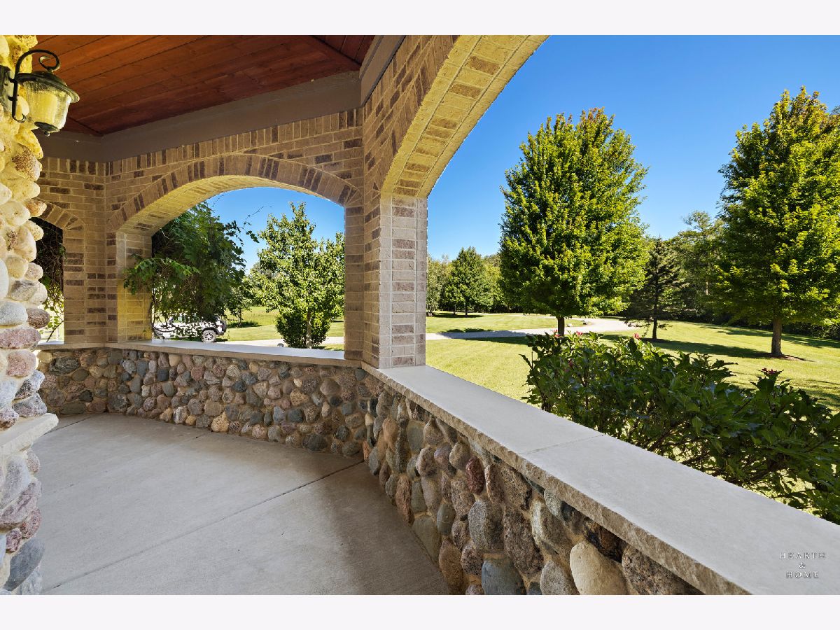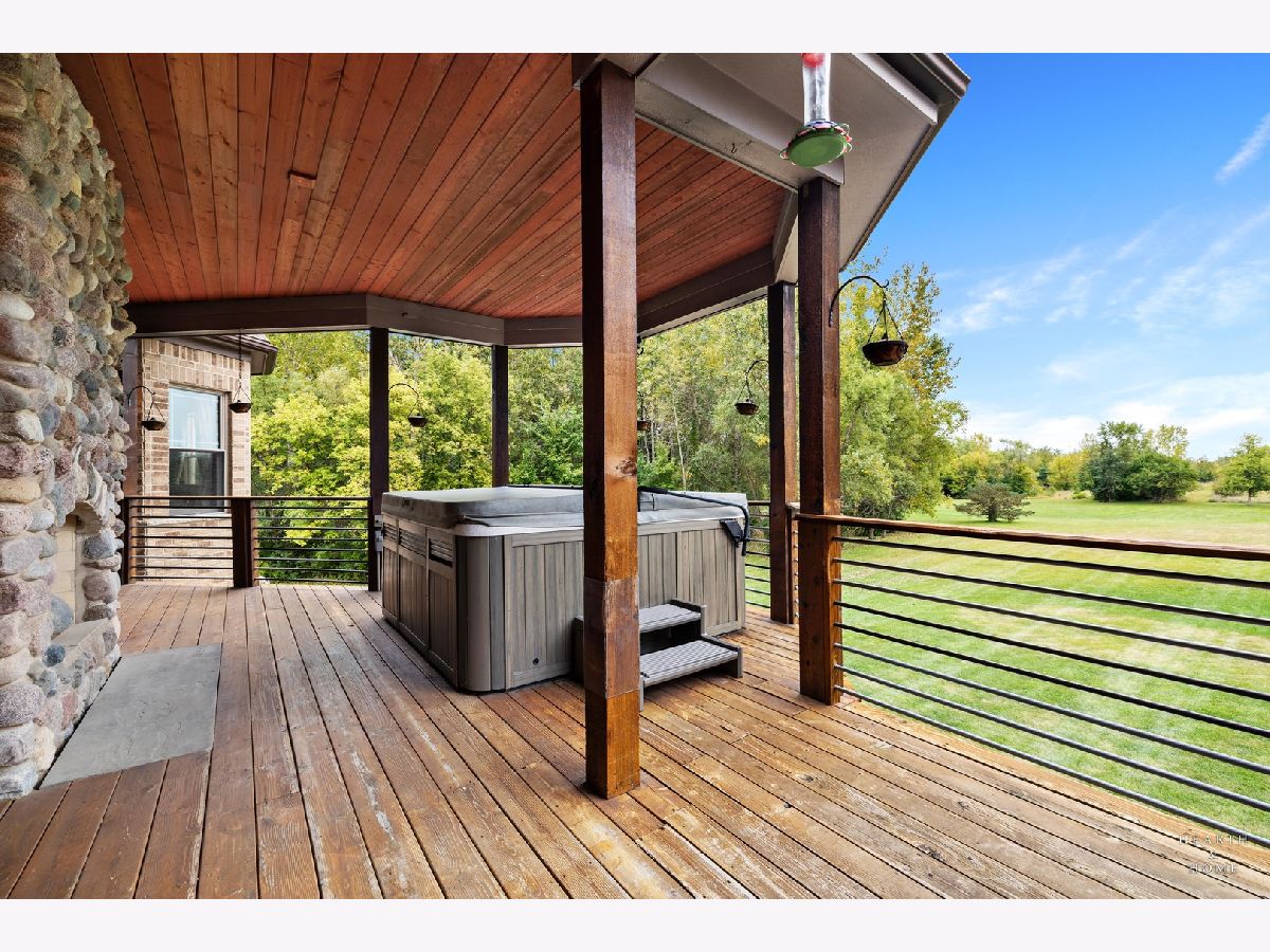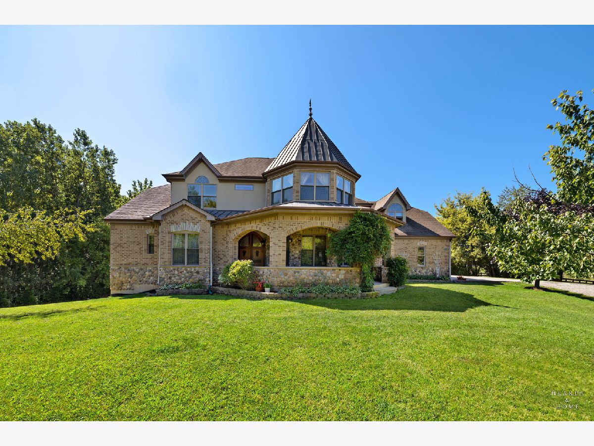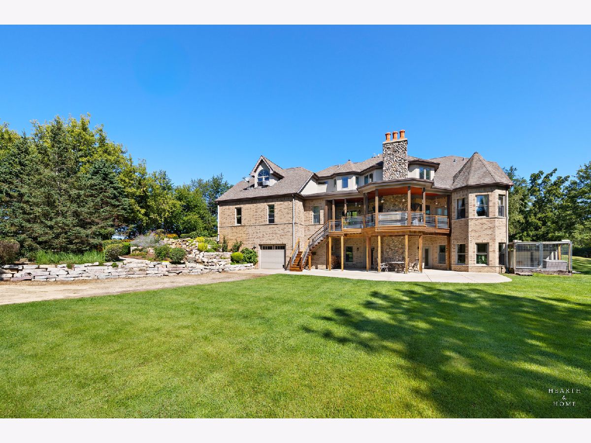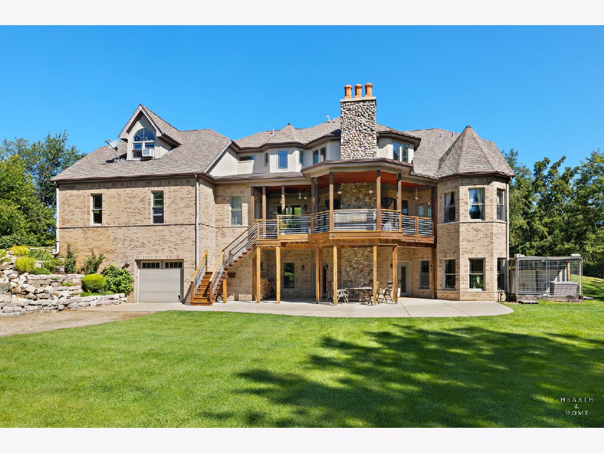 Immaculate 5 bedroom home featuring high-end finishes throughout the great open floor plan and full finished walkout basement situated on nearly 12 acres of beautifully maintained grounds with sweeping views. The grand entryway is highlighted by a spacious wrap-around brick and stone porch, and custom curved French wooden doors with brass knockers. Gleaming hardwood flooring with inlays and a curved staircase with iron spindles and wood railing greet you and welcome you into the 2-story family room with gas start fireplace and the expertly designed chef's kitchen. This impressive space features a copper island with sink and storage, dual oven, huge refrigerator, high-end oven and copper hood, finished off with a tin backsplash. The family room offers access to a deck with stunning views, a hot tub for added relaxation, and an outdoor fireplace. Back inside you have the option of a convenient breakfast nook or formal dining room to entertain guests. The main level also includes a home office and mud room, plus the vaulted primary bedroom with en-suite bathroom and 2 walk-in closets. On the massive lower level there is plenty of room for residents and guests alike - including a large rec room, game room, play room, and sunroom, in addition to extra storage space, a workshop, and walk-out to tons of outdoor space to play and relax. The large patio is surrounded by terraced landscaping and a water feature. The second level offers a spacious loft overlooking the family room, three bedrooms - 2 of which offer walk-in closets, and an inviting media room currently designed for serious music listening. With a country estate feel, you're still nearby to the historic downtown Woodstock square, shopping, dining, and the Metra train. This one-of-a-kind home is ready and waiting for its new owners! Please see Additional docs for list of Features!