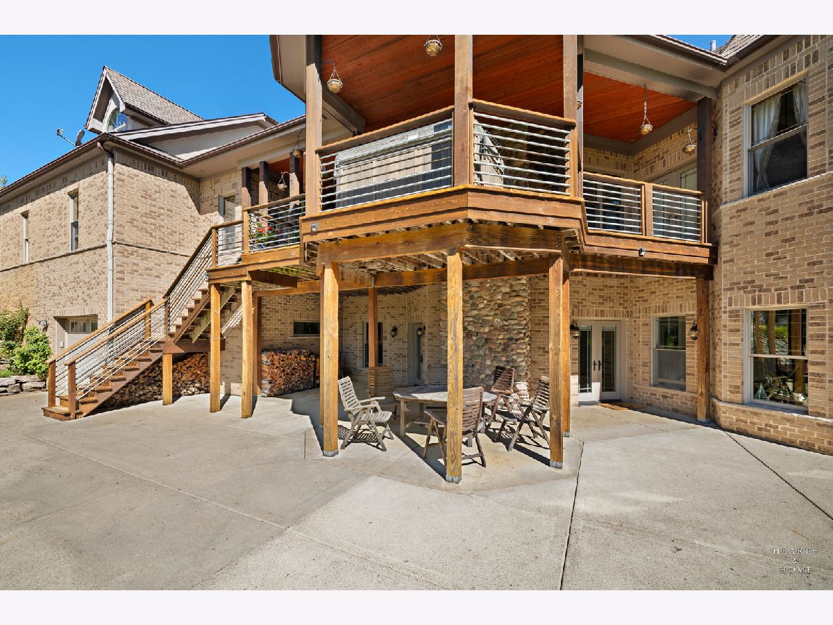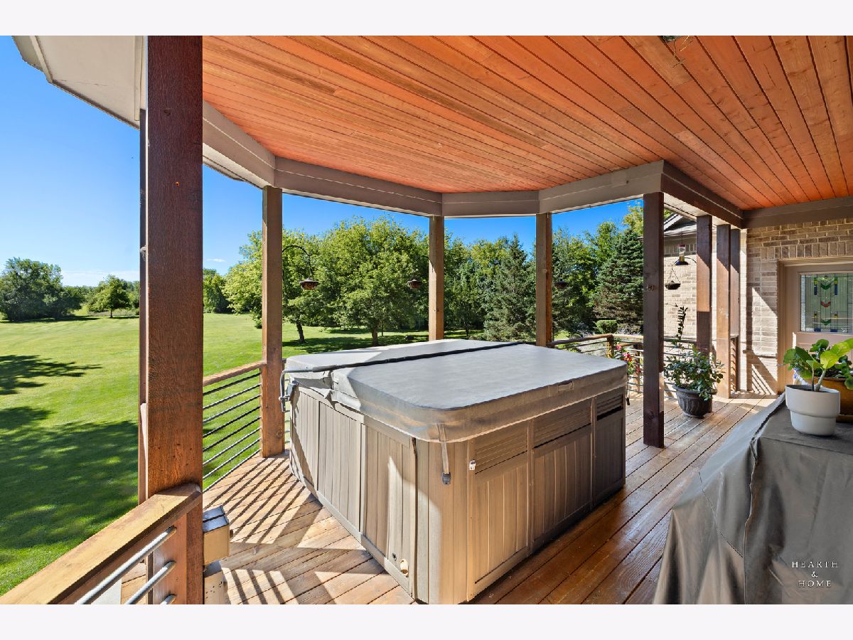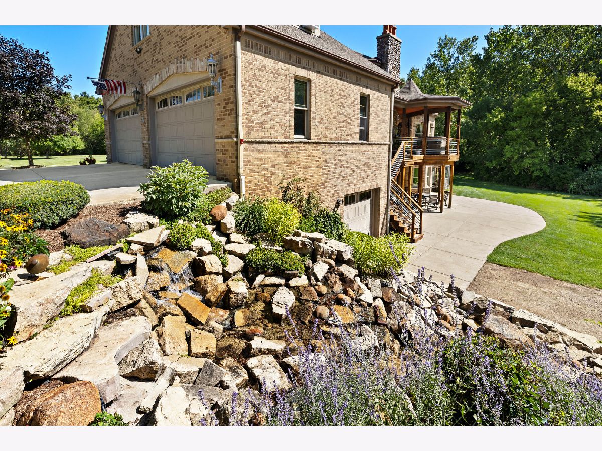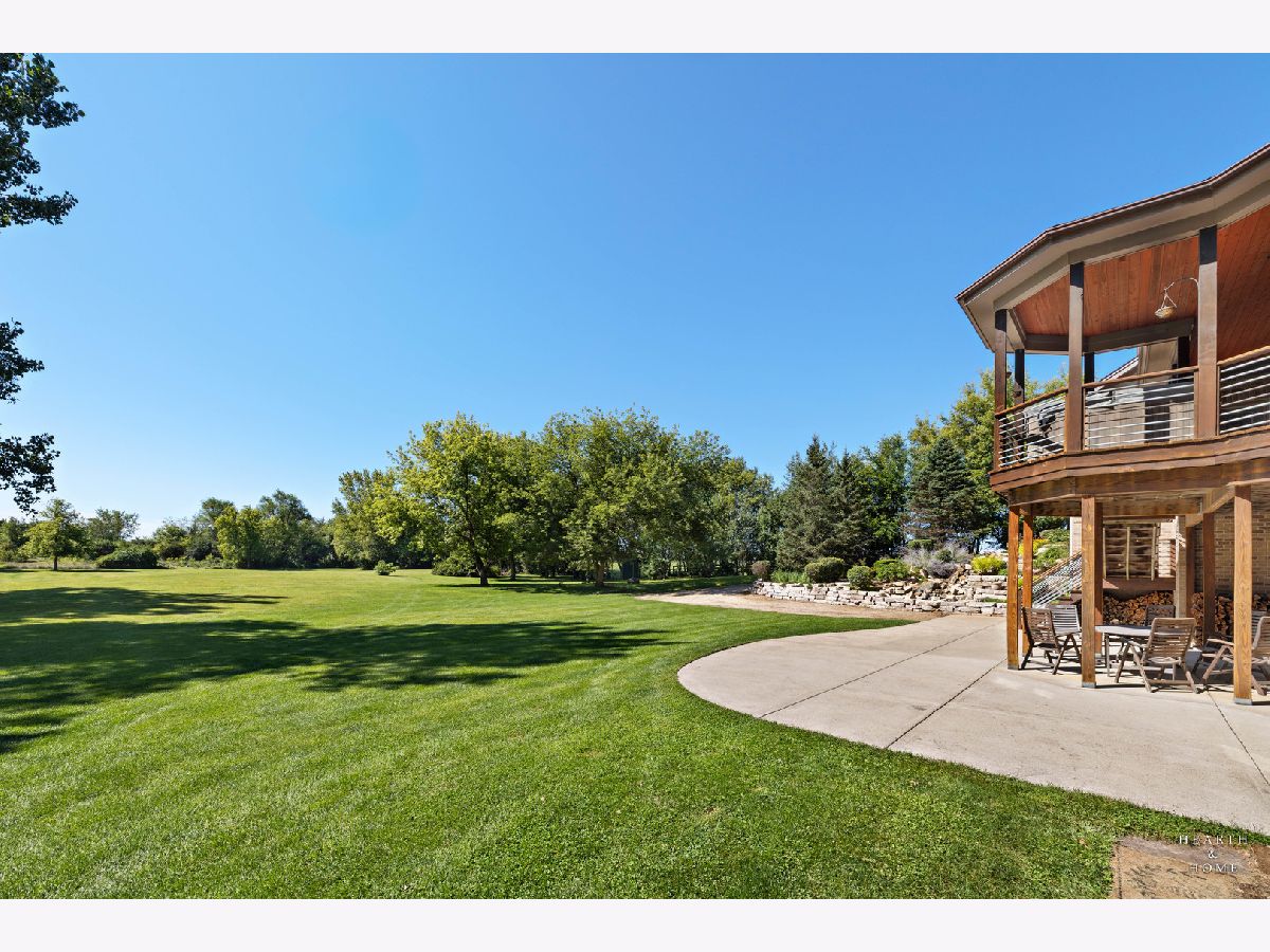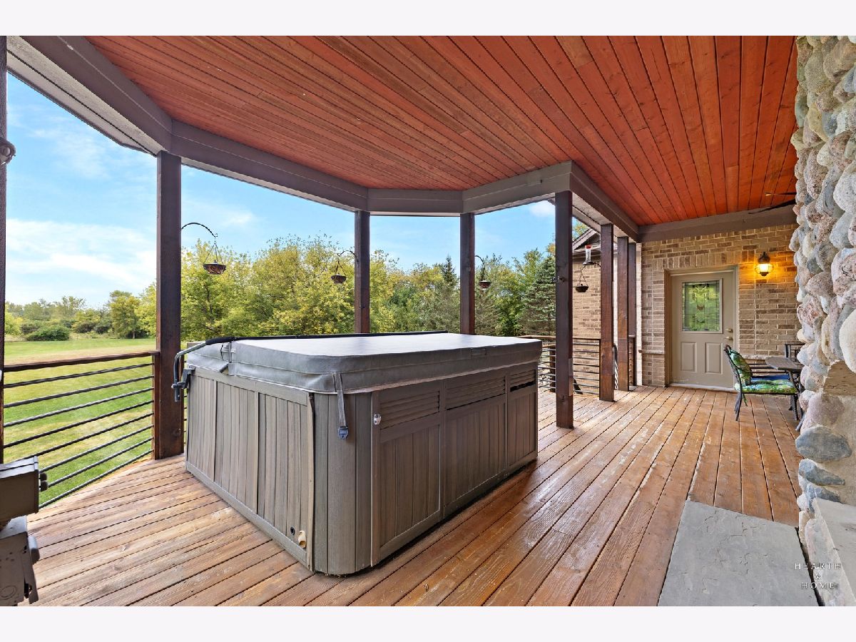 Immaculate 5 bedroom home featuring high-end finishes throughout the great open floor plan and full finished walkout basement situated on nearly 12 acres of beautifully maintained grounds with sweeping views. The grand entryway is highlighted by a spacious wrap-around brick and stone porch, and custom curved French wooden doors with brass knockers. Gleaming hardwood flooring with inlays and a curved staircase with iron spindles and wood railing greet you and welcome you into the 2-story family room with gas start fireplace and the expertly designed chef's kitchen. This impressive space features a copper island with sink and storage, dual oven, huge refrigerator, high-end oven and copper hood, finished off with a tin backsplash. The family room offers access to a deck with stunning views, a hot tub for added relaxation, and an outdoor fireplace. Back inside you have the option of a convenient breakfast nook or formal dining room to entertain guests. The main level also includes a home office and mud room, plus the vaulted primary bedroom with en-suite bathroom and 2 walk-in closets. On the massive lower level there is plenty of room for residents and guests alike - including a large rec room, game room, play room, and sunroom, in addition to extra storage space, a workshop, and walk-out to tons of outdoor space to play and relax. The large patio is surrounded by terraced landscaping and a water feature. The second level offers a spacious loft overlooking the family room, three bedrooms - 2 of which offer walk-in closets, and an inviting media room currently designed for serious music listening. With a country estate feel, you're still nearby to the historic downtown Woodstock square, shopping, dining, and the Metra train. This one-of-a-kind home is ready and waiting for its new owners! Please see Additional docs for list of Features!