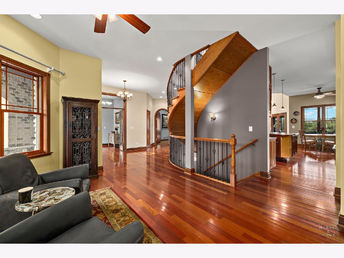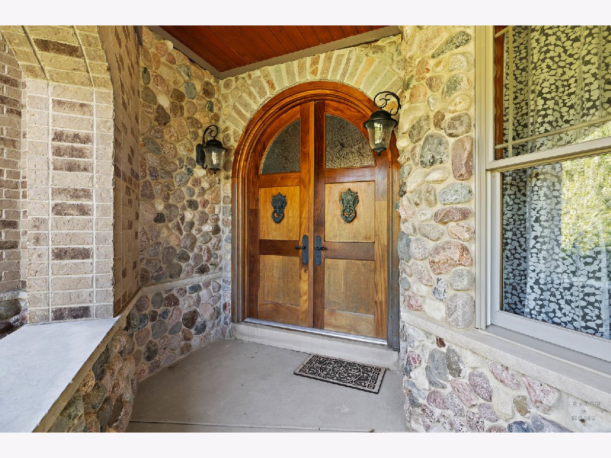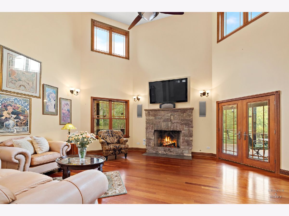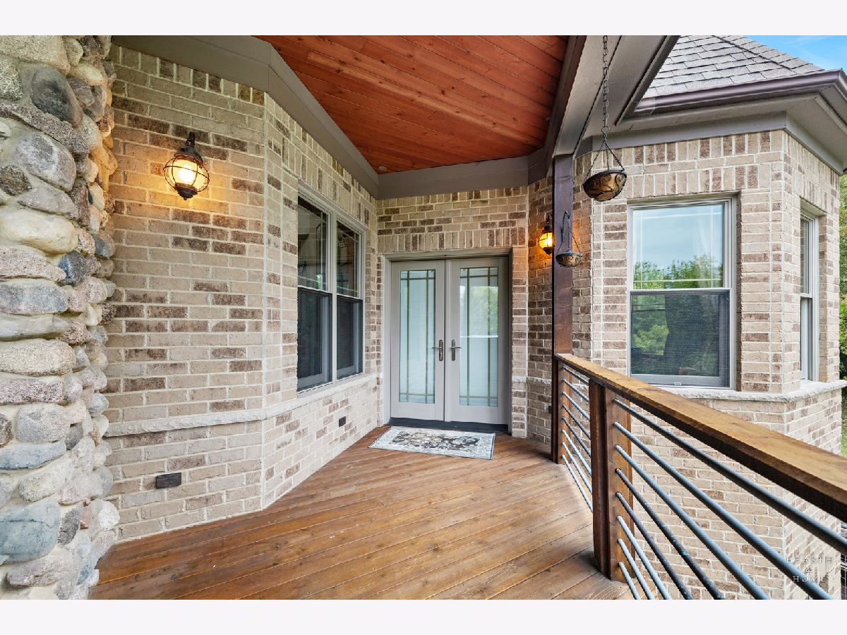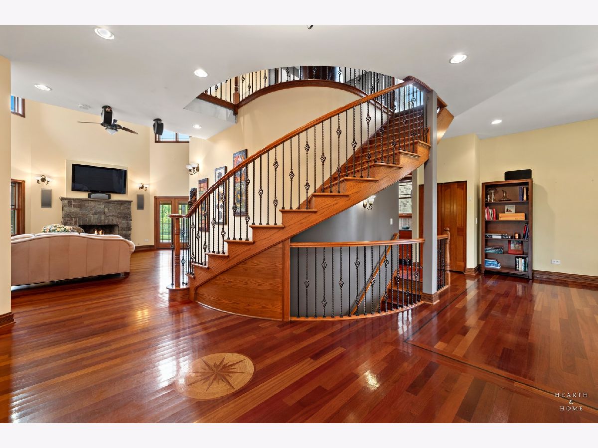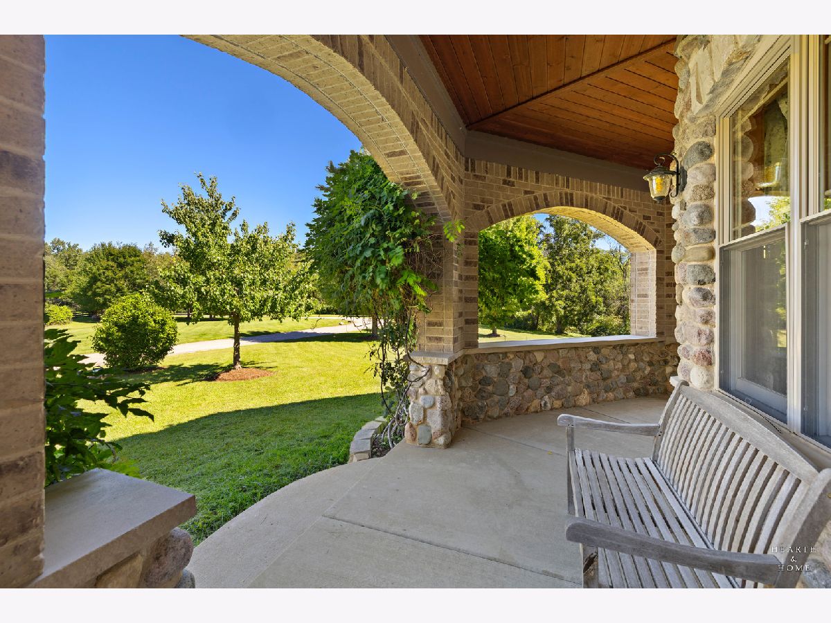 Immaculate 5 bedroom home featuring high-end finishes throughout the great open floor plan and full finished walkout basement situated on nearly 12 acres of beautifully maintained grounds with sweeping views. The grand entryway is highlighted by a spacious wrap-around brick and stone porch, and custom curved French wooden doors with brass knockers. Gleaming hardwood flooring with inlays and a curved staircase with iron spindles and wood railing greet you and welcome you into the 2-story family room with gas start fireplace and the expertly designed chef's kitchen. This impressive space features a copper island with sink and storage, dual oven, huge refrigerator, high-end oven and copper hood, finished off with a tin backsplash. The family room offers access to a deck with stunning views, a hot tub for added relaxation, and an outdoor fireplace. Back inside you have the option of a convenient breakfast nook or formal dining room to entertain guests. The main level also includes a home office and mud room, plus the vaulted primary bedroom with en-suite bathroom and 2 walk-in closets. On the massive lower level there is plenty of room for residents and guests alike - including a large rec room, game room, play room, and sunroom, in addition to extra storage space, a workshop, and walk-out to tons of outdoor space to play and relax. The large patio is surrounded by terraced landscaping and a water feature. The second level offers a spacious loft overlooking the family room, three bedrooms - 2 of which offer walk-in closets, and an inviting media room currently designed for serious music listening. With a country estate feel, you're still nearby to the historic downtown Woodstock square, shopping, dining, and the Metra train. This one-of-a-kind home is ready and waiting for its new owners! Please see Additional docs for list of Features!
