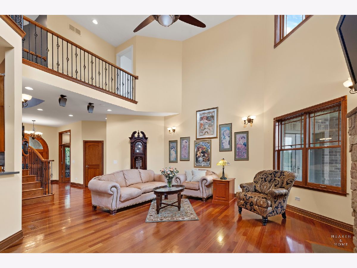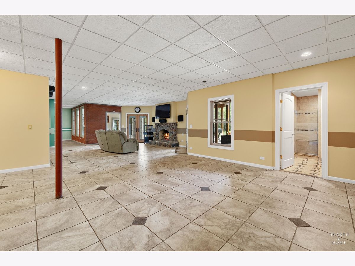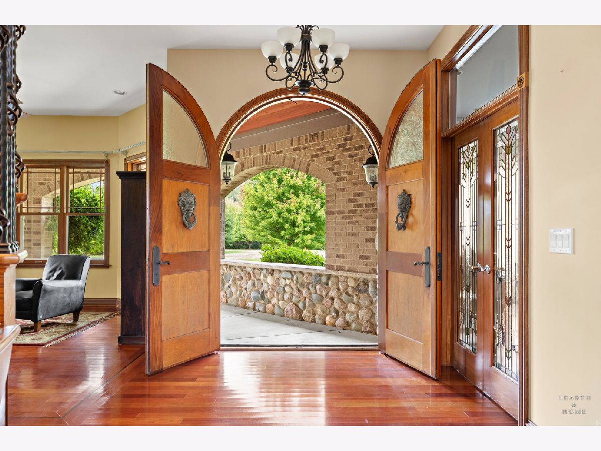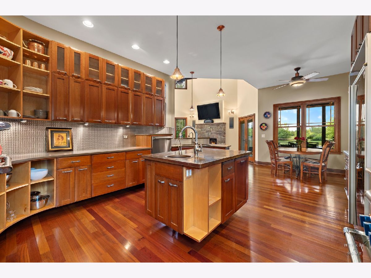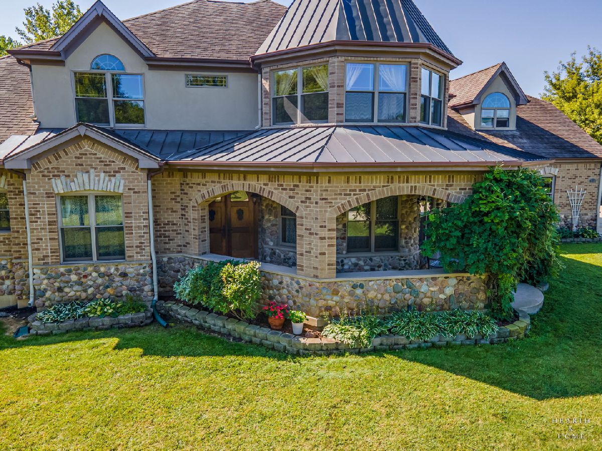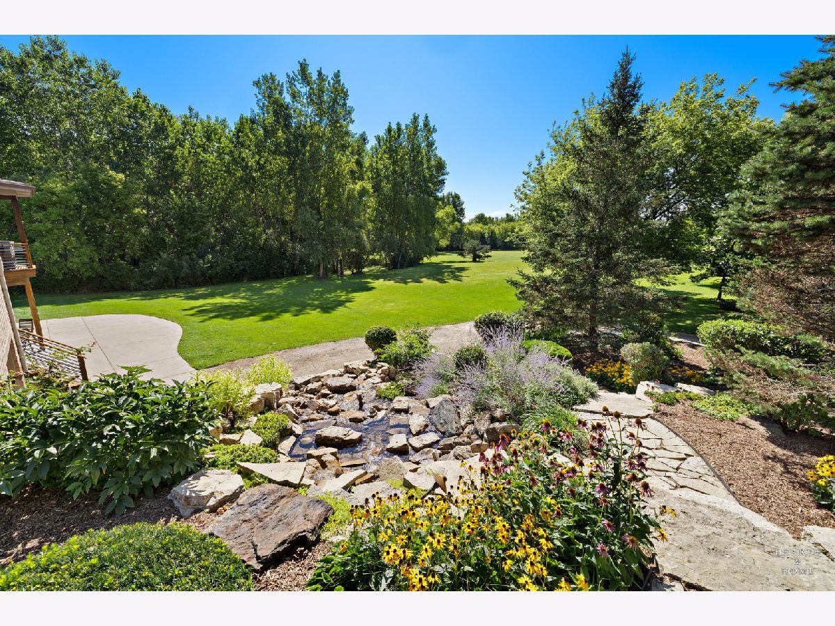 Immaculate 5 bedroom home featuring high-end finishes throughout the great open floor plan and full finished walkout basement situated on nearly 12 acres of beautifully maintained grounds with sweeping views. The grand entryway is highlighted by a spacious wrap-around brick and stone porch, and custom curved French wooden doors with brass knockers. Gleaming hardwood flooring with inlays and a curved staircase with iron spindles and wood railing greet you and welcome you into the 2-story family room with gas start fireplace and the expertly designed chef's kitchen. This impressive space features a copper island with sink and storage, dual oven, huge refrigerator, high-end oven and copper hood, finished off with a tin backsplash. The family room offers access to a deck with stunning views, a hot tub for added relaxation, and an outdoor fireplace. Back inside you have the option of a convenient breakfast nook or formal dining room to entertain guests. The main level also includes a home office and mud room, plus the vaulted primary bedroom with en-suite bathroom and 2 walk-in closets. On the massive lower level there is plenty of room for residents and guests alike - including a large rec room, game room, play room, and sunroom, in addition to extra storage space, a workshop, and walk-out to tons of outdoor space to play and relax. The large patio is surrounded by terraced landscaping and a water feature. The second level offers a spacious loft overlooking the family room, three bedrooms - 2 of which offer walk-in closets, and an inviting media room currently designed for serious music listening. With a country estate feel, you're still nearby to the historic downtown Woodstock square, shopping, dining, and the Metra train. This one-of-a-kind home is ready and waiting for its new owners! Please see Additional docs for list of Features!