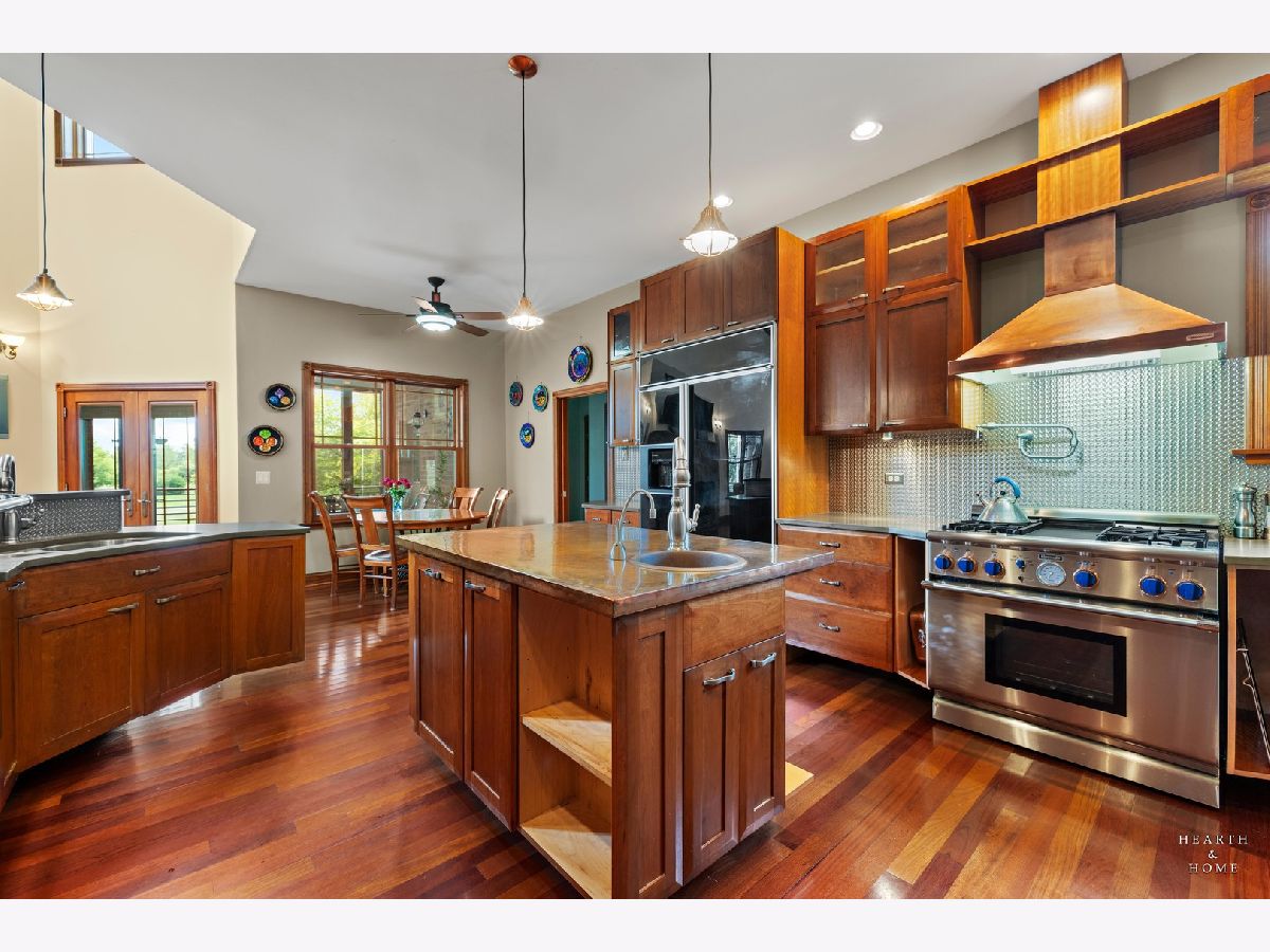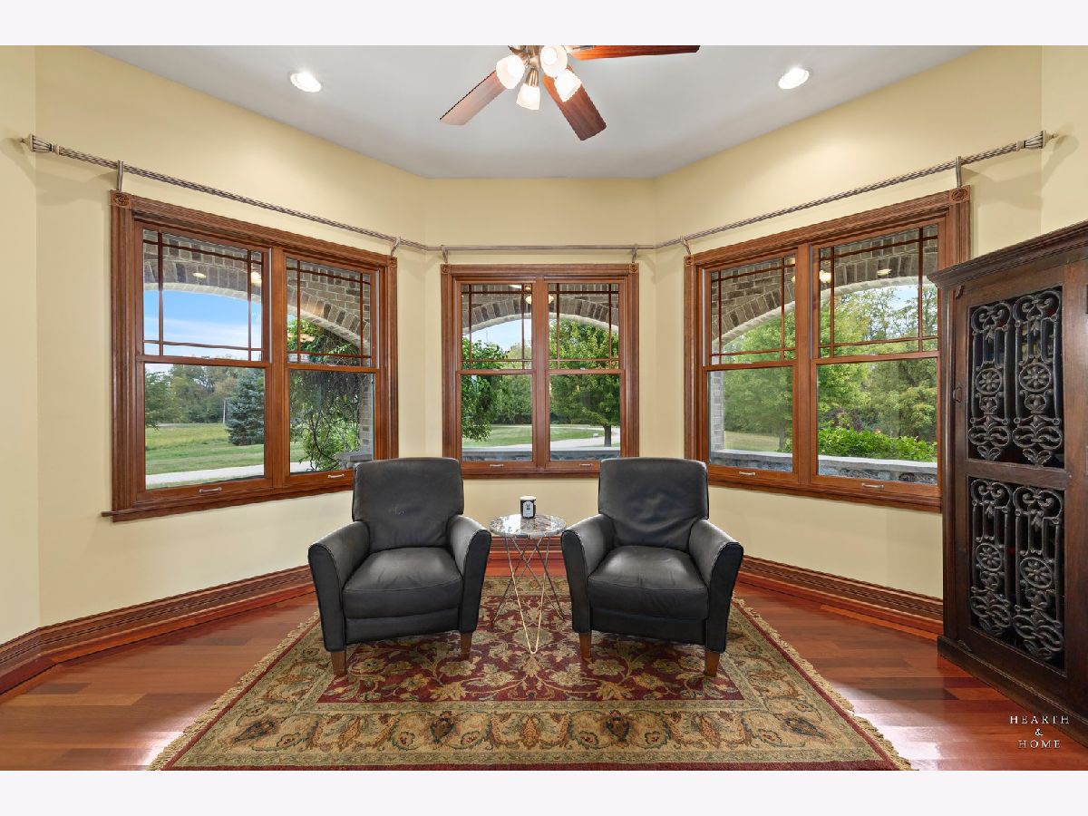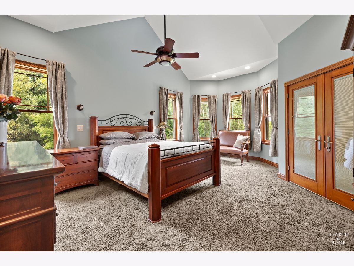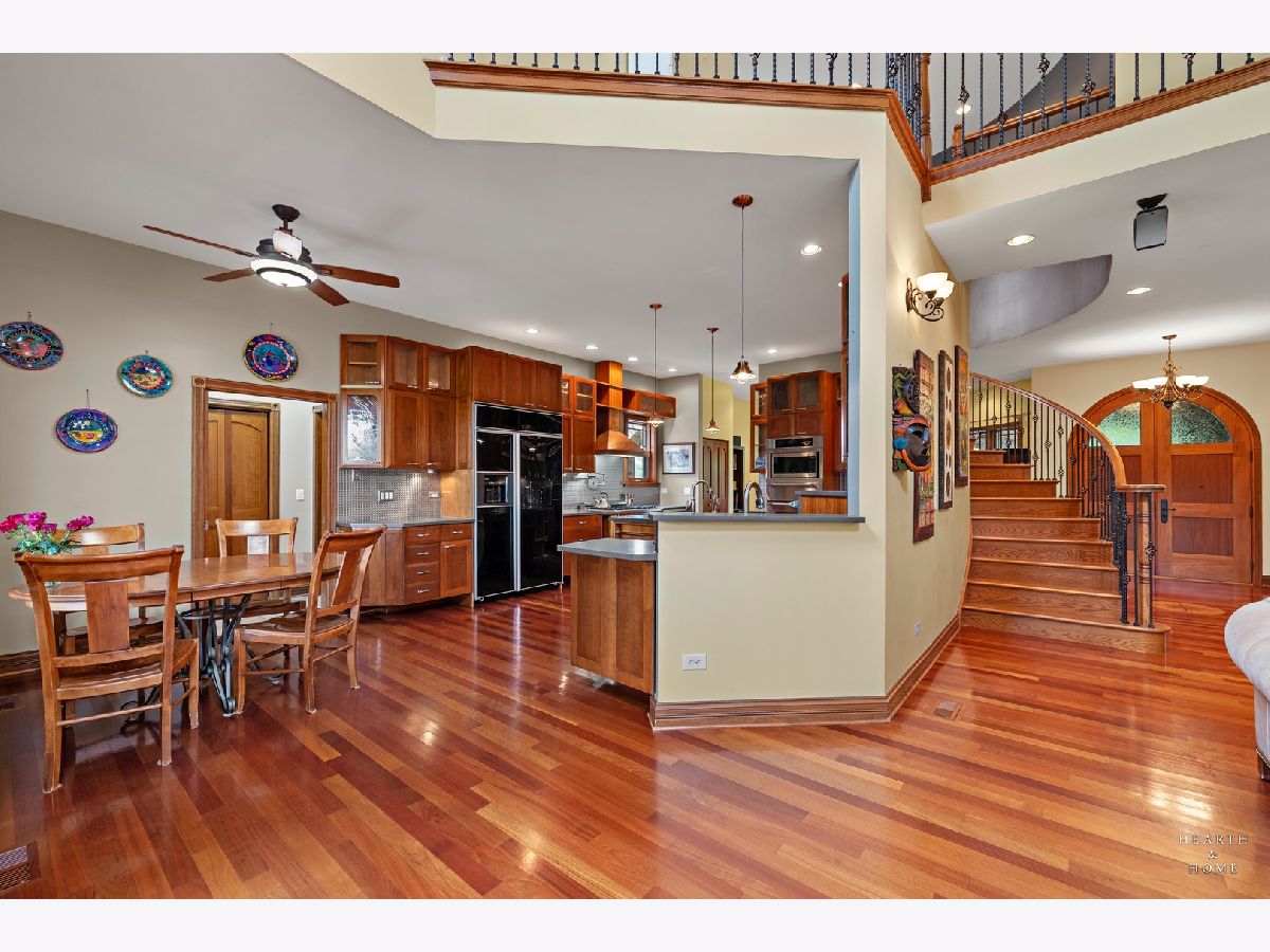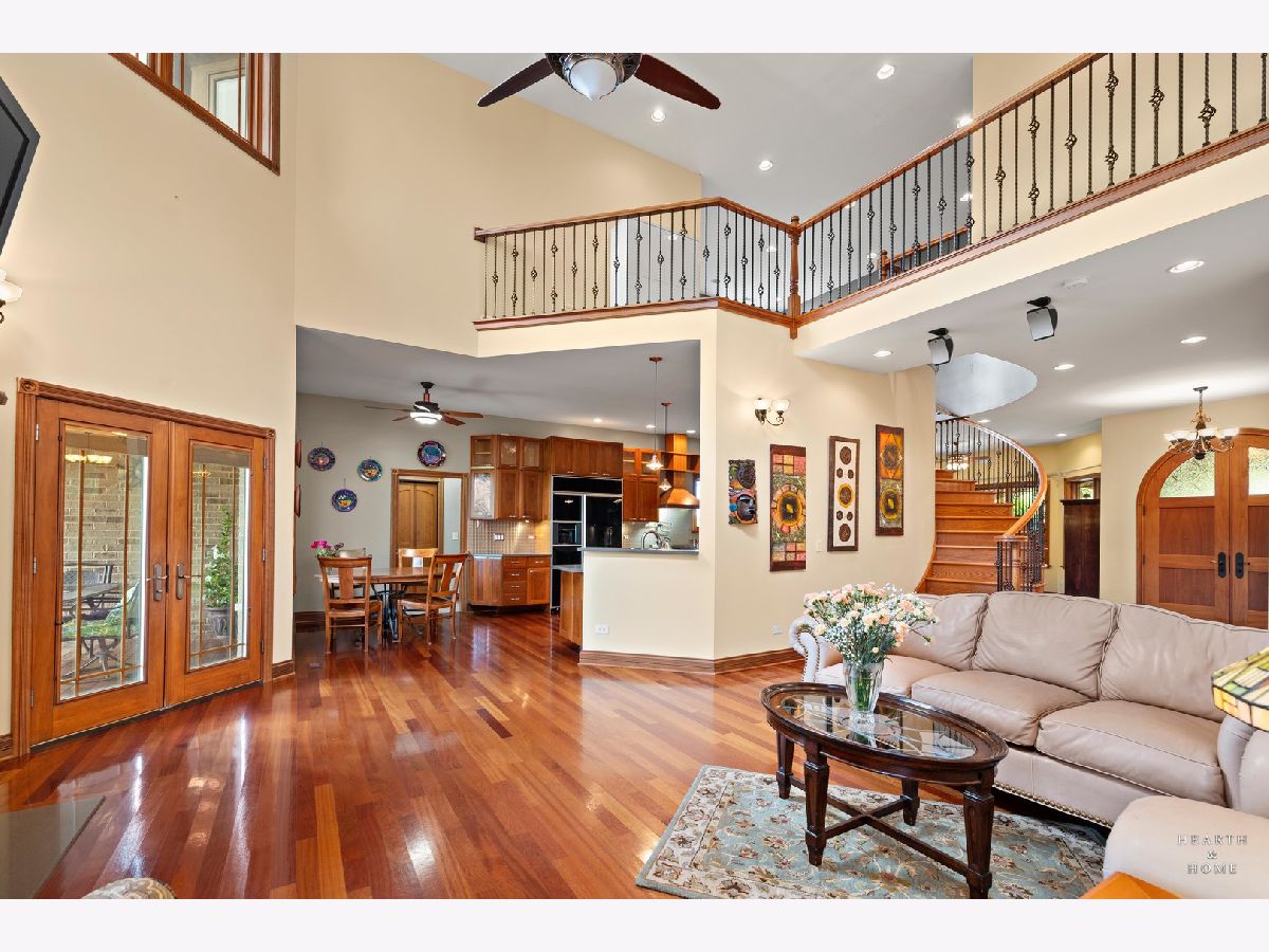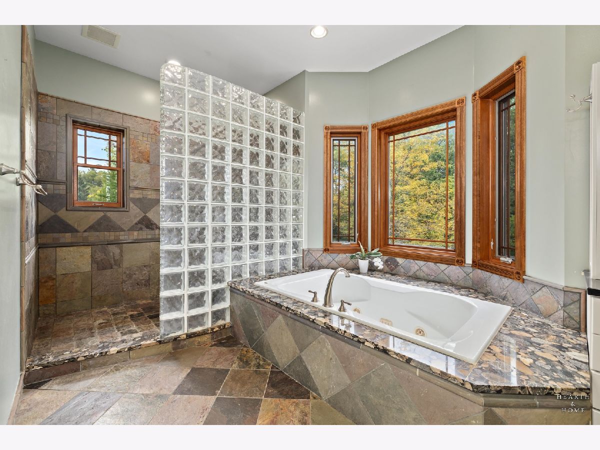 Immaculate 5 bedroom home featuring high-end finishes throughout the great open floor plan and full finished walkout basement situated on nearly 12 acres of beautifully maintained grounds with sweeping views. The grand entryway is highlighted by a spacious wrap-around brick and stone porch, and custom curved French wooden doors with brass knockers. Gleaming hardwood flooring with inlays and a curved staircase with iron spindles and wood railing greet you and welcome you into the 2-story family room with gas start fireplace and the expertly designed chef's kitchen. This impressive space features a copper island with sink and storage, dual oven, huge refrigerator, high-end oven and copper hood, finished off with a tin backsplash. The family room offers access to a deck with stunning views, a hot tub for added relaxation, and an outdoor fireplace. Back inside you have the option of a convenient breakfast nook or formal dining room to entertain guests. The main level also includes a home office and mud room, plus the vaulted primary bedroom with en-suite bathroom and 2 walk-in closets. On the massive lower level there is plenty of room for residents and guests alike - including a large rec room, game room, play room, and sunroom, in addition to extra storage space, a workshop, and walk-out to tons of outdoor space to play and relax. The large patio is surrounded by terraced landscaping and a water feature. The second level offers a spacious loft overlooking the family room, three bedrooms - 2 of which offer walk-in closets, and an inviting media room currently designed for serious music listening. With a country estate feel, you're still nearby to the historic downtown Woodstock square, shopping, dining, and the Metra train. This one-of-a-kind home is ready and waiting for its new owners! Please see Additional docs for list of Features!