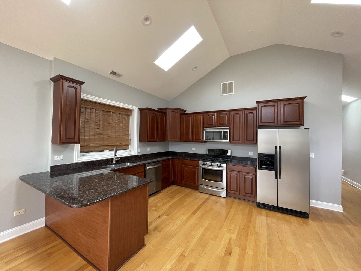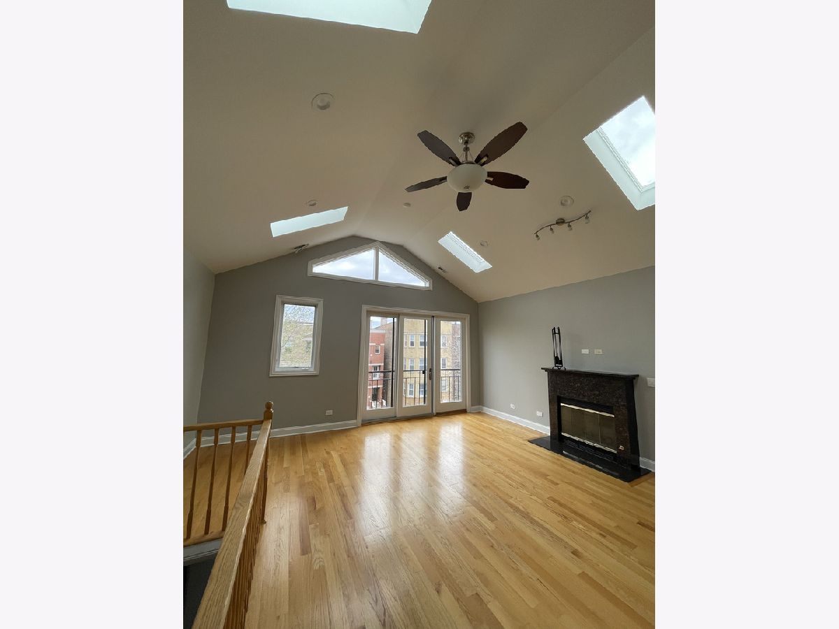 Beautiful, modern top-floor condo in an intimate 3-unit building! This bright and airy home features hardwood floors throughout, soaring cathedral ceilings, and skylights that flood the space with natural light all day. The spacious kitchen offers ample cabinet and counter space, perfect for cooking and entertaining. Enjoy the convenience of in-unit washer and dryer, along with central heat and air. Good sized bedrooms include a primary suite with a private en-suite bathroom. Step outside to a rear deck, ideal for relaxing or entertaining. One parking space is included, and assessments are low.Located in Humboldt Park, just west of Bucktown and Wicker Park, this home offers easy access to the Chicago Blue Line, public transportation, cafes, restaurants, and everything the neighborhood has to offer.