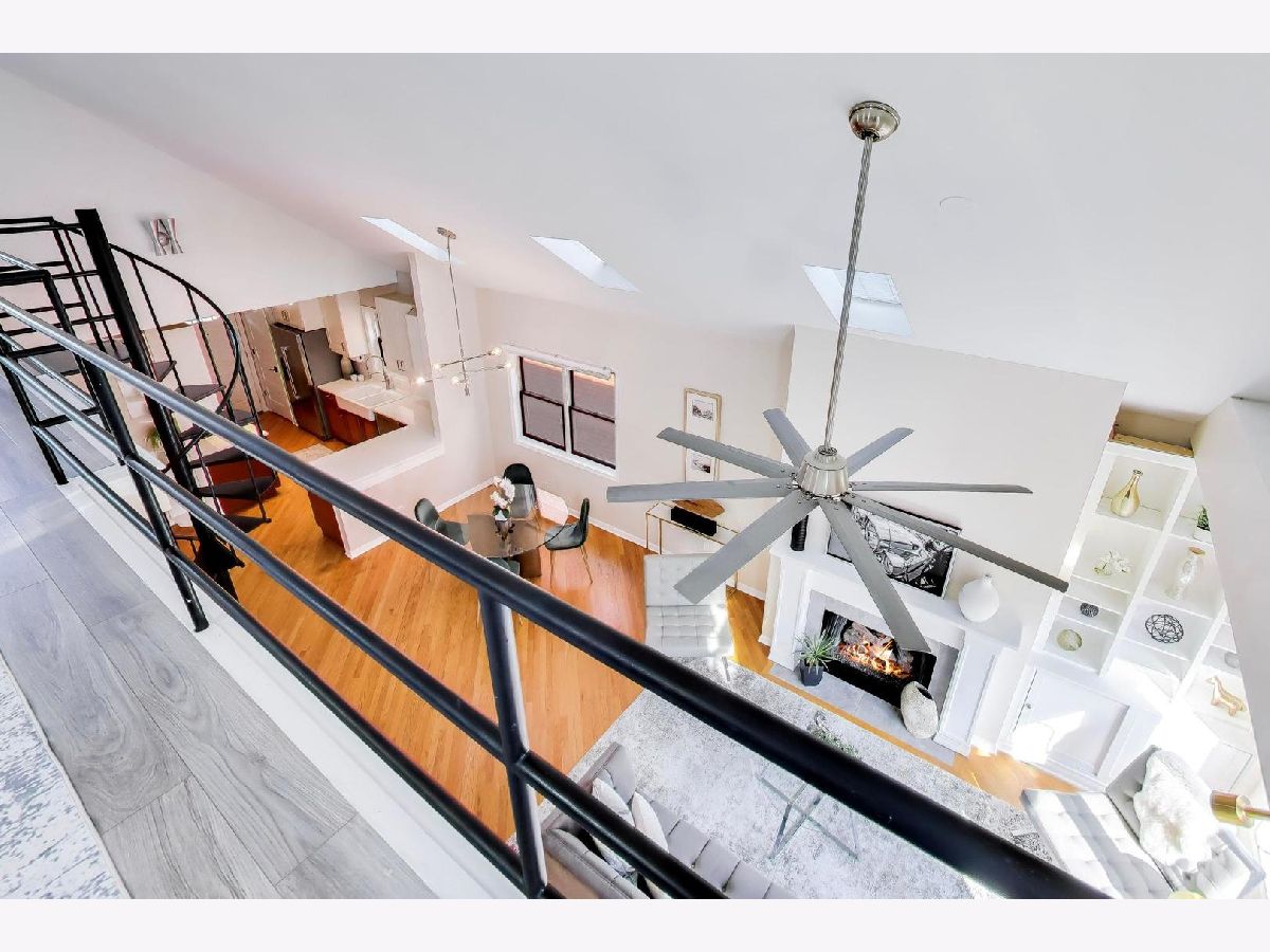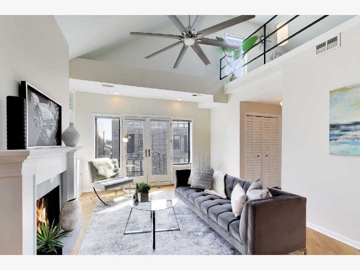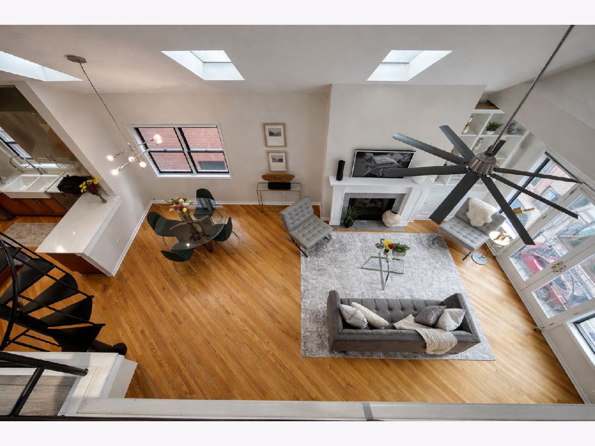 Presenting a Stunning Sun drenched lofted 2BR/2BTH Penthouse located in Noble Square on the cusp of trendy West Town that checks all your boxes! 2 Decks a spectacular roof deck + massive deck on the main floor soaring Cathedral ceilings 5 skylights Fireplace Juliet Balcony with modern timeless upgrades through out ALL THIS & Parking included! Approx 2000 sq ft this lovely home welcomes you in through an inviting foyer into a brilliantly sunlit 25 ft Living room/Dining anchored by a wood burning Fireplace with beautiful white built ins & a lovey Juliet Balcony. The open Chefs Kitchen features white Quartz counter tops white ceramic tile backsplash large white "farmers' sink with commercial grade faucet dual colour Cabinets are upper white lower feint cherry SS appliances a Pantry & bright East facing window. Entertain your guests on the 1st deck via the kitchen built with a large Privacy wall is perfect for summer BBQ's . A spacious Primary suite is located on the main floor and offers a large organized WIK sliding doors to the main deck. The spa inspired ensuite Primary bathroom is decked with all the bells & whistles a heating rack for your towels a spectacular walk in shower with frameless glass door has multiple jets centre rain shower and hand held shower. Dual sinks with marble tops and an extra cabinet for storage and heated floors make this the perfect zen escape! The 2nd bedroom suite has a sizable walk in closet and is framed by a picture window. The 2nd full bathroom features a handsome Navy Blue quartz topped vanity with storage and a Tub /Shower combination. The main floor also houses the laundry room has extra cabinets and is cleverly hidden by a sliding barn door. The AWESOME loft space is multi functional use for WFH office Family room Work out room has a wet bar and Refrigerator for all your entertaining needs leads to the most AMAZING ROOF DECK with built in seating around a FIRE PIT & shaded by a stunning Pergola a large area with ASTRO TURF has multiple uses for SUMMER FUN!! LOW HOA Garage Parking Pets welcome. Walking distance to Beatniks Carbon Hiro Izakaya & the best fresh cooked Pies at Hoosier Mama. Welcome Home!!